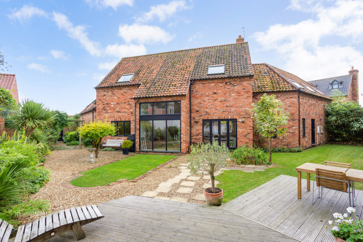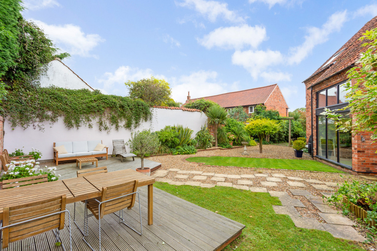 The easily maintained, private rear garden serves as a tranquil outdoor space, enclosed by a walled boundary. A strategically positioned deck captures the morning and afternoon sunlight. The garden features two lawn areas and borders abundant with mature evergreens, perennials, and seasonal plantings, with a block-paved path along the side of the property leading to both the utility room and a side gate onto Church Lane.