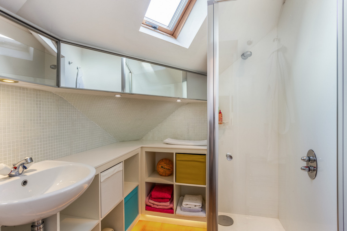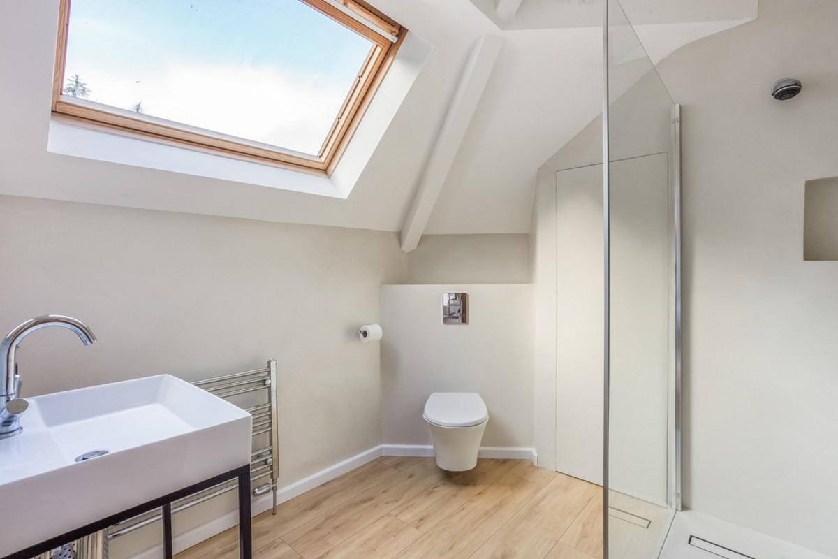 To the left of the landing are two double bedrooms with vaulted ceilings, one of which includes an en-suite shower room fitted with a large corner shower, a surface-mounted washbasin, a chrome heated towel rail, and open storage shelves.