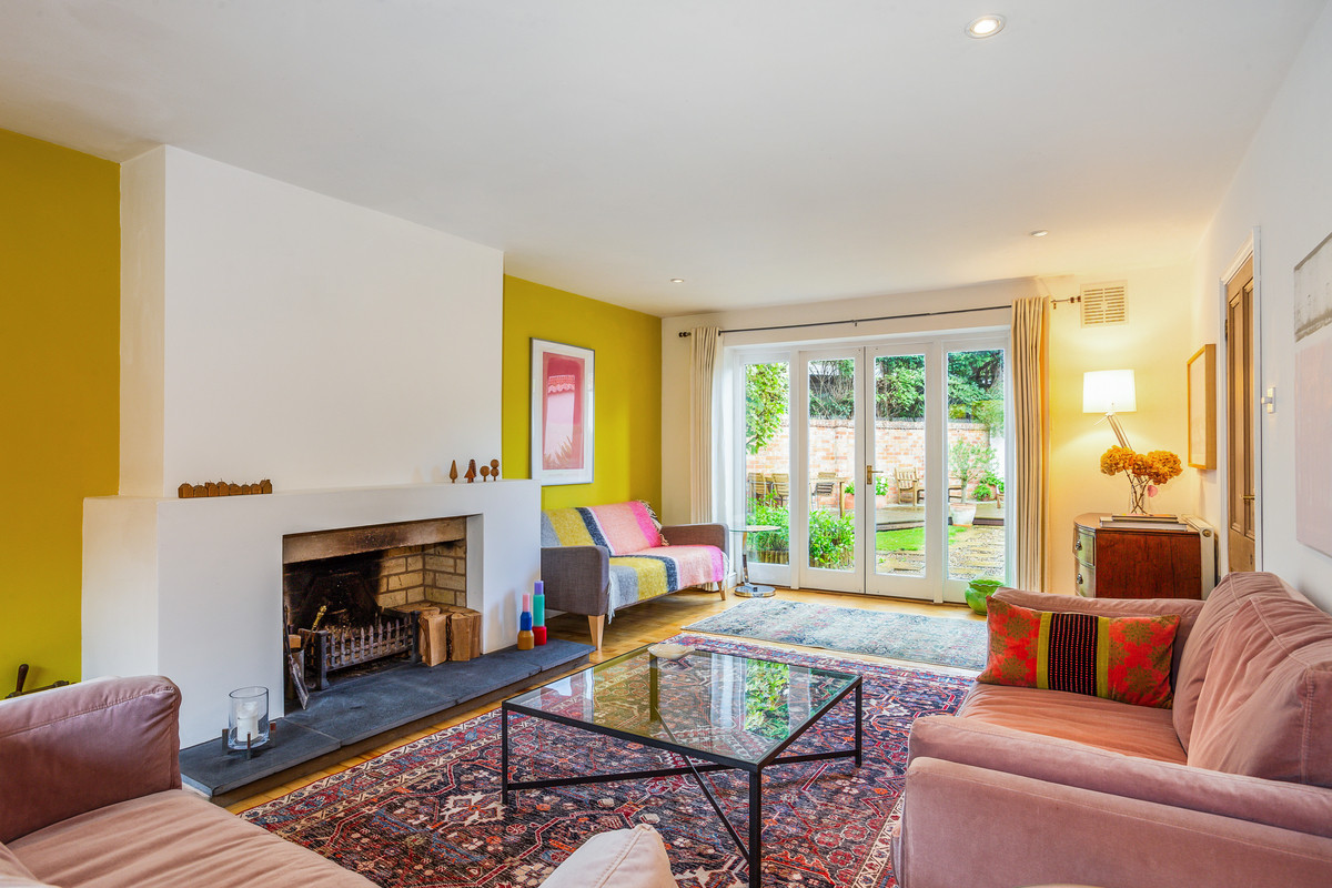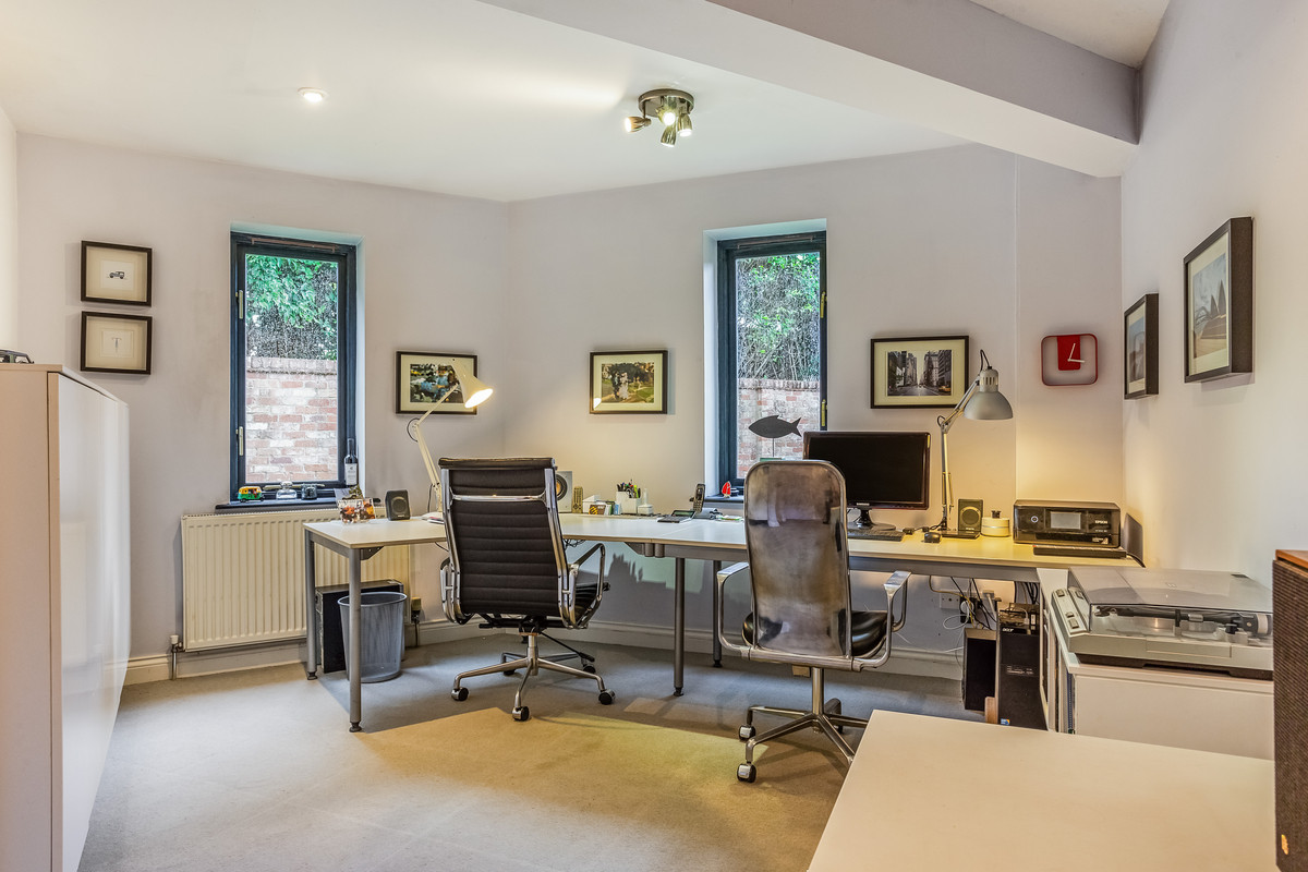 To the left of the entrance hall, a substantial, full-depth living room showcases parquet flooring, dual-aspect views, and French doors leading to the garden. A central fireplace with an open hearth serves as a focal point. From the living room, a doorway provides access to a versatile room, currently functioning as an office, which also connects to the integrated double garage.