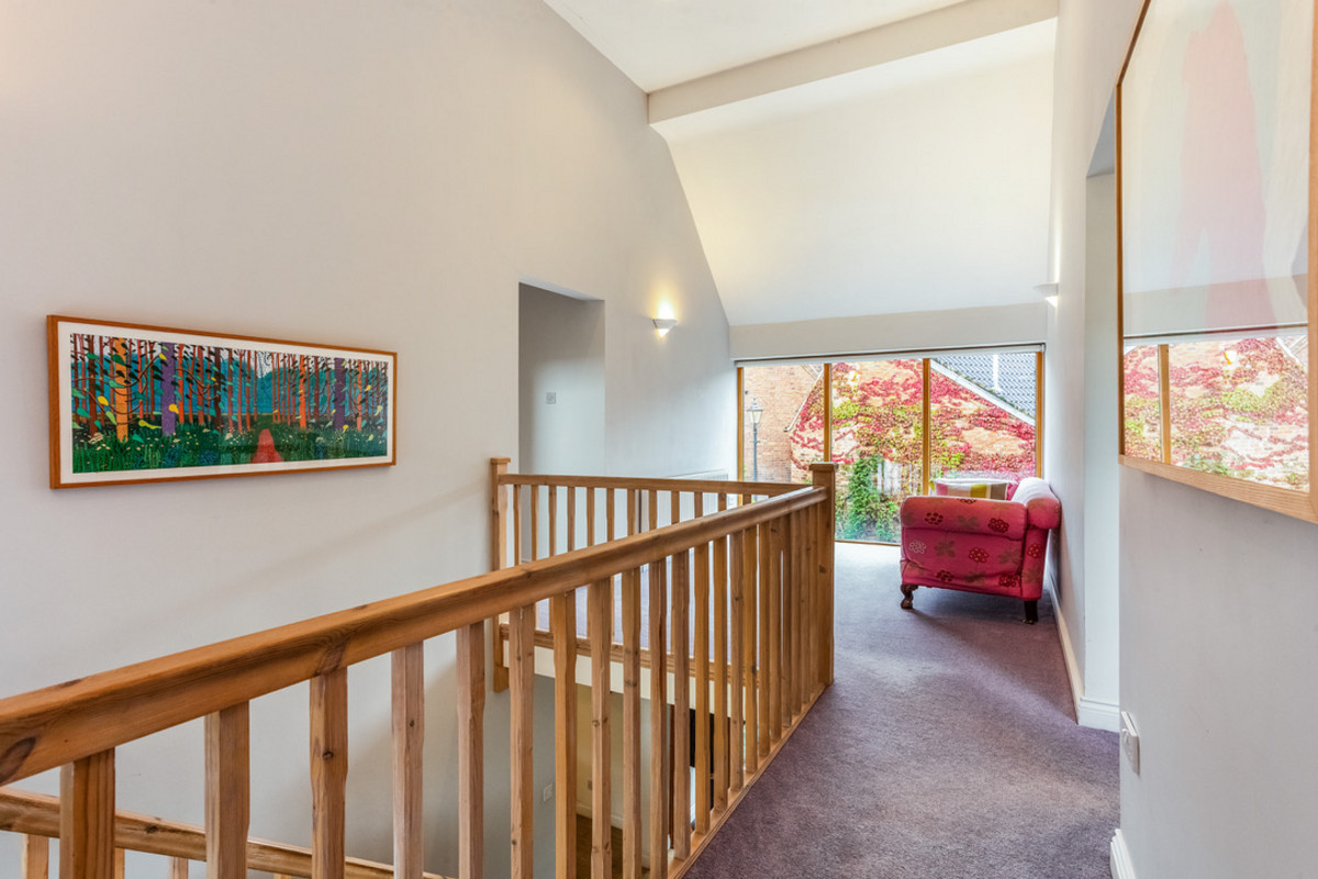 Stairs from the entrance hall ascend to a generous, full-length landing with dual-aspect windows, incorporating an open seating area that offers countryside views to the southeast.