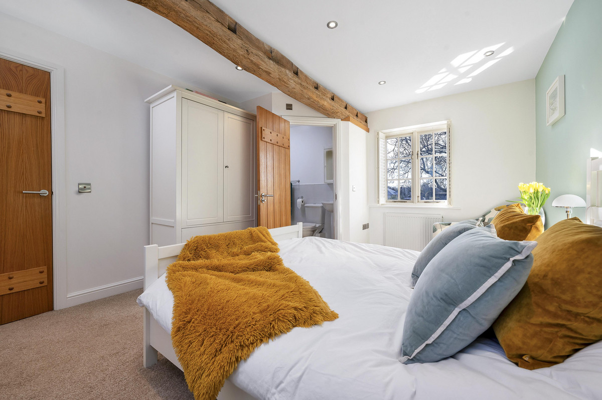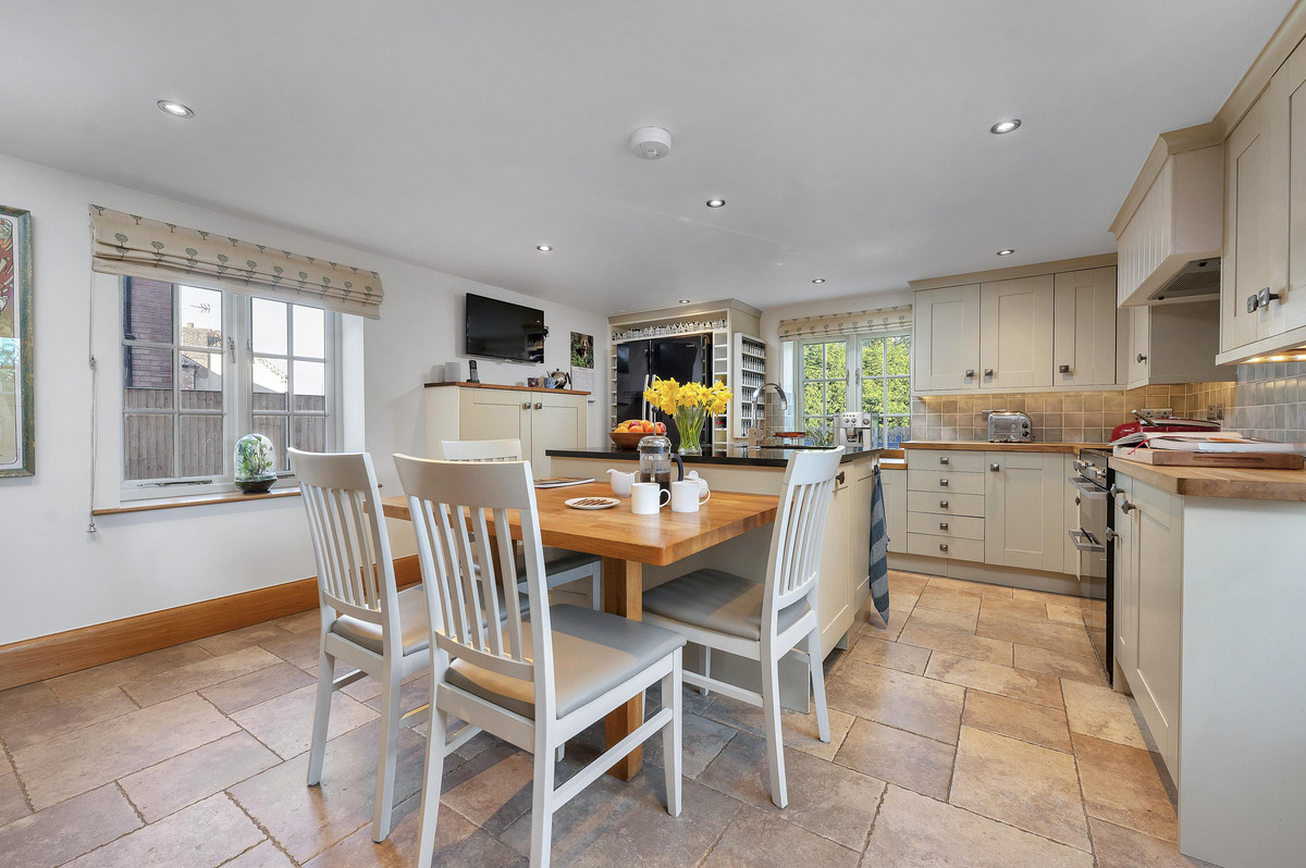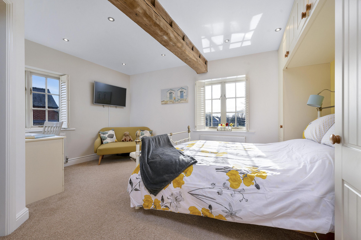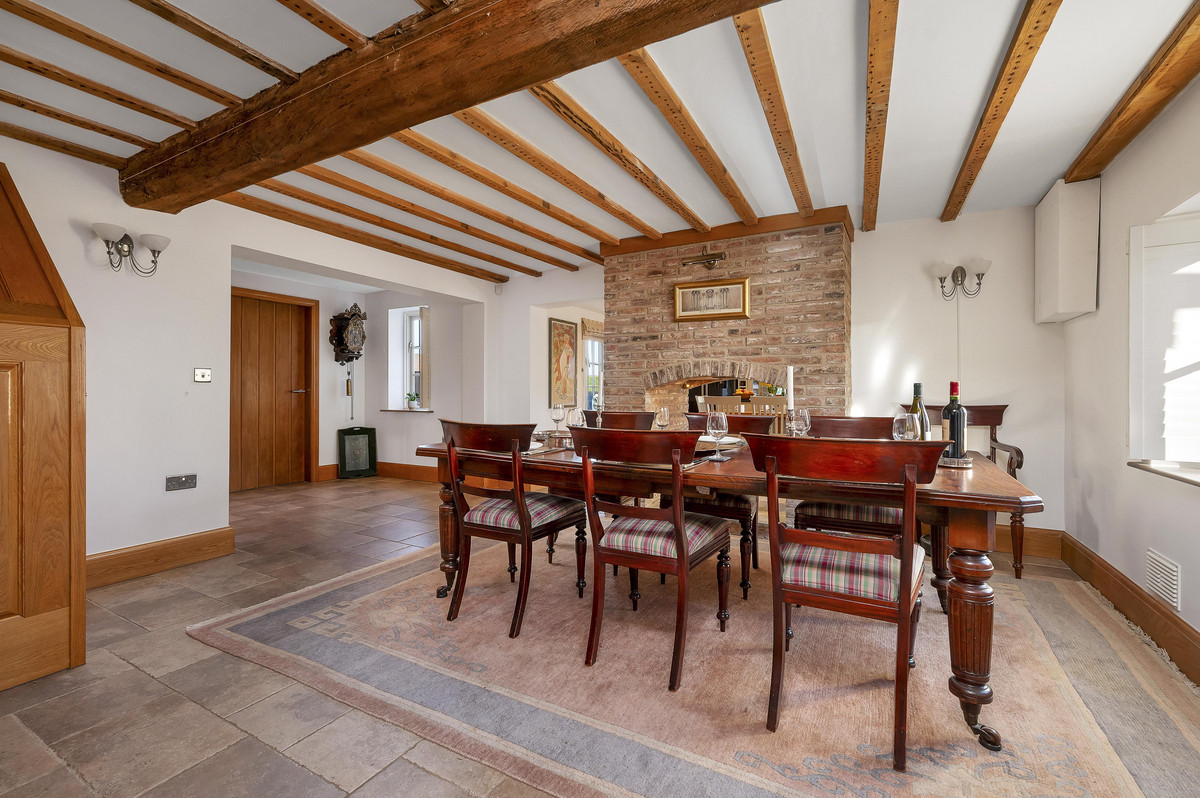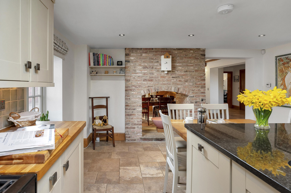 The dining kitchen is bathed in natural light from three windows and thoughtfully equipped with extensive wooden surfaces, storage cupboards, drawers, wine and spice rack. There is a range cooker, integrated dishwasher and American fridge/ freezer. The granite central island features an integrated sink and connects to a fitted breakfast table which can accommodate four people. Finally, the sitting room is a beautifully balanced space, offering built-in storage, a feature red brick fireplace with stone hearth - ideal for a wood-burning stove, a beamed ceiling, and a dual aspect with french doors to rear leading to a veranda with views over the garden and surrounding countryside