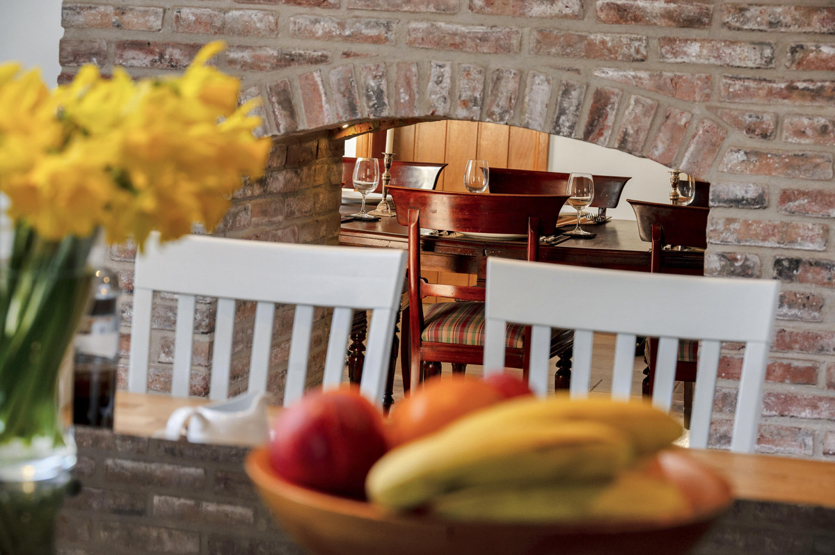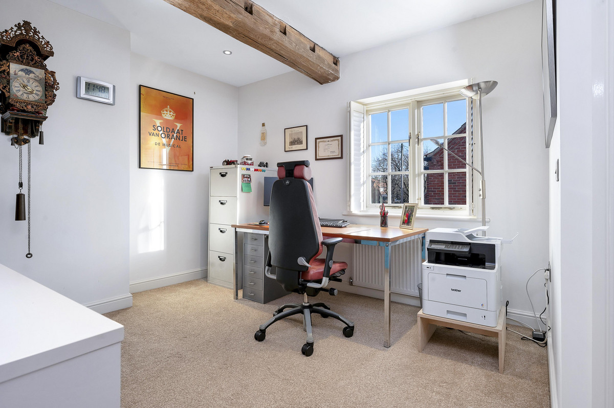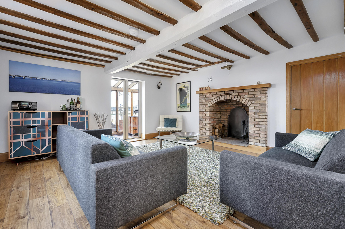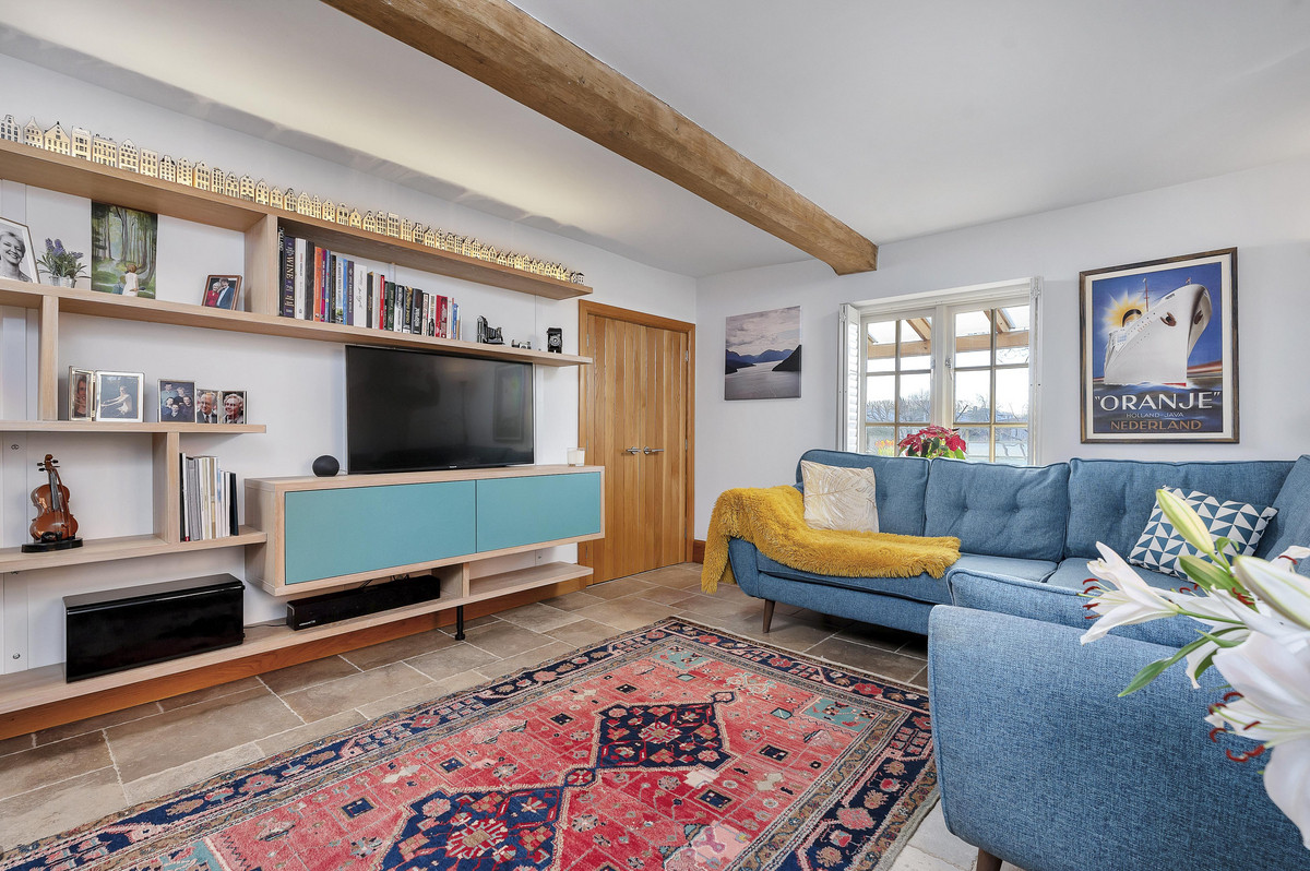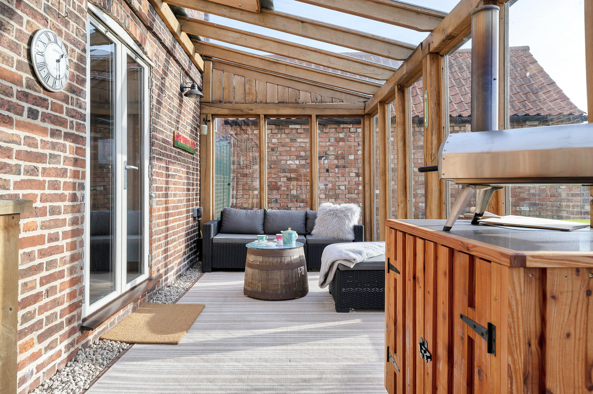 The dining kitchen is bathed in natural light from three windows and thoughtfully equipped with extensive wooden surfaces, storage cupboards, drawers, wine and spice rack. There is a range cooker, integrated dishwasher and American fridge/ freezer. The granite central island features an integrated sink and connects to a fitted breakfast table which can accommodate four people. Finally, the sitting room is a beautifully balanced space, offering built-in storage, a feature red brick fireplace with stone hearth - ideal for a wood-burning stove, a beamed ceiling, and a dual aspect with french doors to rear leading to a veranda with views over the garden and surrounding countryside