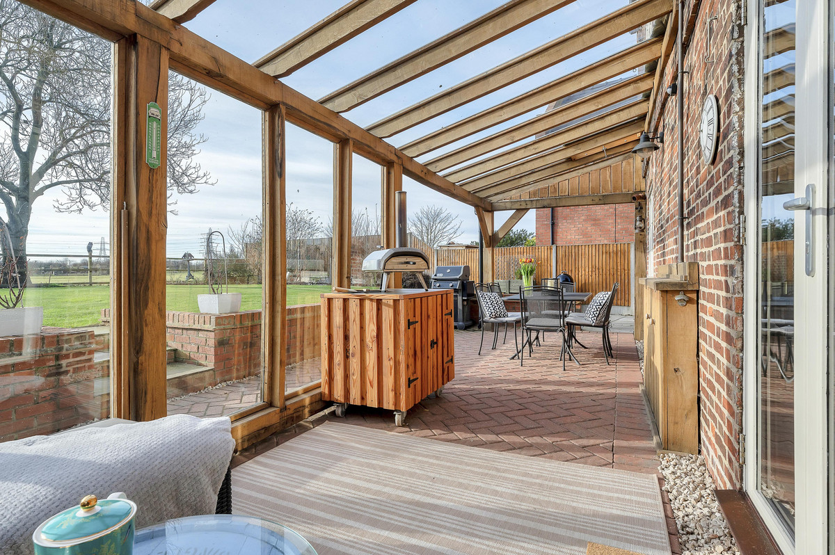 At the front of the property, a gated brick paved driveway offers abundant parking and access to a spacious detached garage, having light and power - currently utilised by the present owner for woodworking and various hobbies. Towards the rear, a partly open glazed veranda constructed from green oak captures a southerly perspective, providing scenic views of the garden and surrounding countryside—ideal for both entertaining and leisurely relaxation. The garden, designed for easy maintenance, features a well-kept lawn and abundantly stocked borders. A patio extends to the side, leading to the door of the utility room and an additional fenced garden area. Within the garden, there is a summer house, a wood store, and a discreet storage area.