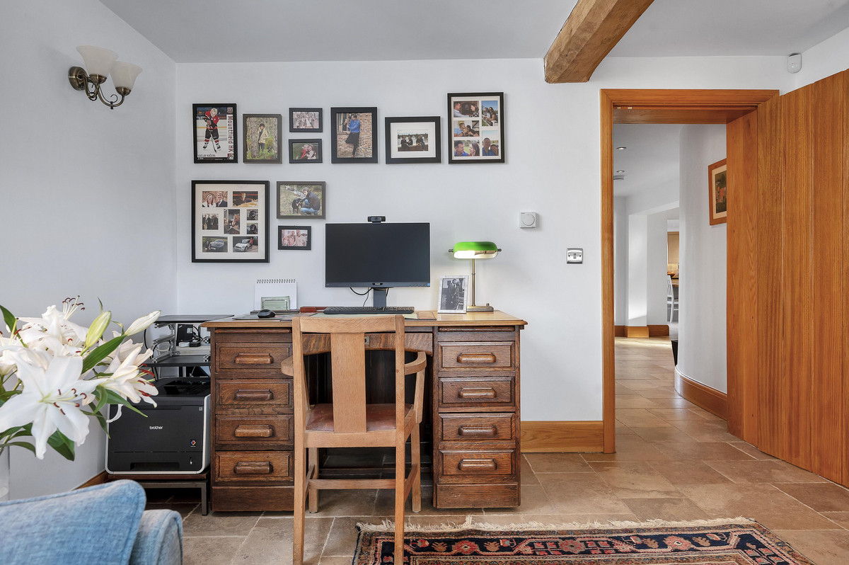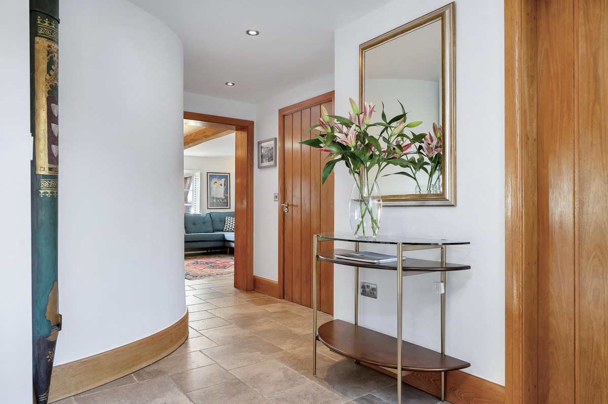 The side lobby/hallway provides access to three doors leading to a convenient utility room, a guest cloakroom, and a well-positioned family room. The utility room has fitted preparation surfaces, sink, appliance space for washing machine and tumble dryer - also serving a boot room having a back door. The family room is generously sized, featuring a large built-in storage cupboard, a dual aspect, and views over the garden and surrounding countryside.