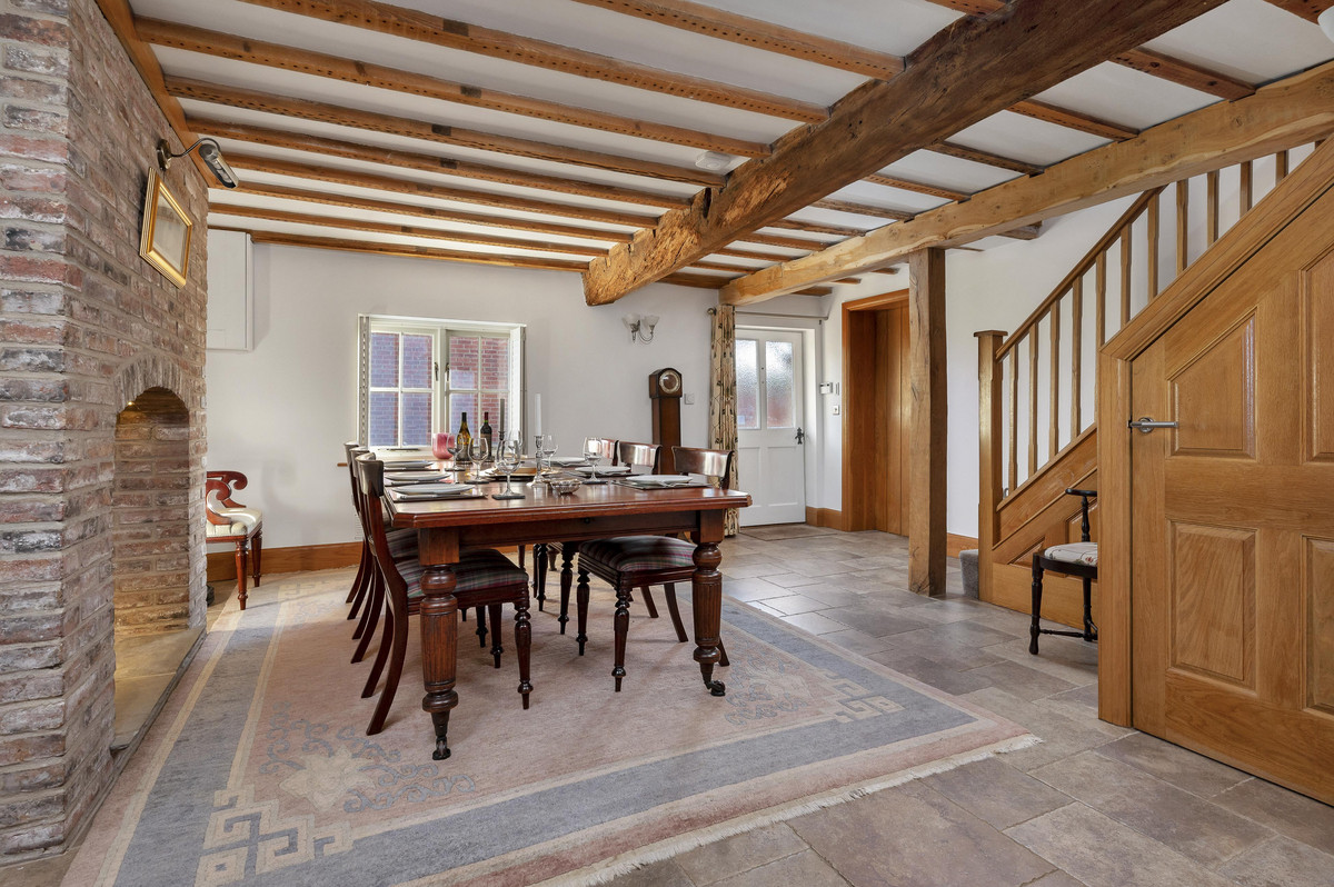 Upon entering, you are welcomed by a charming reception/dining hallway featuring an exposed beamed ceiling, a distinctive two-way red brick fireplace/chimney breast with stone hearth and panelled an oak door leading to a wine cellar accessed by four steps. The room also houses a staircase to the first floor, a doorway to the sitting room, opens into the dining kitchen, and connects to a side lobby/hallway.