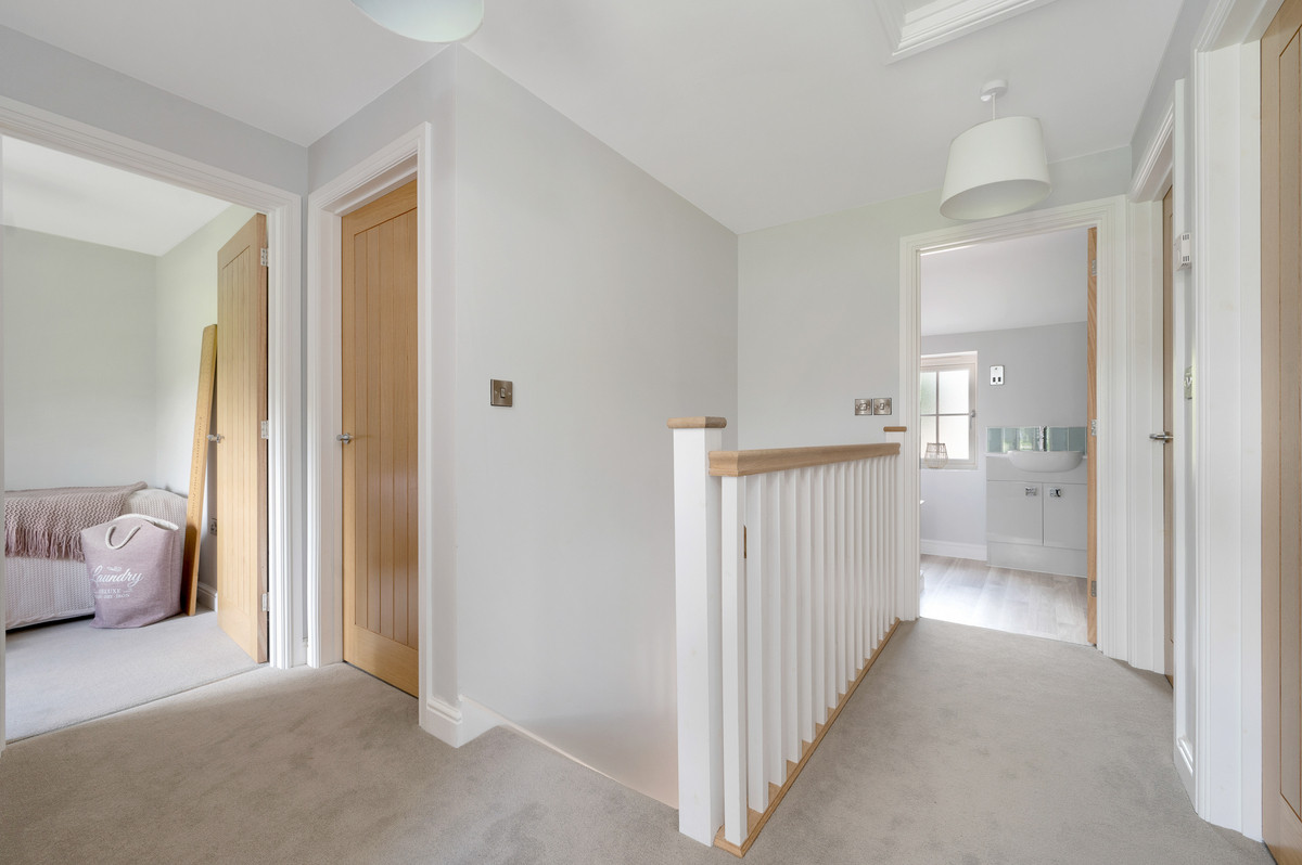 A traditional staircase rises to the first floor where a spacious landing provides access to a main bedroom with en suite shower room as well as three further bedrooms which share the use of a high quality family bathroom.