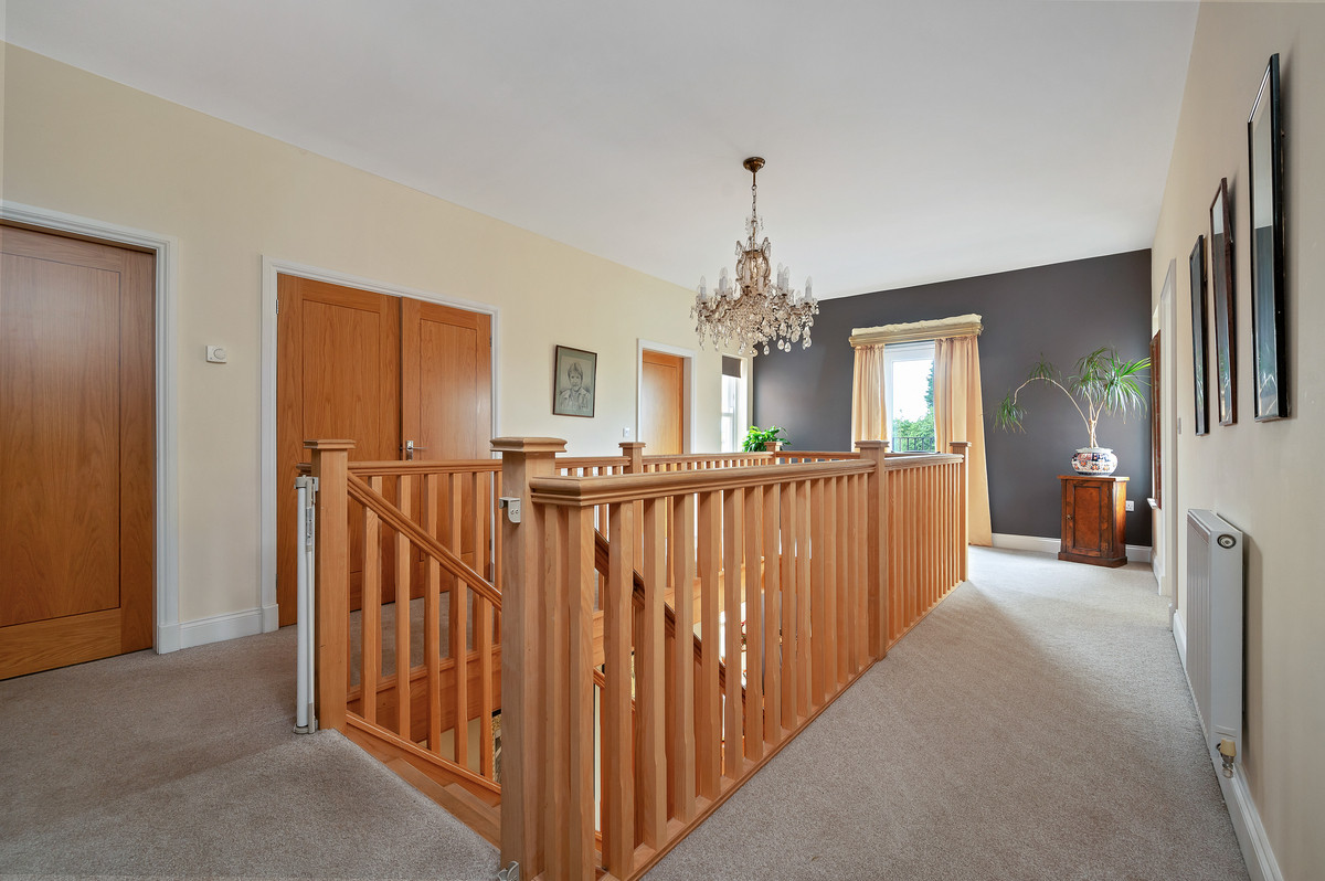 The impressive staircase rises to the first floor where a spacious galleried landing provides access to all bedroom accommodation. There is a luxurious principal bedroom suite with walk in wardrobe and generous en suite bathroom which has the added benefit of an access door onto a private balcony which overlooks the gardens and the adjacent country park. There are three further bedrooms all of which benefit from high quality en suite shower rooms.