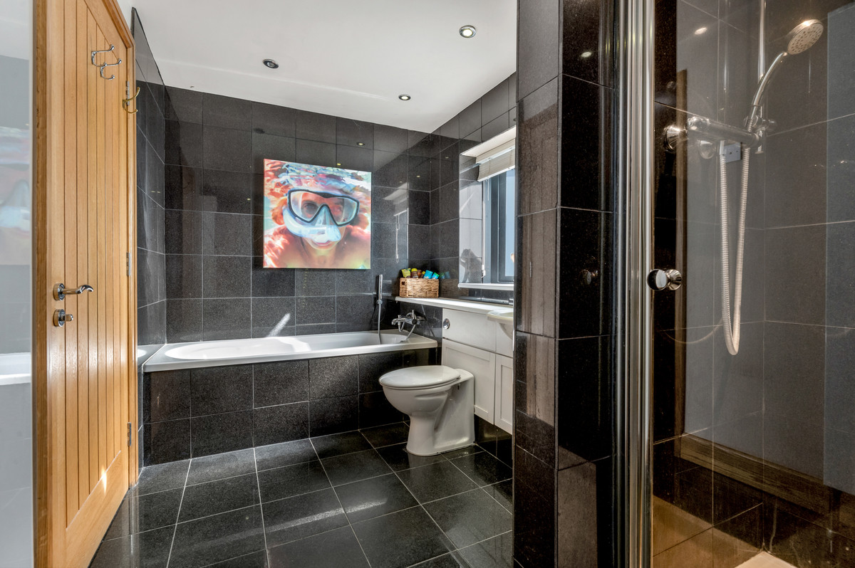 To the other side of the living space is the main bedroom with further access to the terrace and comprehensive built in storage, as well as the benefit of a ‘Jack and Jill’ en-suite bathroom fitted to a high standard. Completing the ground floor accommodation is a further bedroom which would suit a home office.