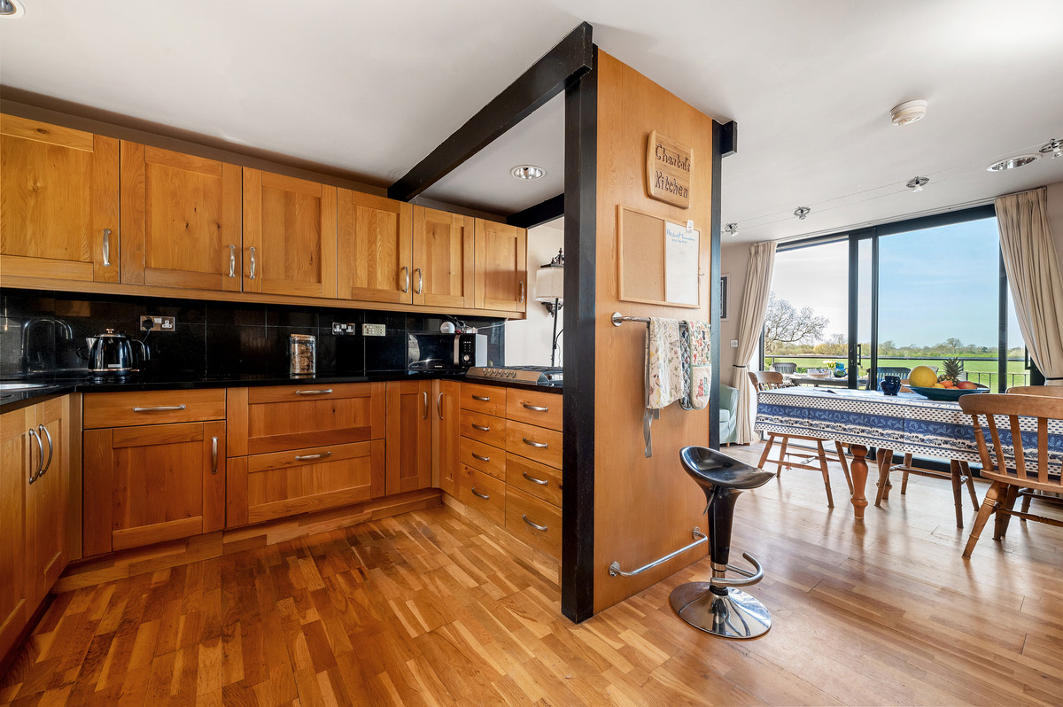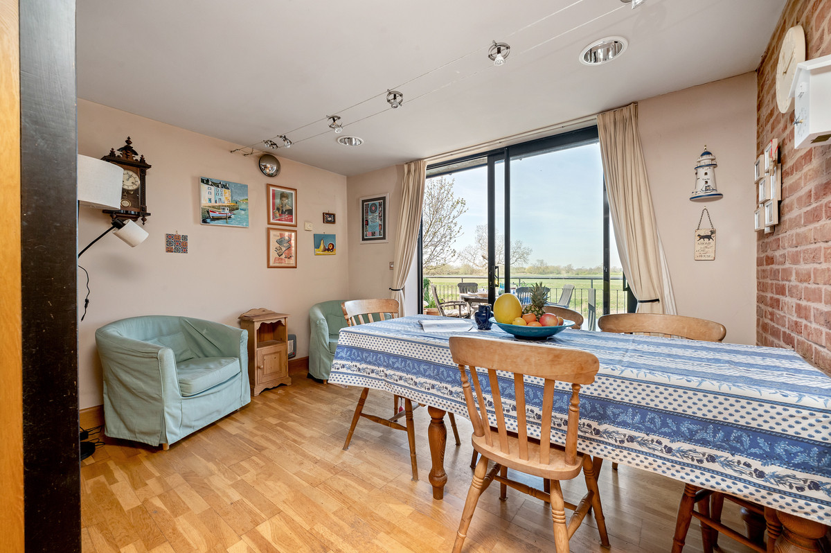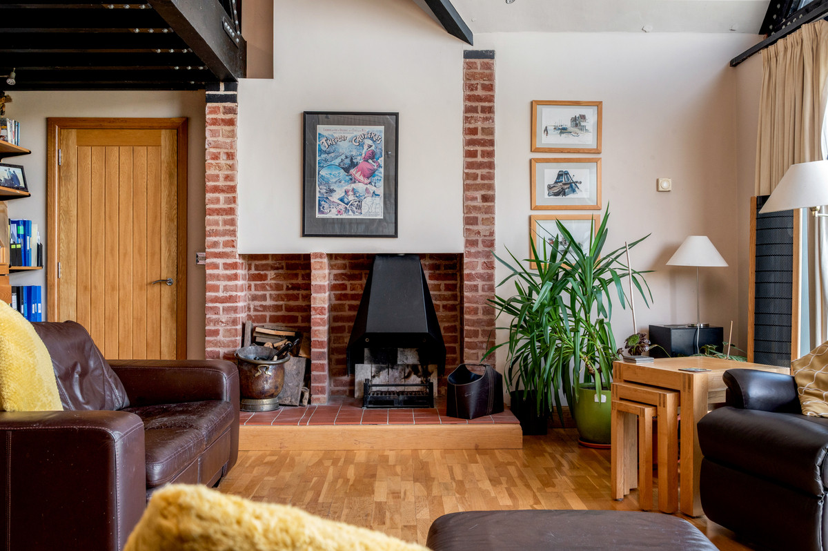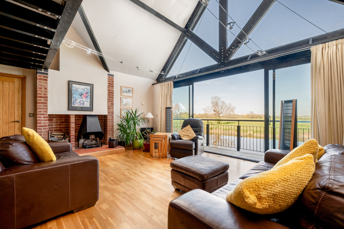 The front door gives access to the entrance hallway which leads straight through to an impressive full height reception space, giving an immediate indication to the calibre of this home – this space showcases a vaulted ceiling, exposed brickwork, striking feature fireplace and details highlighting the construction and framework of the building. But without doubt the main feature of the living space is the apex glazed window providing views of the river and sliding doors providing access onto a raised terrace.