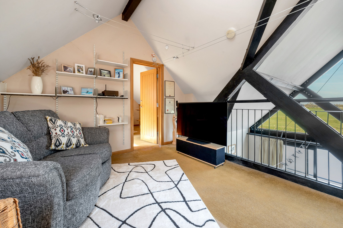 A contemporary staircase rises to the first floor, where a spacious mezzanine provides a further impressive reception space, providing views down to the ground floor as well as river views through the feature apex window.