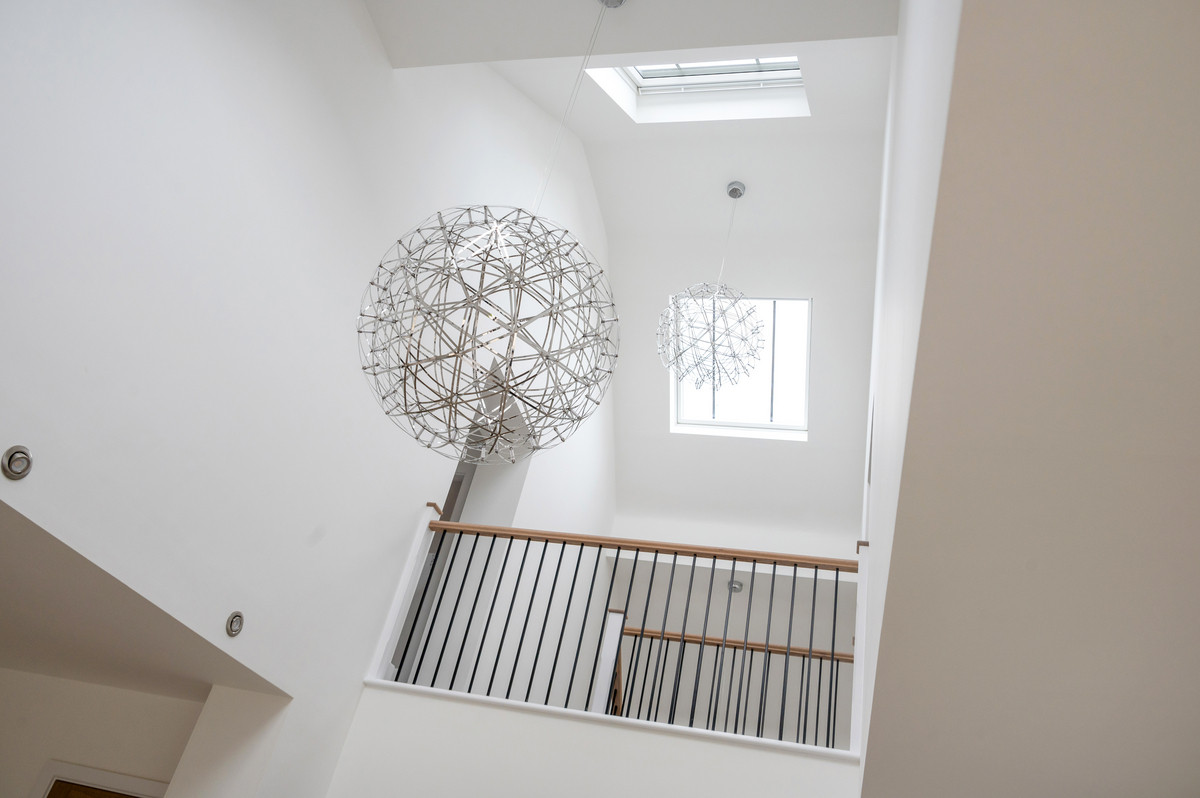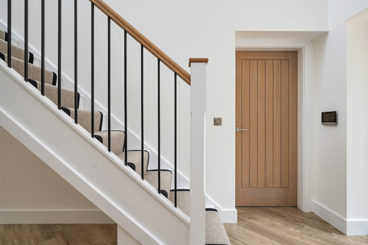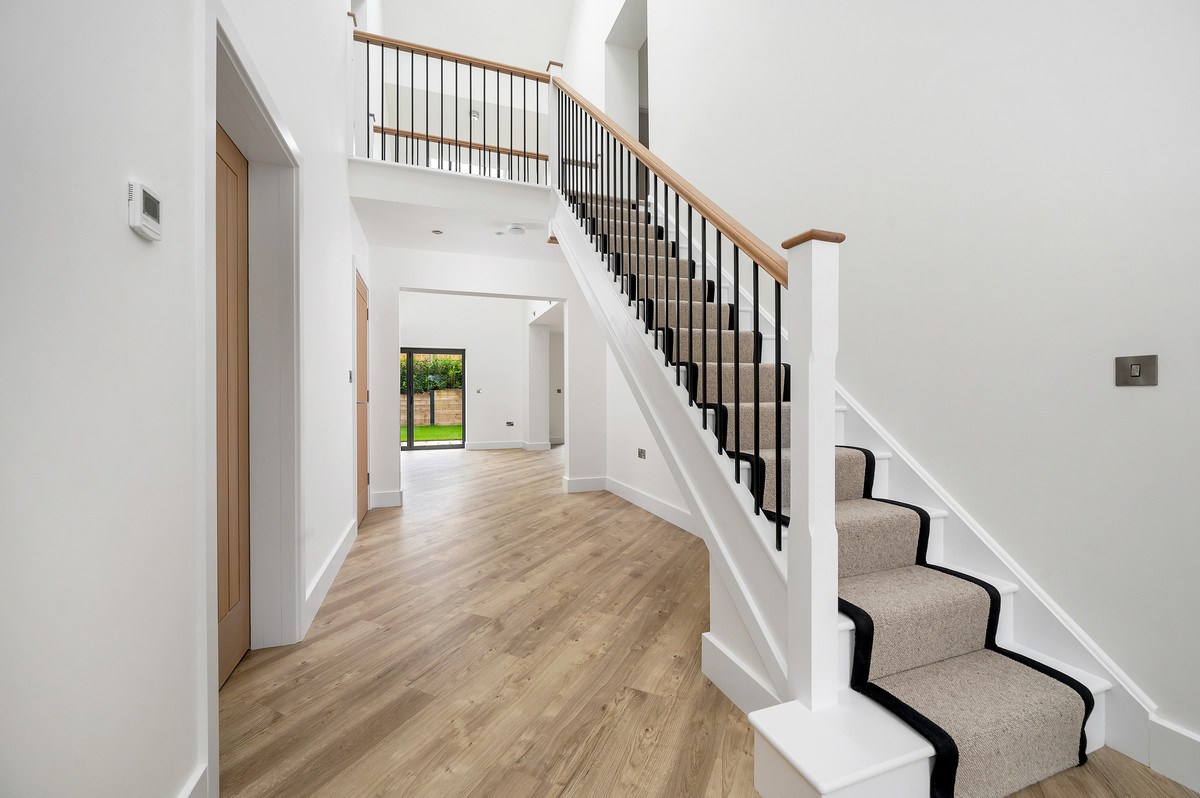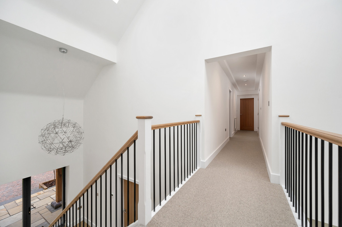 A contemporary staircase rises to the first floor leading to a gallery area which benefits from contemporary lighting and views down below. The first floor provides five generous bedrooms, all of which benefit from en suite shower rooms and four of the bedrooms benefitting from either a walk in dressing room or contemporary built in wardrobes.