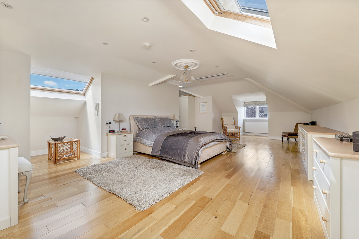 The impressive principal suite is flooded with natural light and provides a real sense of luxury, with bespoke built-in wardrobes and well-appointed en-suite bathroom. Located off the bedroom is a generous walk-in dressing room, which also provides access to useful eaves storage.