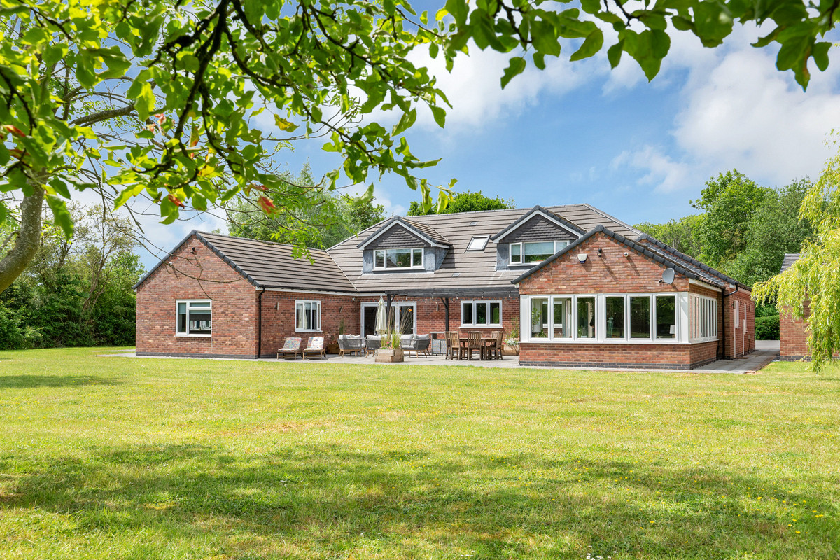 To the rear of the property are large lawned gardens, showcasing a variety of mature trees and perfect for an active family lifestyle.