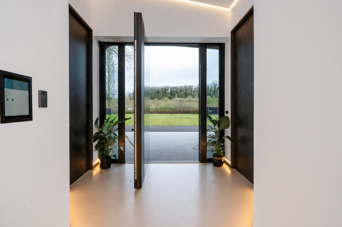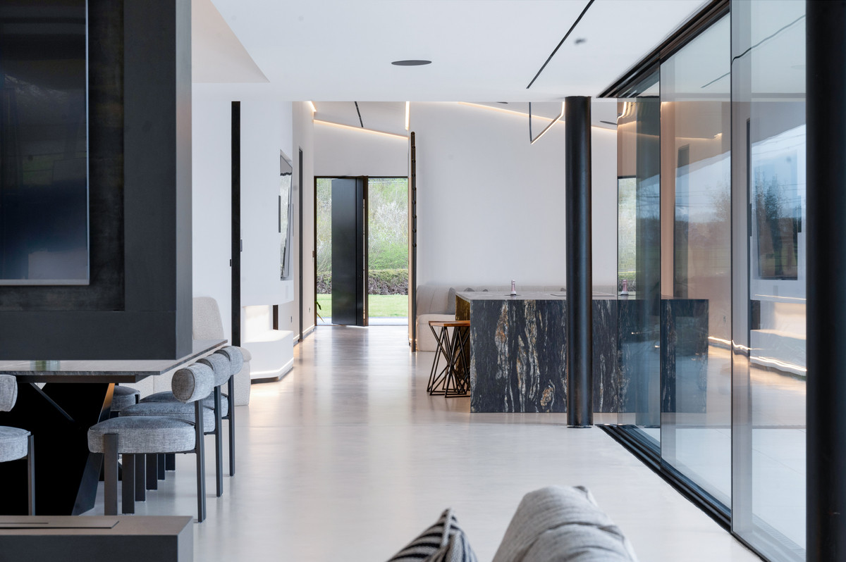 A striking, contemporary entrance door leads to a spacious reception hallway, which flows into the open-plan living area. This expansive space includes a built-in lounge seating area, located adjacent to the kitchen - the heart of the home. The bespoke kitchen features integrated appliances and is centred around a large island, providing both style and functionality.