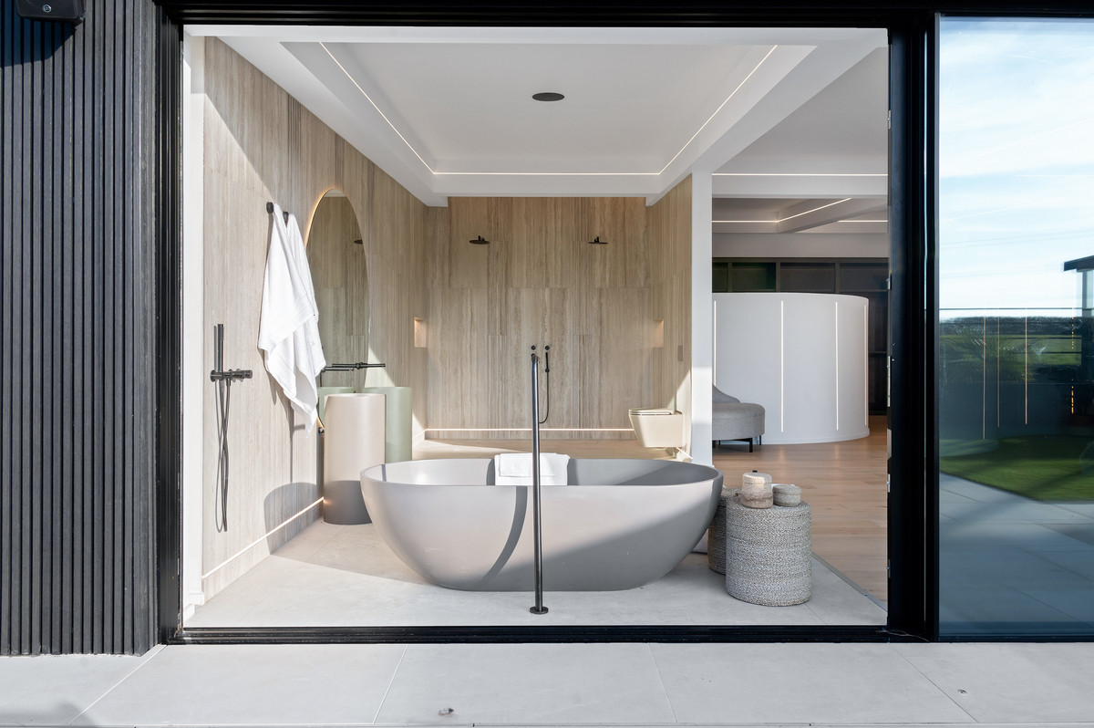The living space continues into a dining area and additional sitting area, both of which feature a central media wall. Numerous full-height windows offer easy access to the outdoors, making this space ideal for entertaining all year round.