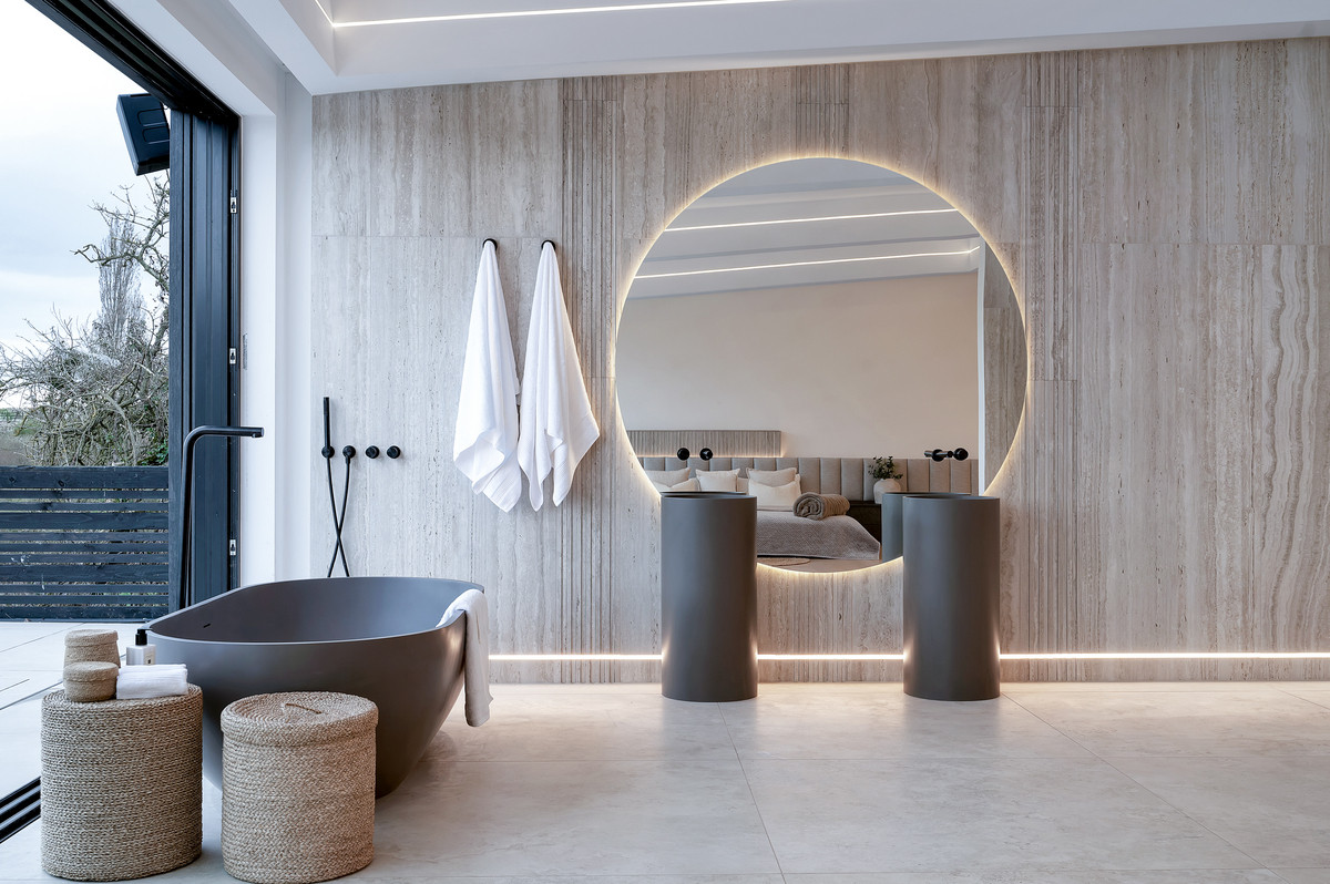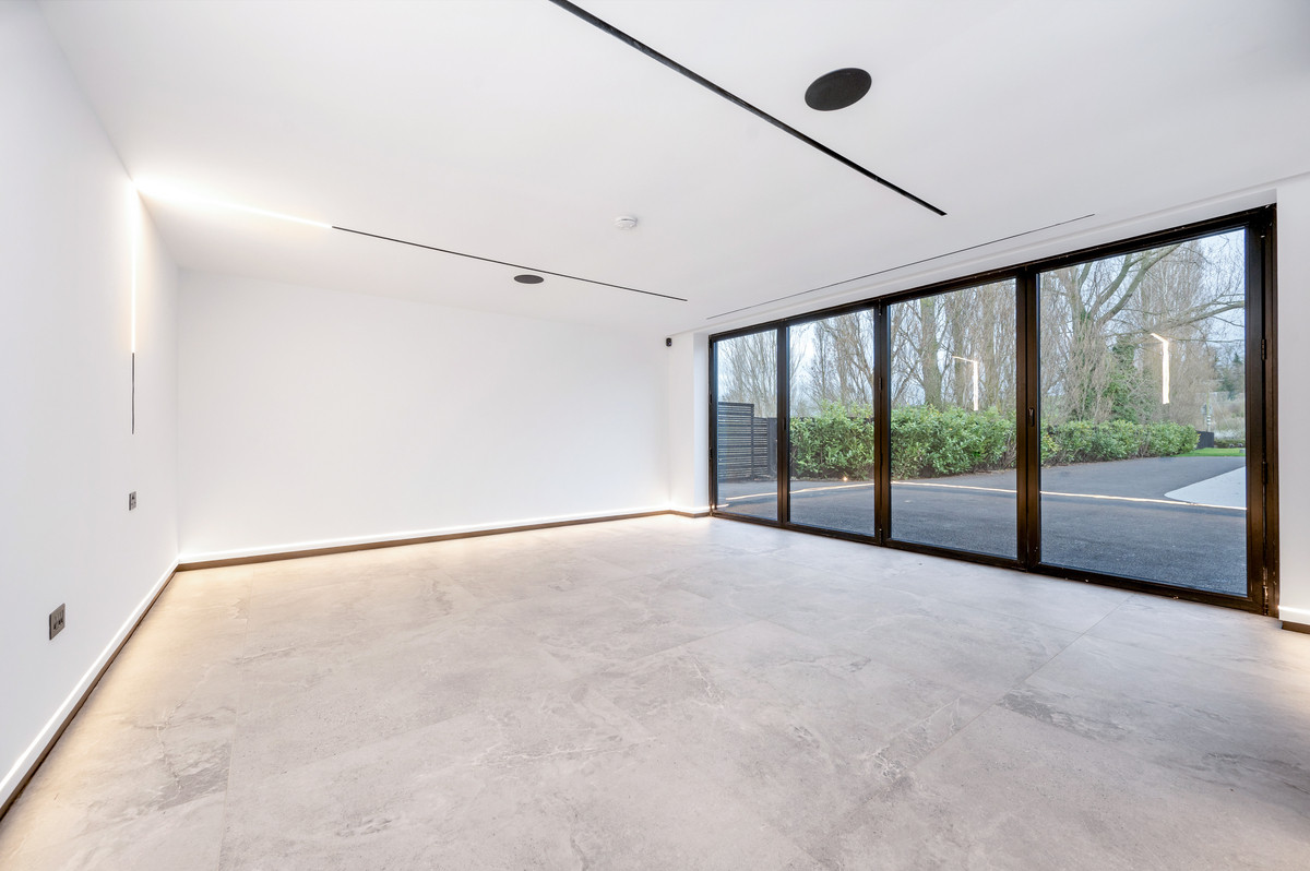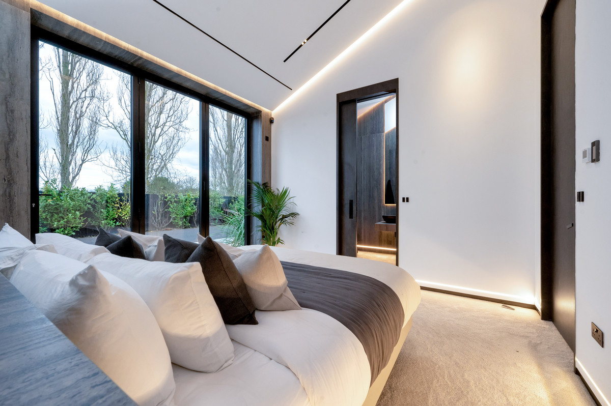 The fifth bedroom is currently configured as a home gym, with a fully glazed elevation and bifolding doors that open to the outdoors, perfect for fitness enthusiasts. This versatile space also includes luxurious en-suite facilities.
