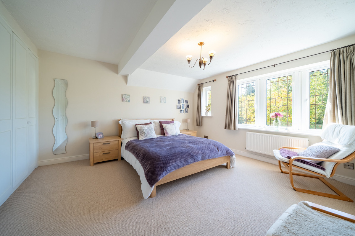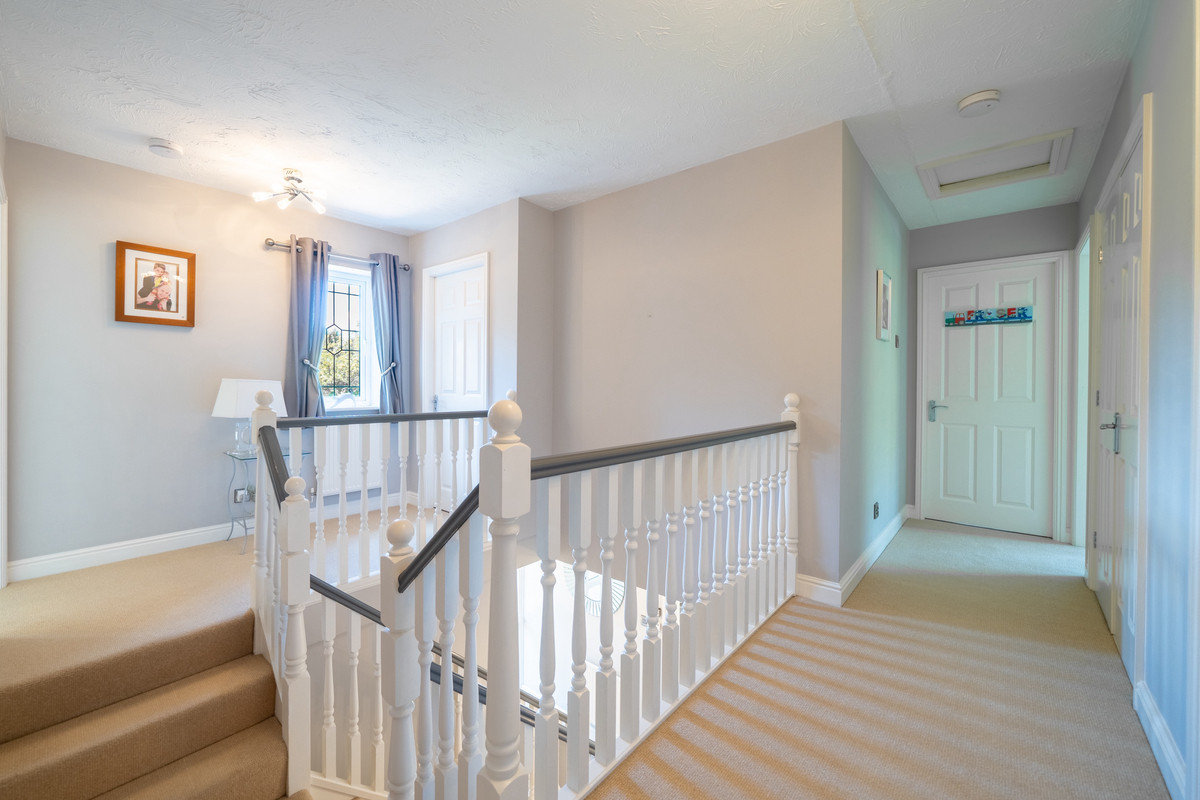 An impressive staircase rises to the first floor, where a galleried landing gives access to a generous principal bedroom with en-suite shower room, guest bedroom with en-suite, as well as three further bedrooms which share the use of high-quality family bathroom. It should be noted that four of the bedrooms benefit from excellent built in storage.