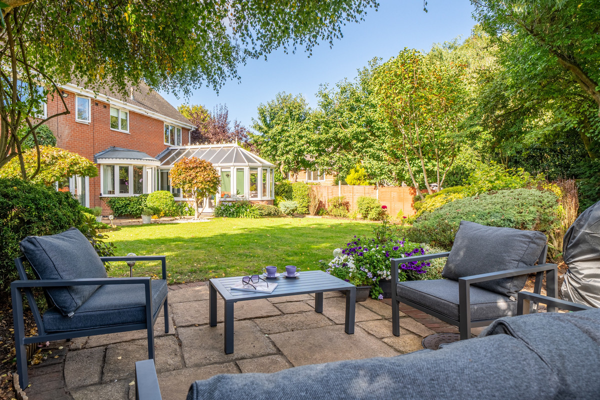 To the rear there are delightful mature gardens providing a degree of privacy, showcasing shaped lawns and heavily stocked boarders providing seasonal colour. There are various landscaped terrace and seating areas benefitting from sunlight at different times throughout the day and perfect settings for outdoor entertaining. There is also a practical area to the side perfect for garden storage.