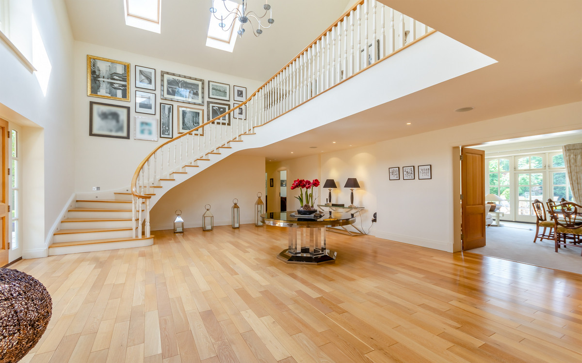 The impressive staircase leads to a galleried landing, with vaulted ceiling and feature skylights, flooding the space with natural light.