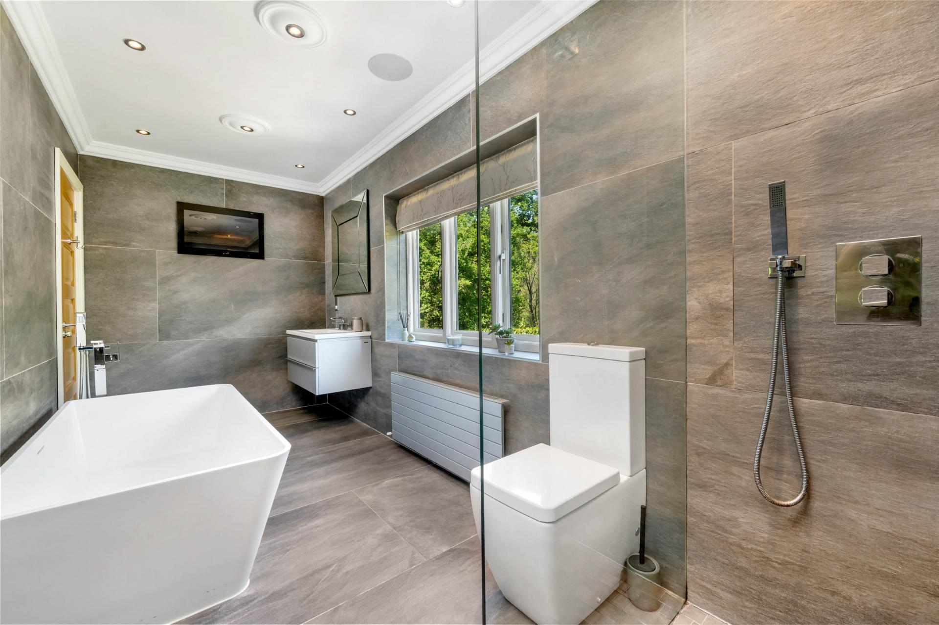 To the first floor and leading off the vast landing, the principal suite offers a wonderful retreat to enjoy. Comprising of a spacious bedroom, fully fitted dressing room and an impressive en-suite bathroom with walk-in shower, freestanding bath and perfectly positioned TV to relax and experience an extended soak - the perfect space to take in and admire the impressive garden aspects found to all sides of the home. Elsewhere on the first floor, you’ll find 3 further double bedrooms and a charming family bathroom.