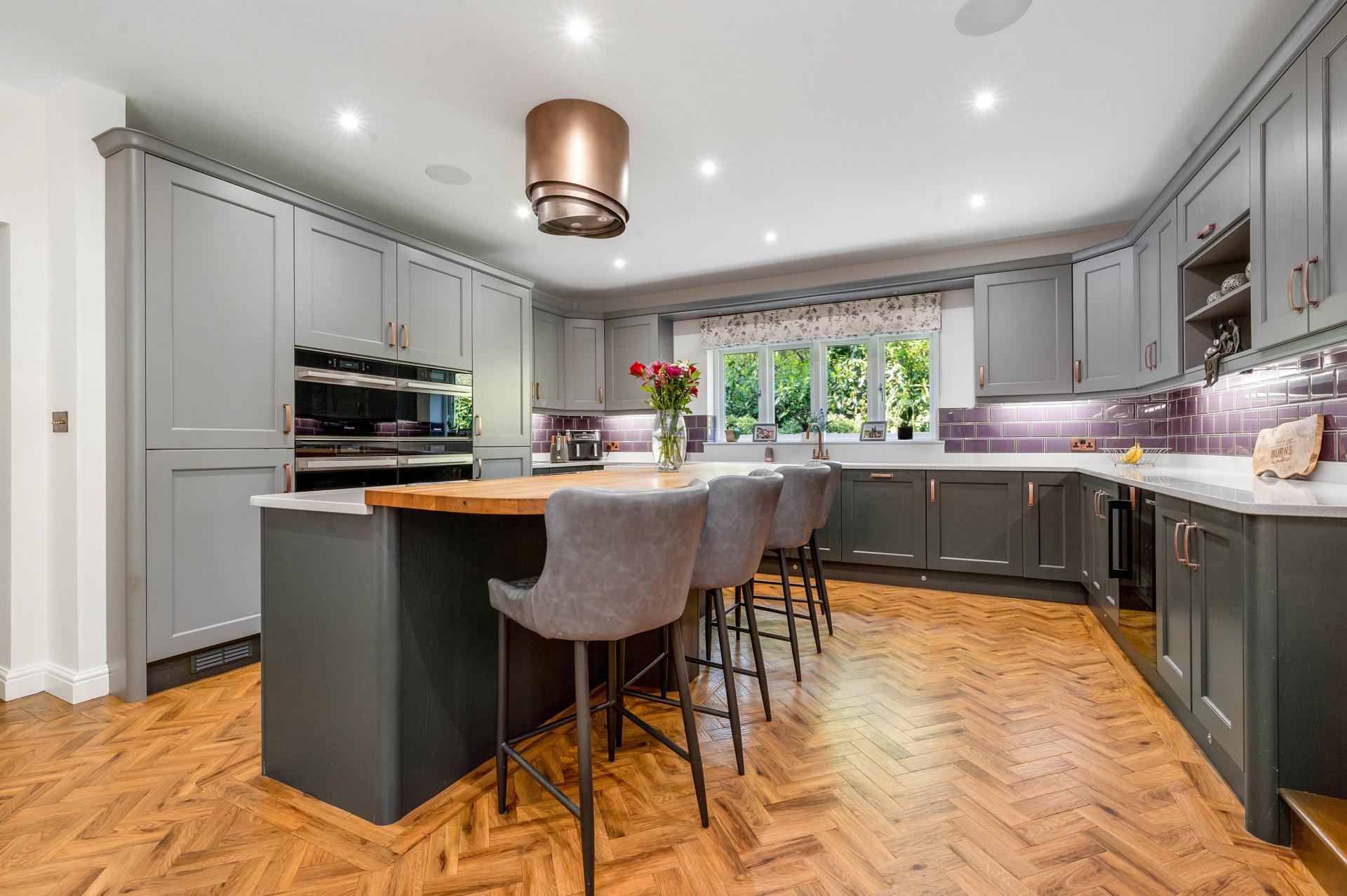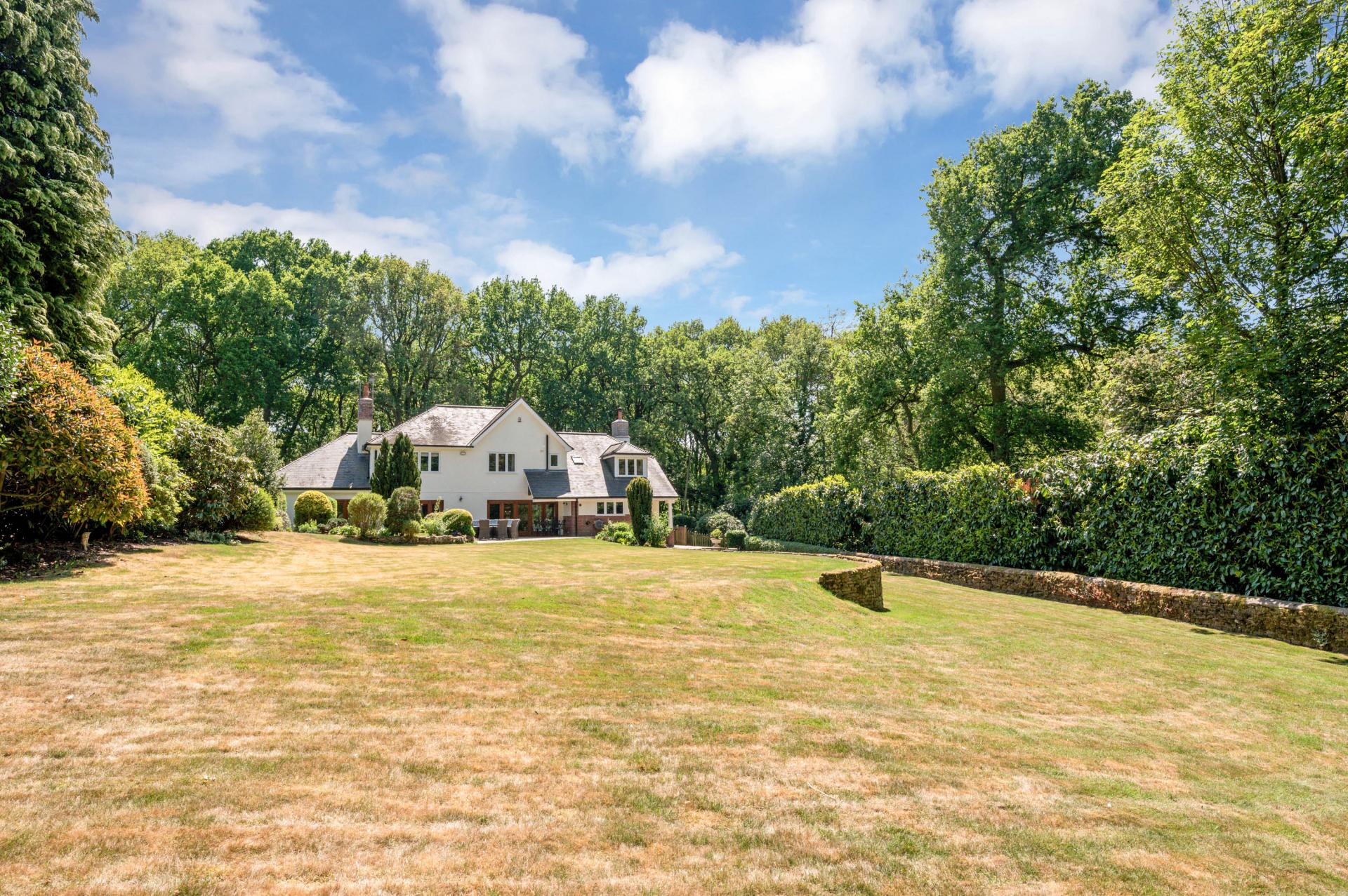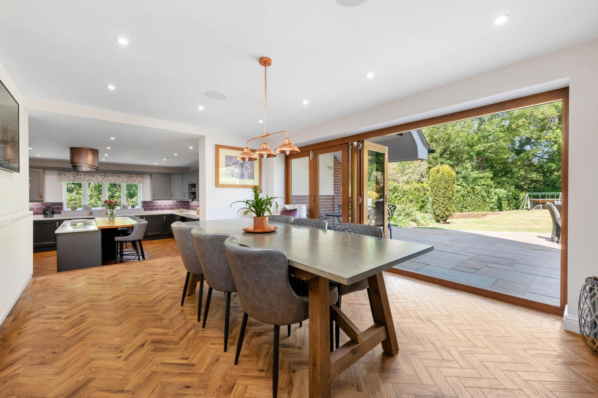 Upon entering the home, you are immediately greeted by a spacious and immaculately presented entrance hall with WC/ cloaks leading off. This hall gives an early indicator of the quality of finish found within the property and much of the principal ground floor accommodation leads off, beginning with the outstanding split-level open-plan dining kitchen. Creating the perfect social environment for families to enjoy or for entertaining, this space hosts an elevated dining area that steps down into the beautifully appointed bespoke kitchen which boasts a range of high specification integrated appliances wrapping around the focal central breakfast island. To one side of the kitchen, you’ll find the fully fitted utility/ boot room with independent access to the garden, whilst to the other there is a cosy yet generously proportioned snug/ family room which benefits from a feature wood burning fire and bay window looking on to a stunning woodland backdrop. The formal lounge provides a larger main reception room to enjoy, with bi-folding doors on to the terrace and again a lovely feature fire. Leading off the formal lounge, you can find the office/ bedroom 5 with an adjoining en-suite shower room which, without too significant alterations, could be utilized as useful annexe space for dependant relatives.