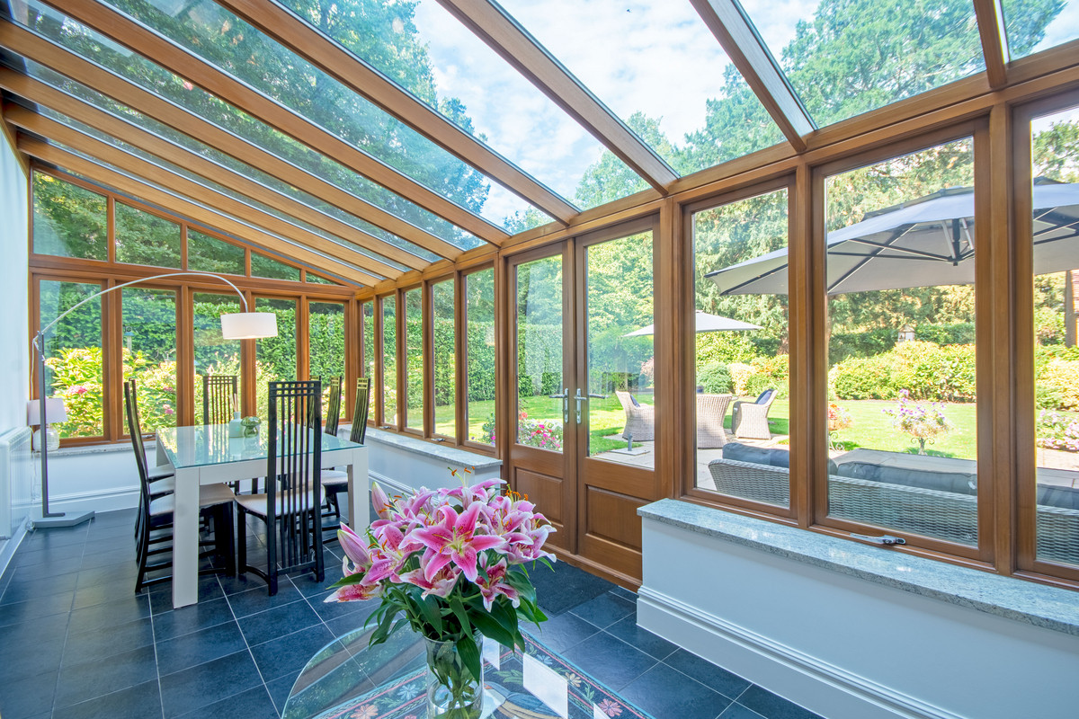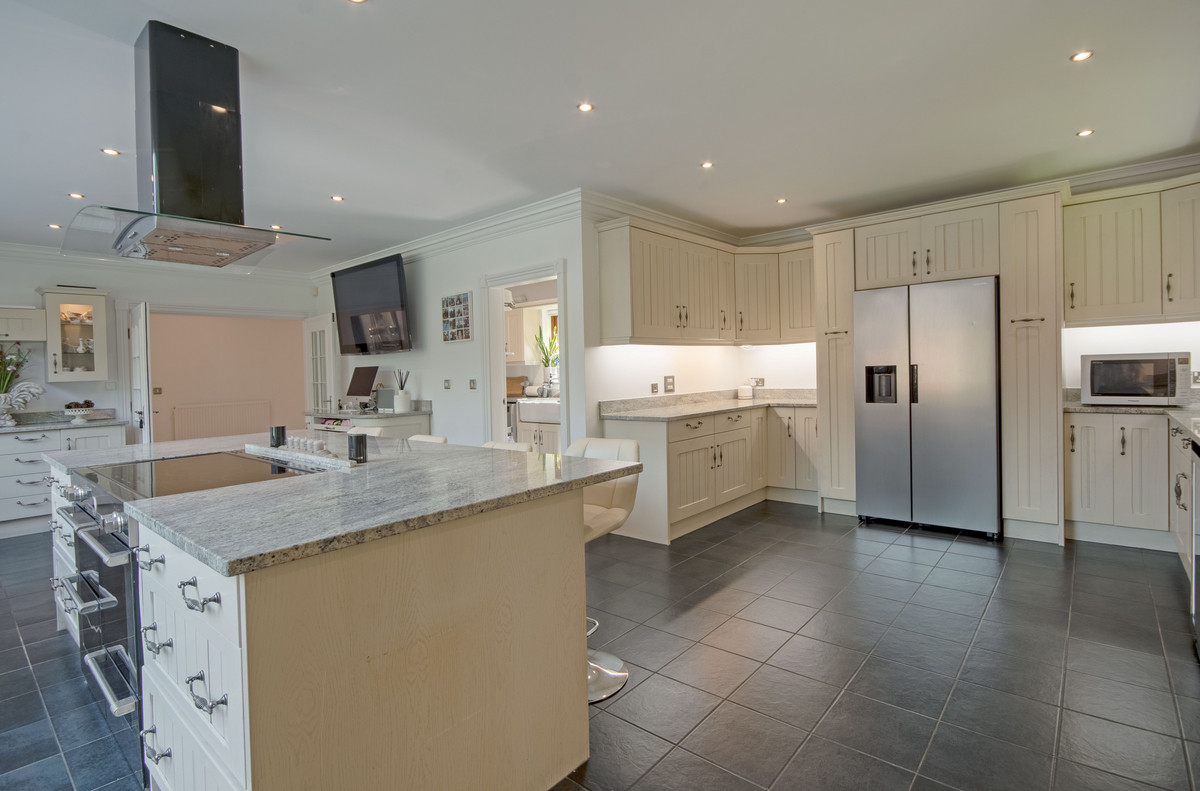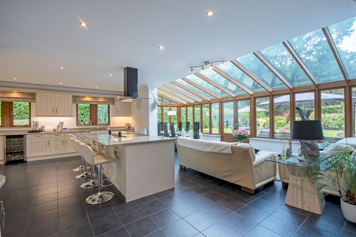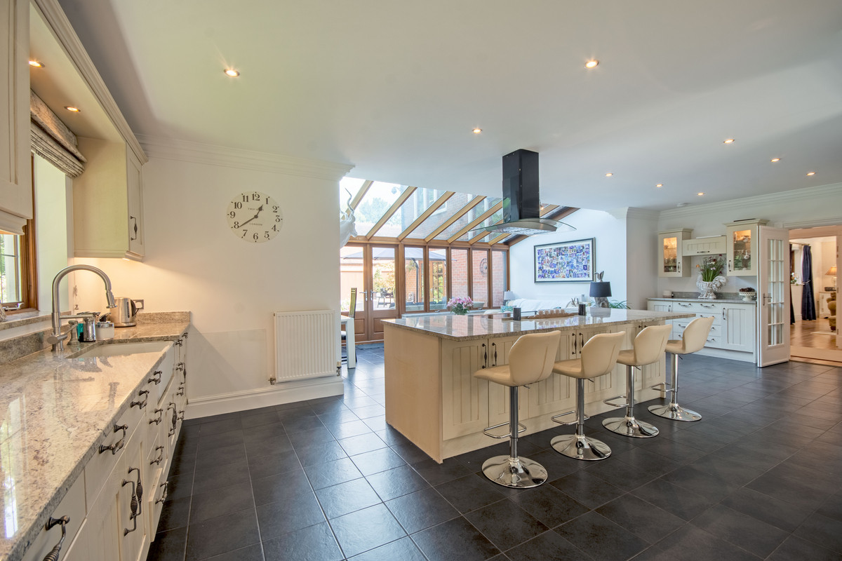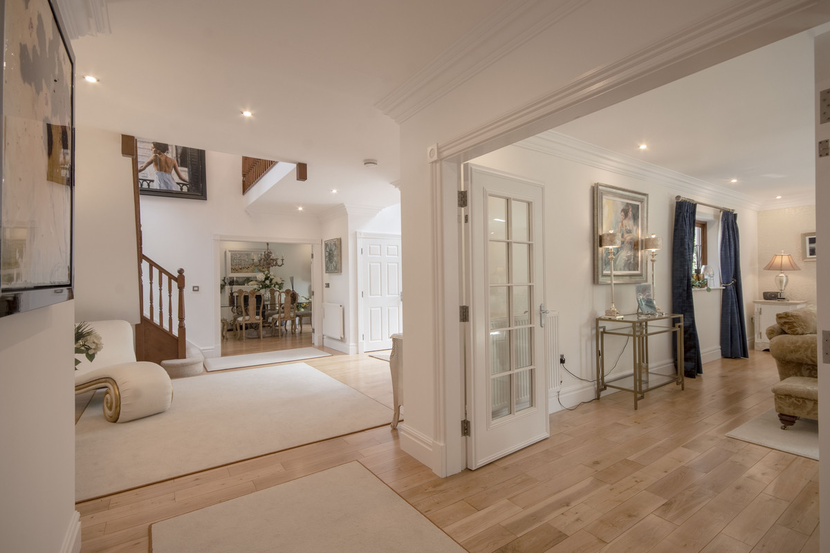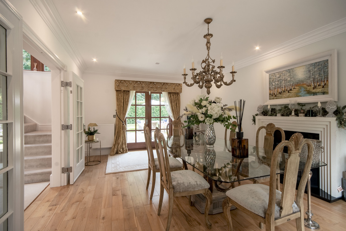 A vast entrance hall laid with oak flooring creates a striking first impression, setting the tone for the scale and elegance found throughout the property. From here, glazed double doors open into the formal dining room, a refined entertaining space with dual aspect views, French doors to the garden, and a feature fireplace.