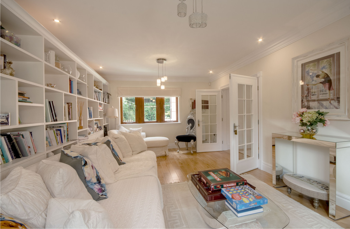 The principal sitting room enjoys a triple aspect outlook and a marble-effect fireplace, while the versatile day room, fitted with bespoke shelving, is equally suited as a study, playroom, or snug.