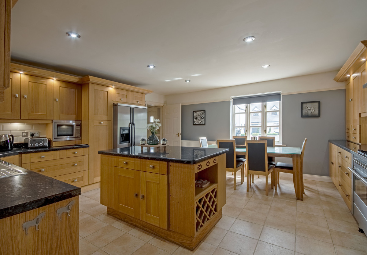 The spacious open plan kitchen diner sits to the front of the property and is fitted with solid oak cabinetry and a central chefs island. Appliances throughout the kitchen include an integral Bosch microwave, dishwasher and a larger Range style cooker with a five burner gas hob and extractor above. There is an opening within the full height units to accommodate a large American style fridge freezer. Other design elements which really enhance the space include aspects such as the plate rack, conveniently positioned above the sink, the open shelving within the island and the wine racks. A door from the kitchen leads into the utility room, which houses further cabinetry in addition to space and plumbing for additional appliances, with a door leading out to the rear garden.