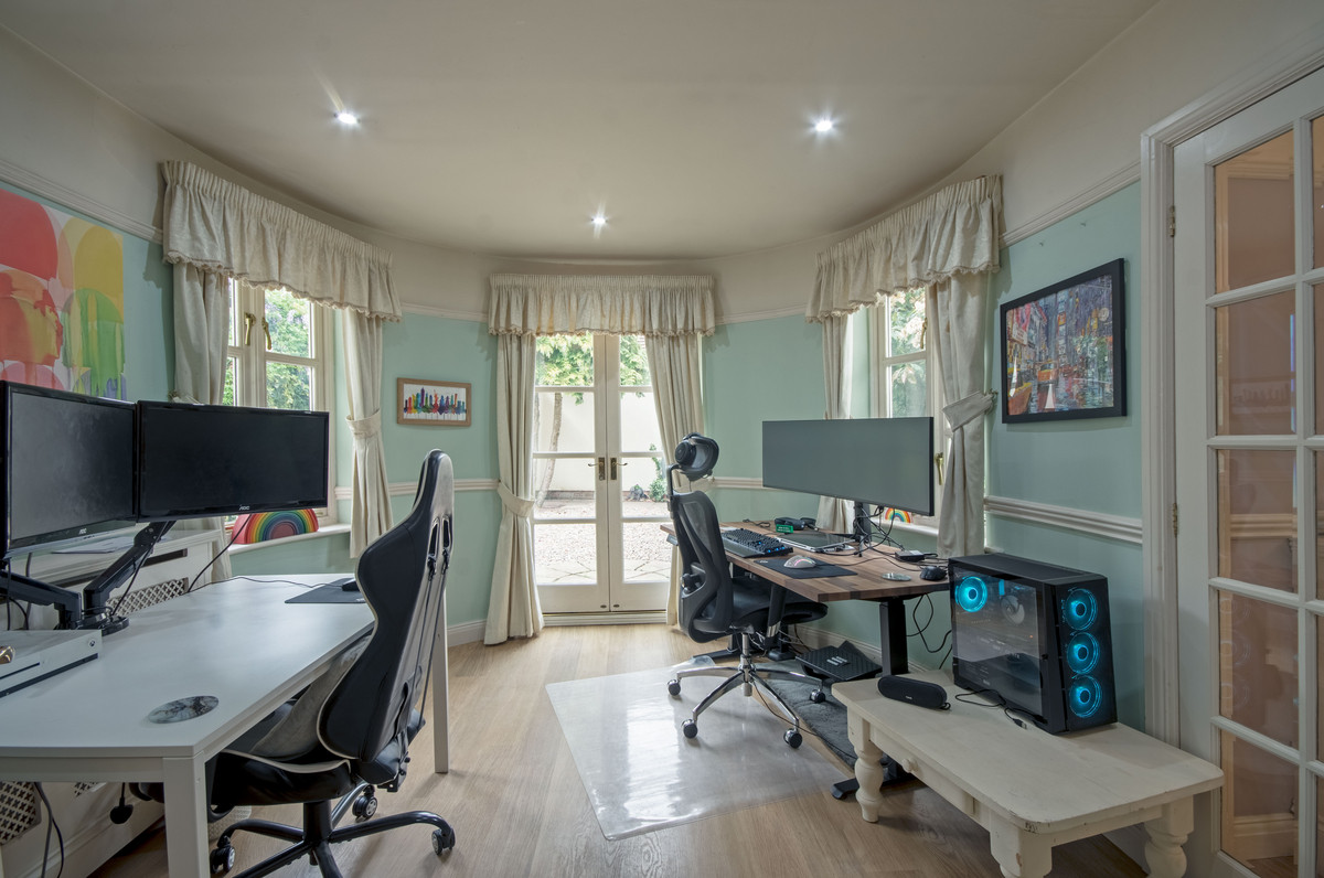 The generous sitting room spans the full depth of the property, enjoying a dual aspect view and features oak effect laminate flooring, a central, focal point gas fire place and French doors out to the rear garden. Double doors from the sitting room also grant access to a lovely versatile room to the rear of the property, currently used as an office space, boasting a triple aspect view over the rear garden.