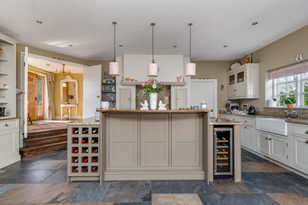 The adjacent utility/boot room provides generous storage with fitted cupboards, a dedicated space for a washing machine and tumble dryer. Thoughtfully designed for everyday convenience, it also offers access to a guest cloakroom and a canopied side entrance—ideal for busy family life or returning from countryside walks with the dog.