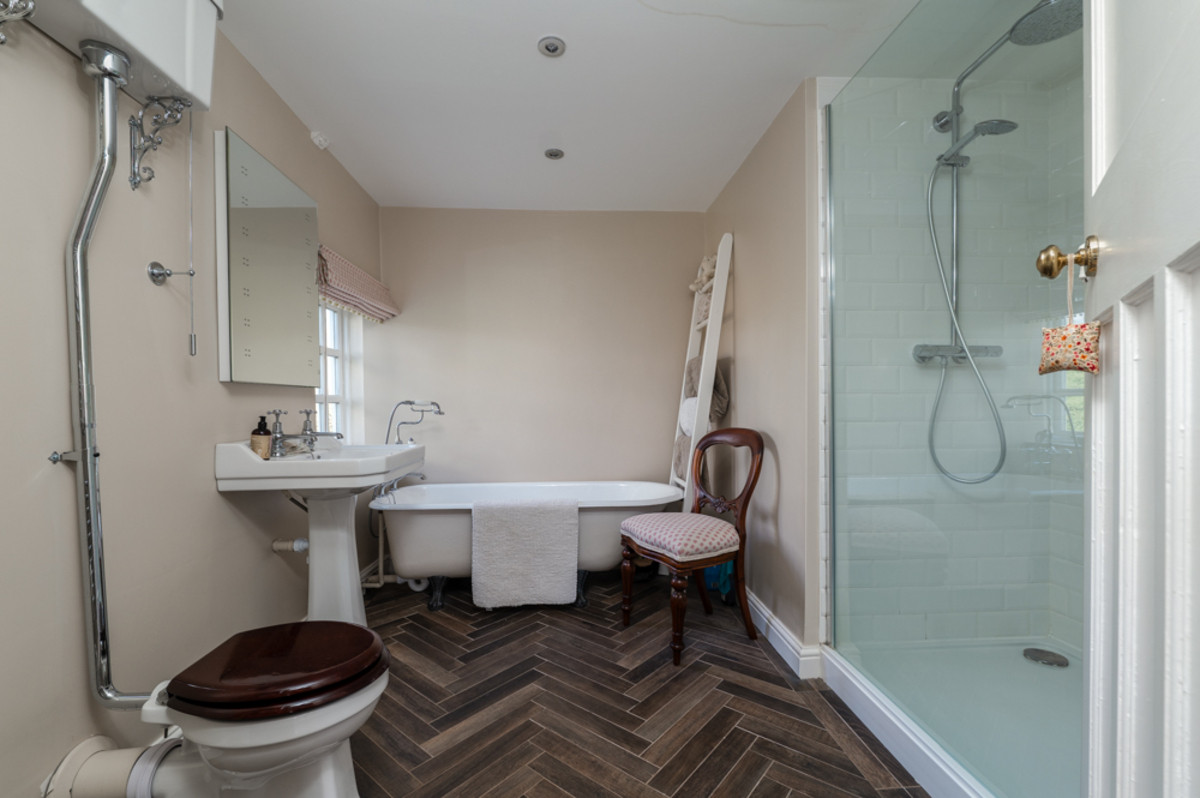 The first floor family bathroom is thoughtfully designed with a Jack-and-Jill layout, seamlessly linking the original house to the first-floor landing of the impressive three-storey extension. Finished to an exceptional standard, this bathroom boasts a luxurious period-style suite, including a freestanding roll-top bath and a separate shower cubicle, having a view towards the church.