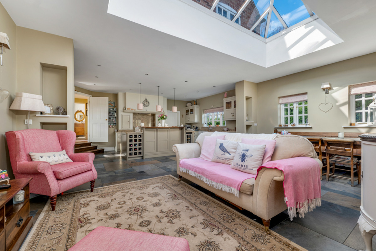 Flowing effortlessly from the dining room, the home’s original entrance hallway reveals a second staircase adding to this homes versatility and leads to the cozy sitting room and a versatile study/family room. Both spaces enjoy natural light from their dual-aspect windows and showcase characterful fireplaces with wood-burning stoves, offering a perfect blend of warmth, comfort and charm.