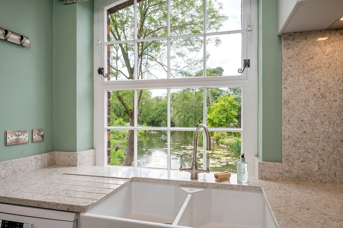 The generously proportioned breakfast kitchen provides a superb vantage point, overlooking the tranquil mill ponds that invite a variety of bird life. Recently well fitted, it offers an extensive range of quartz work surfaces, including a practical breakfast bar, alongside ample storage solutions. The kitchen also features a striking range cooker and a twin butler-style ceramic sink perfectly positioned beneath one of two windows, offering a delightful view over the mill pond. Combining practical functionality with refined style, this space is both welcoming and efficient.
