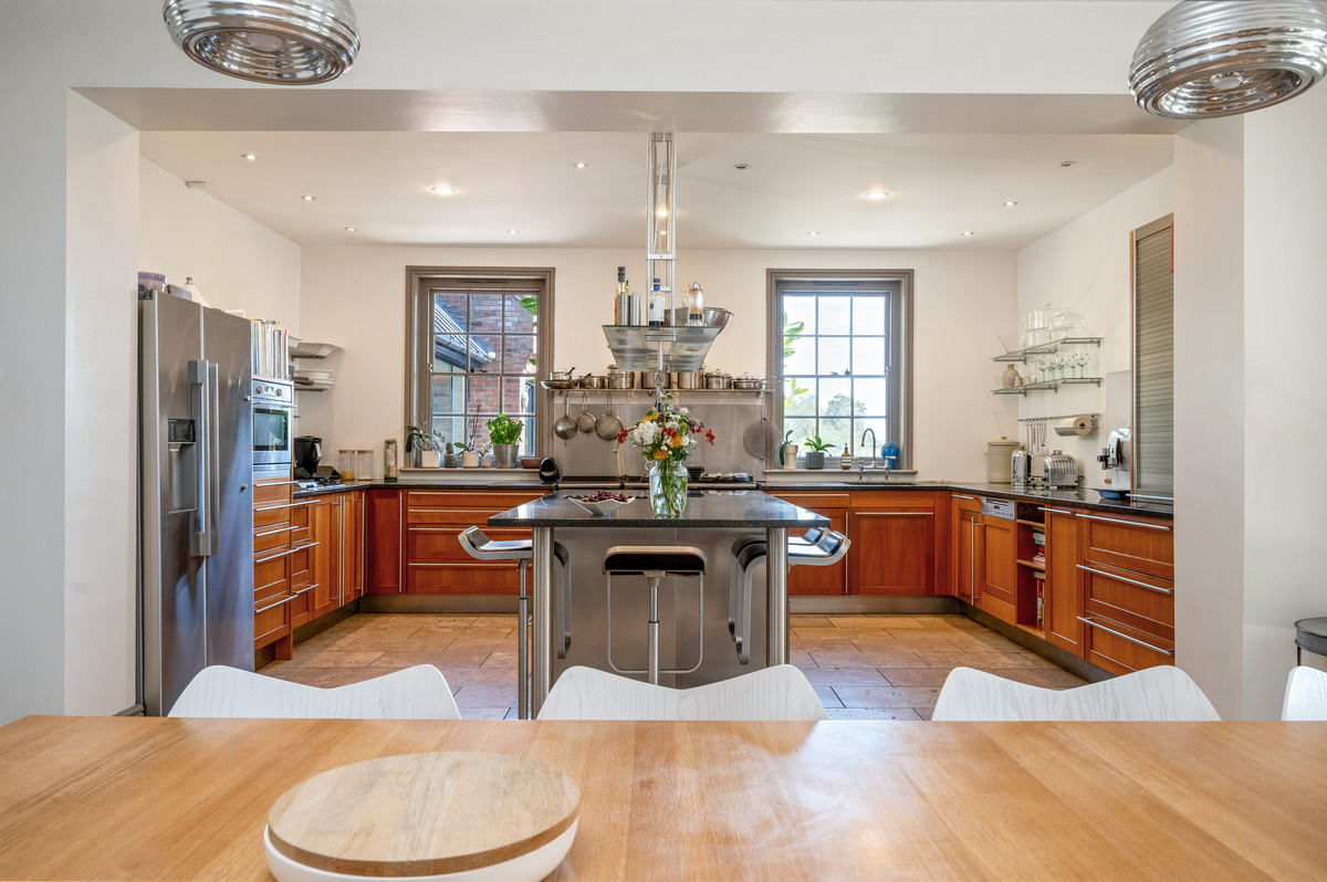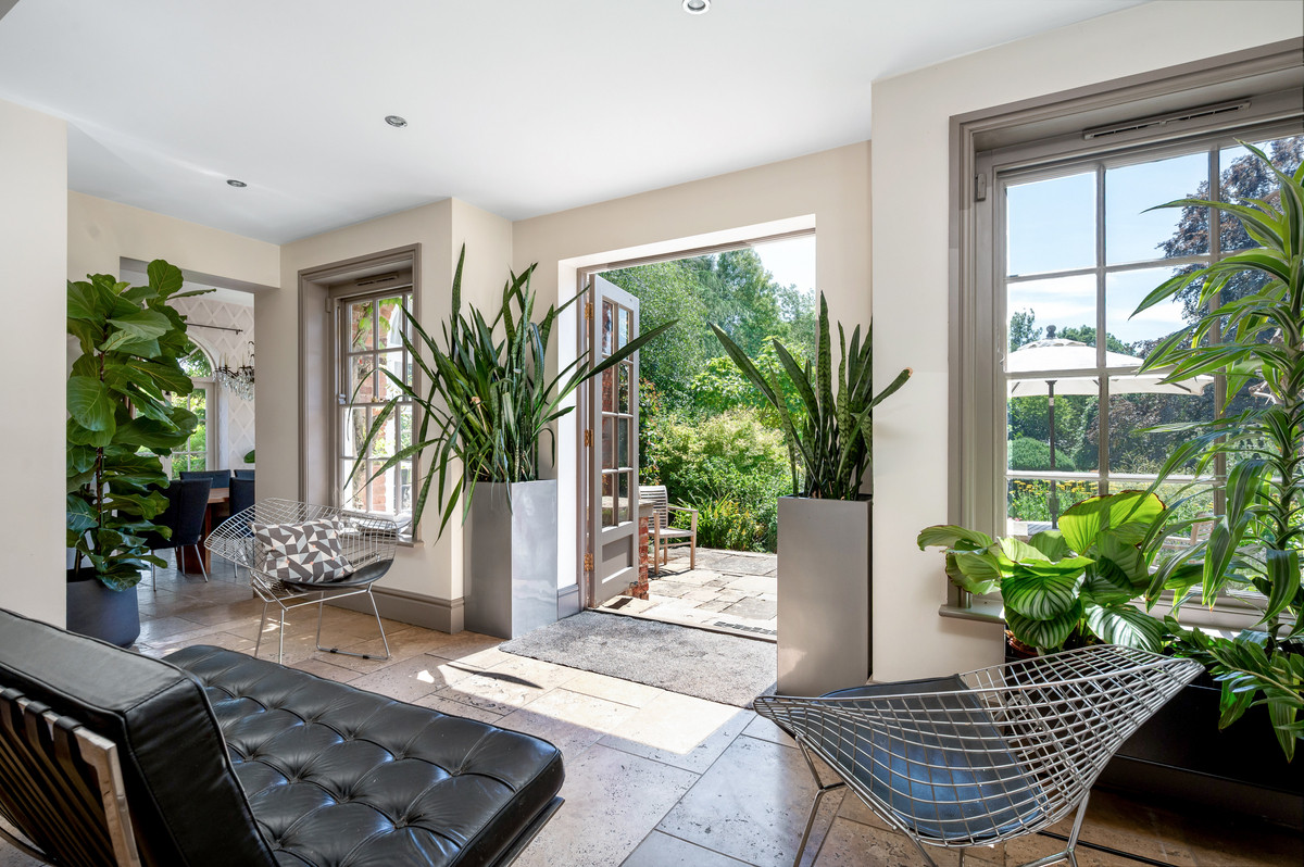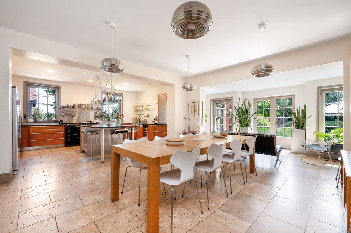 Without doubt, the heart of the home is the generous open-plan kitchen living space, thoughtfully arranged into defined cooking, dining, and sitting areas. Sleek contemporary units are centred around a stylish island, complemented by an AGA and a full range of integrated appliances. The kitchen space flows seamlessly into the dining and sitting zones, with French windows opening out to the garden. Just off this area is a garden room, currently used as a formal dining space.
