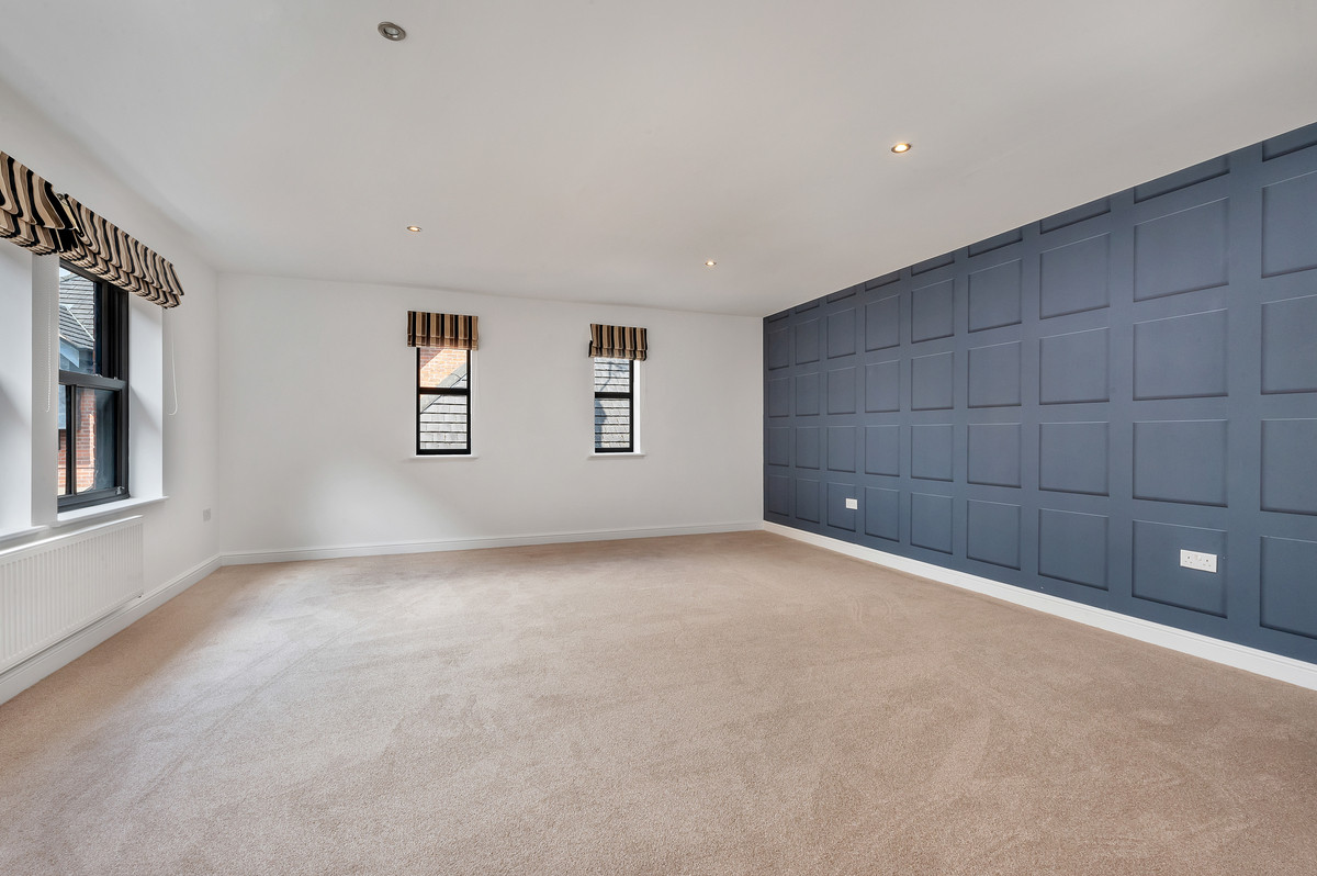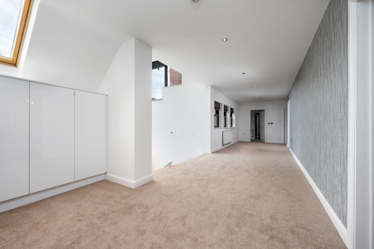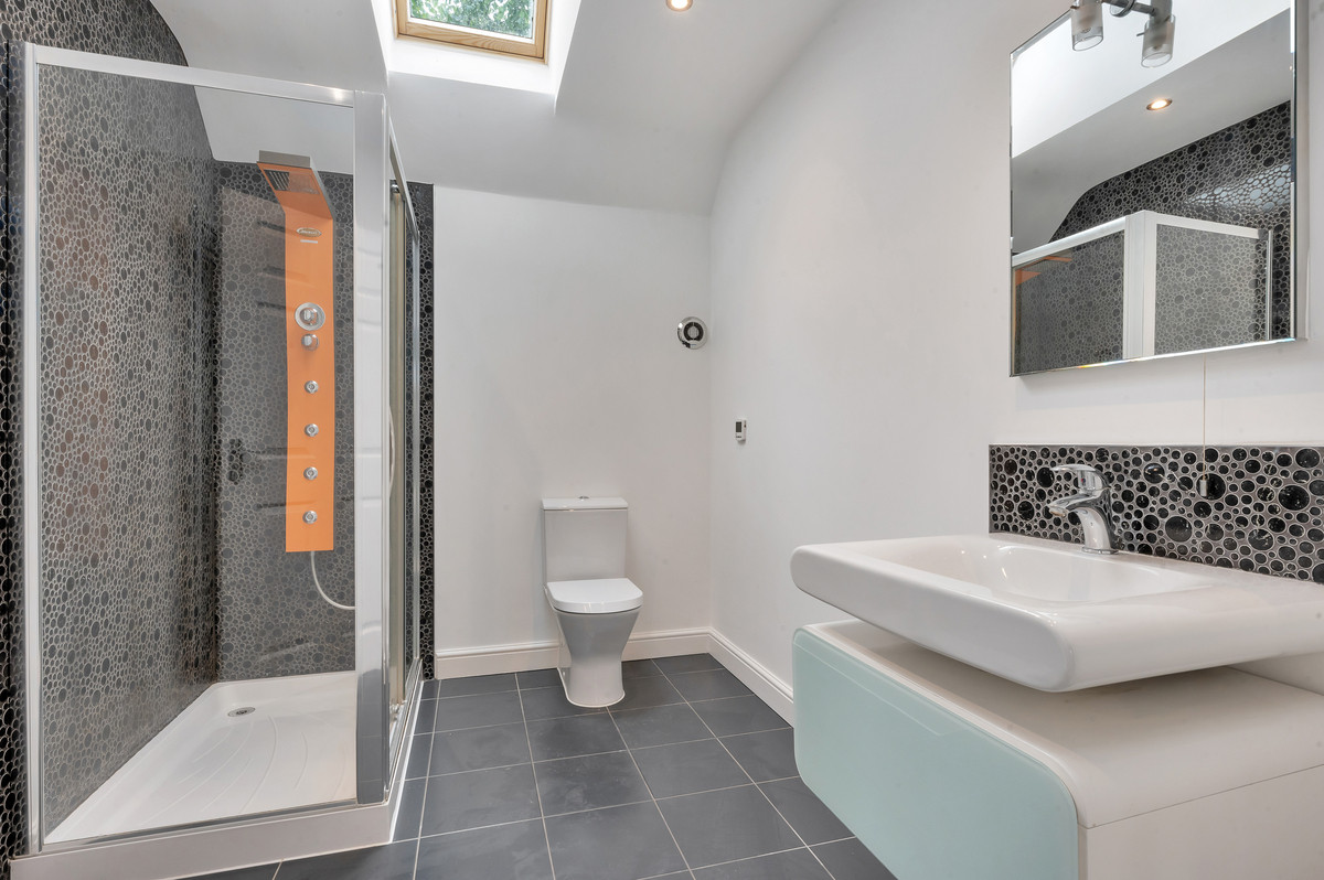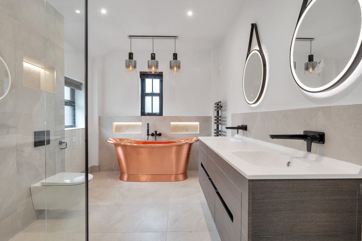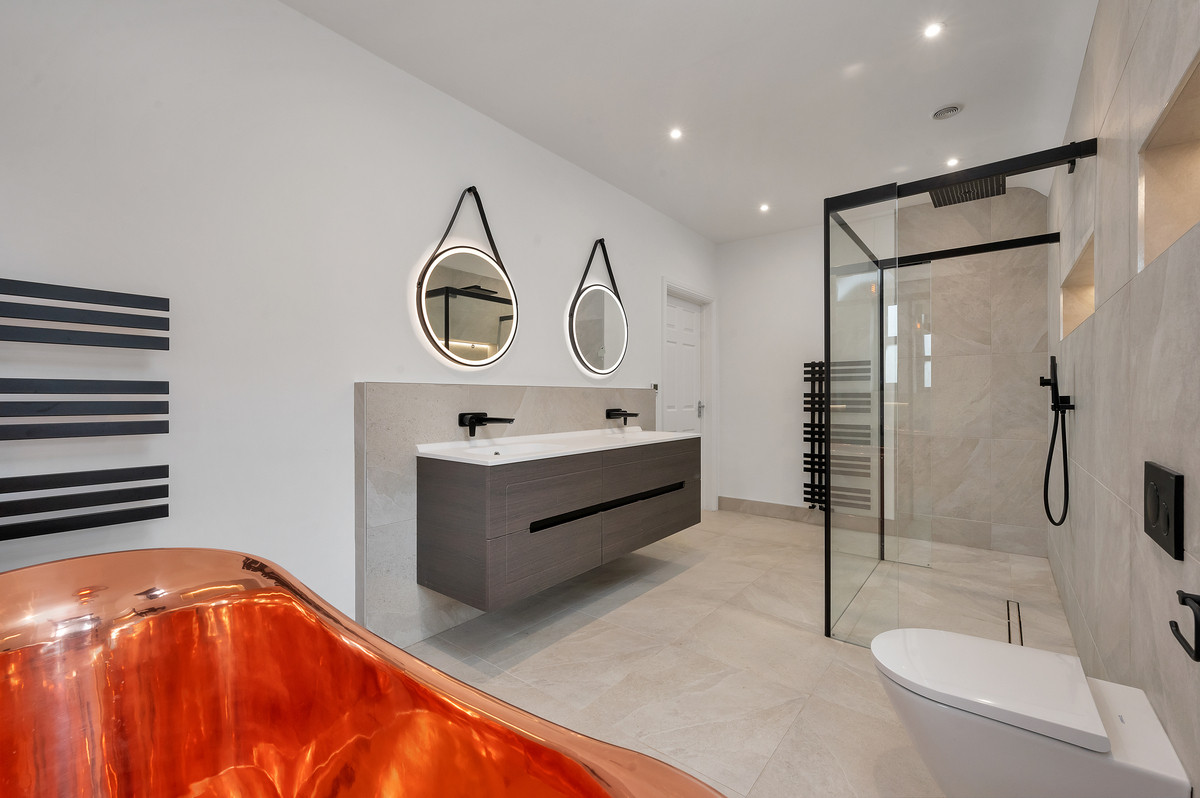 The spacious feel of the ground floor continues on the first, with a substantial landing giving access the accommodation found on this level. The principal suite offers a truly remarkable retreat, comprising of a very generous bedroom boasting a stunning vaulted ceiling and Juliet balcony, a first-class en-suite bathroom fitted to a beautiful standard and a separate dressing room with a range of fitted wardrobes/ cabinetry. Elsewhere you’ll find 5 further double bedrooms, 2 en-suite shower rooms and another stunning room designed by Stephen Christopher, the family bathroom.