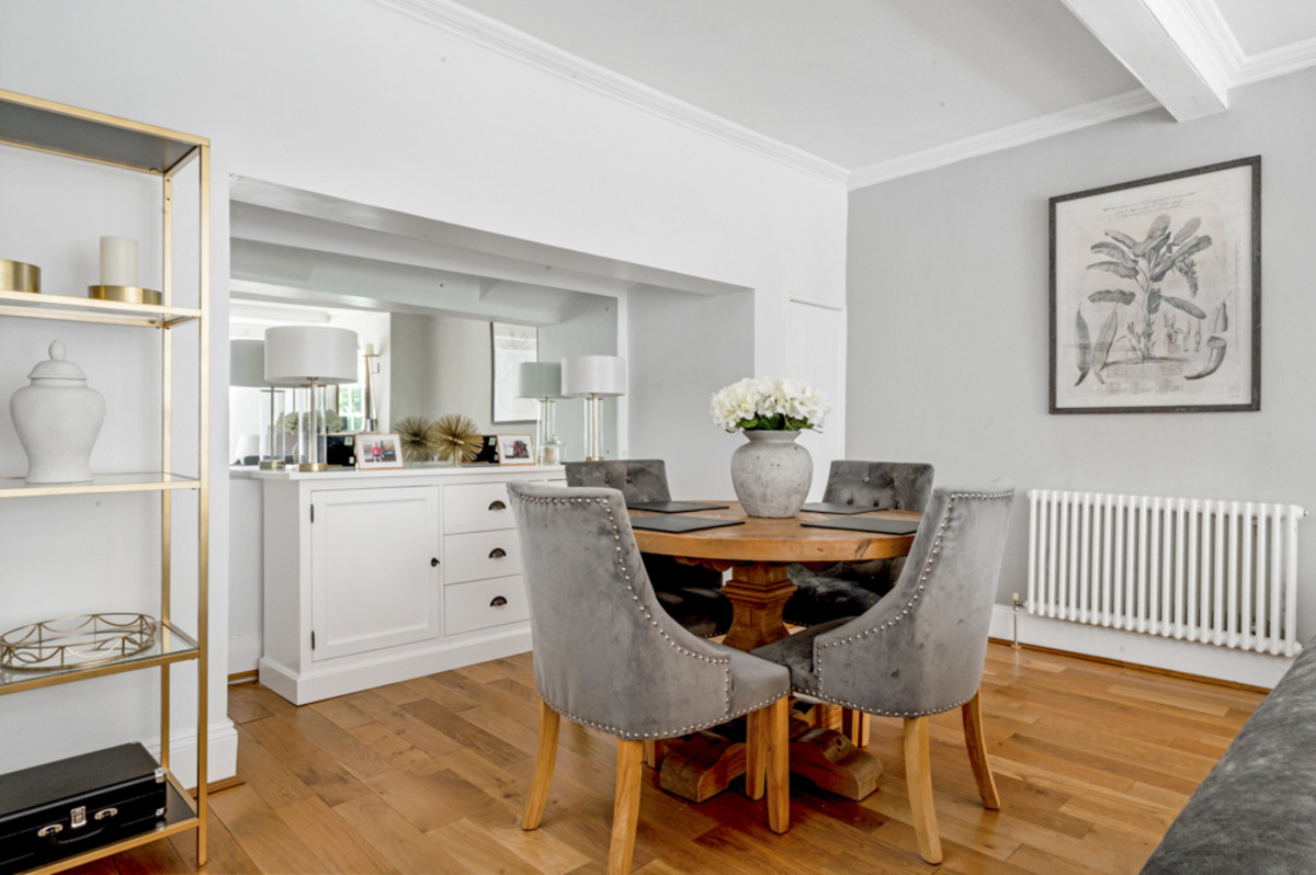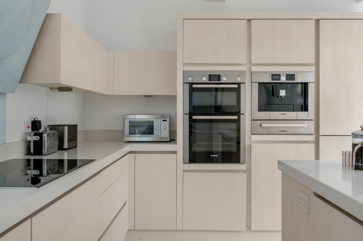 At the heart of the home lies the impressive kitchen, thoughtfully designed around a central island with breakfast bar. An extensive range of integrated appliances makes the space as practical as it is stylish, while dual-aspect windows flood the room with light and provide views over both the driveway and gardens. The kitchen connects seamlessly into a central hallway, a striking feature of the property with its two staircases—allowing easy navigation across all three floors, while offering versatile layouts that lend themselves perfectly to multigenerational living.