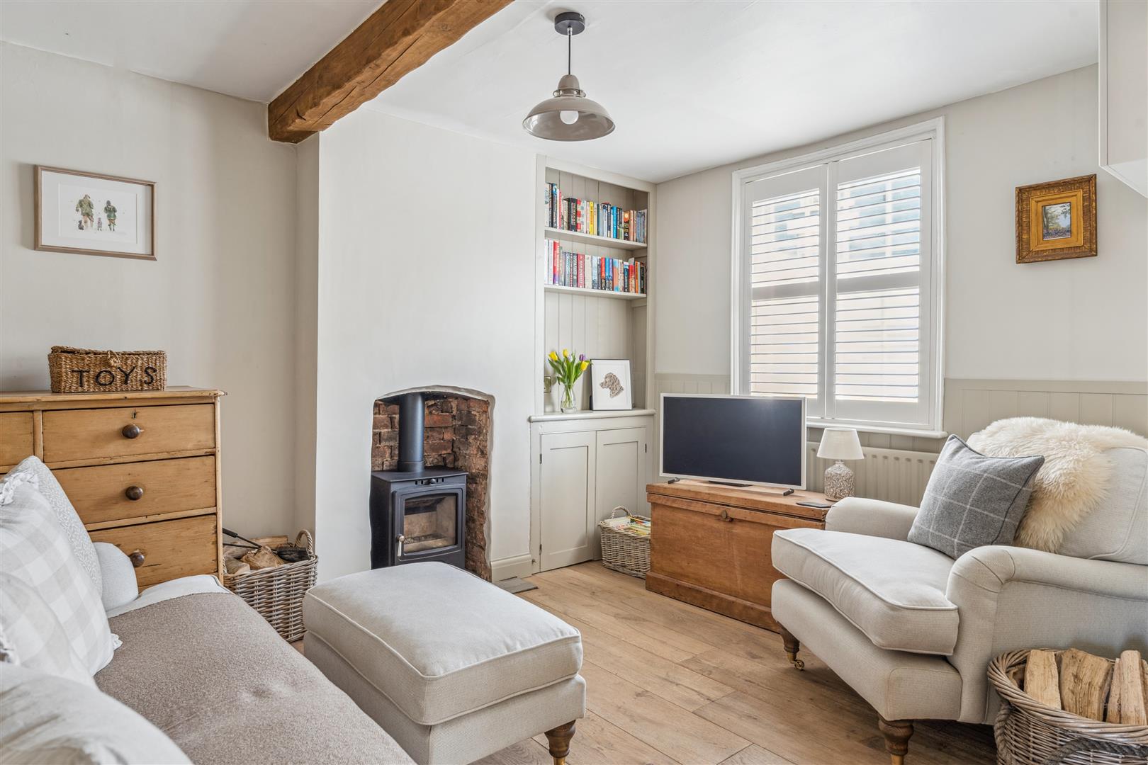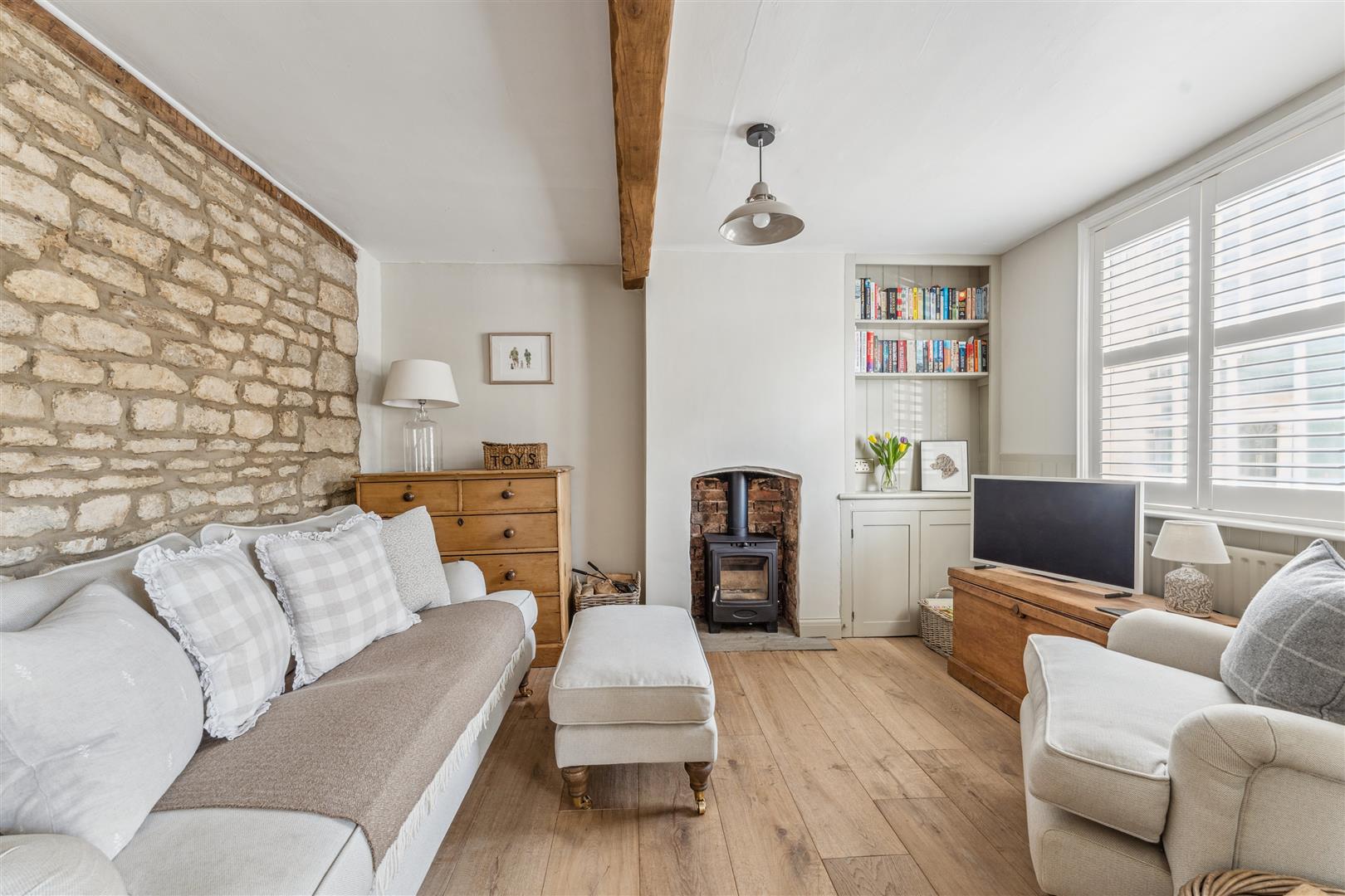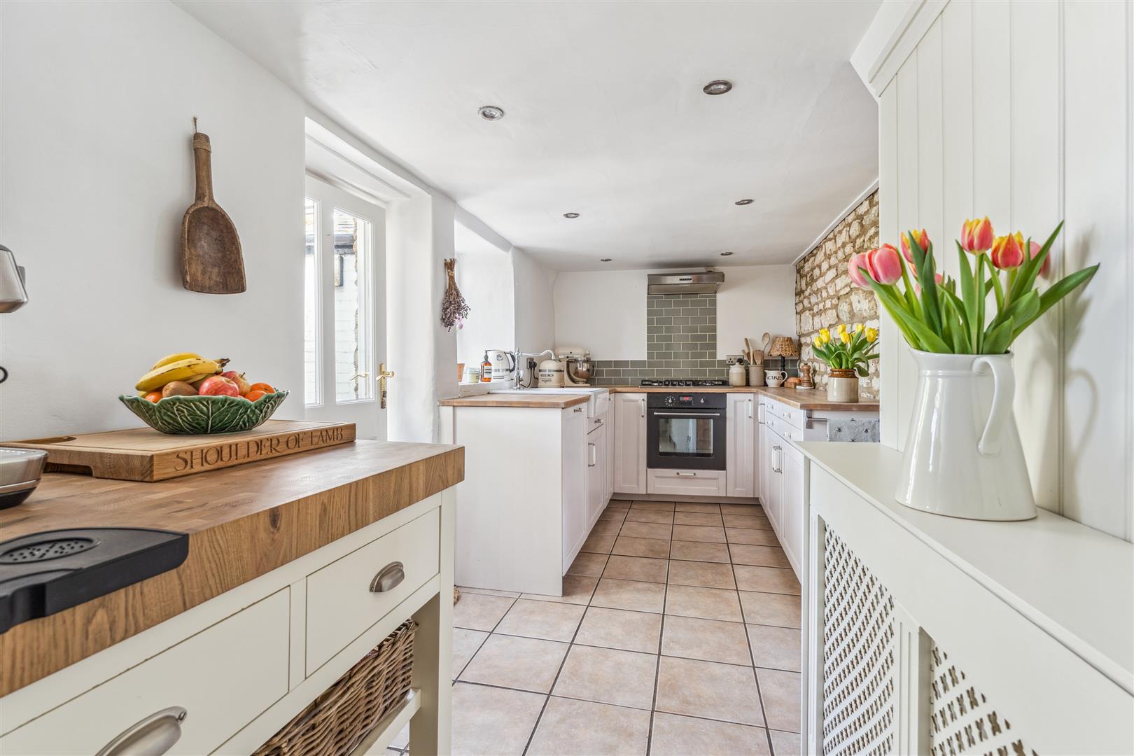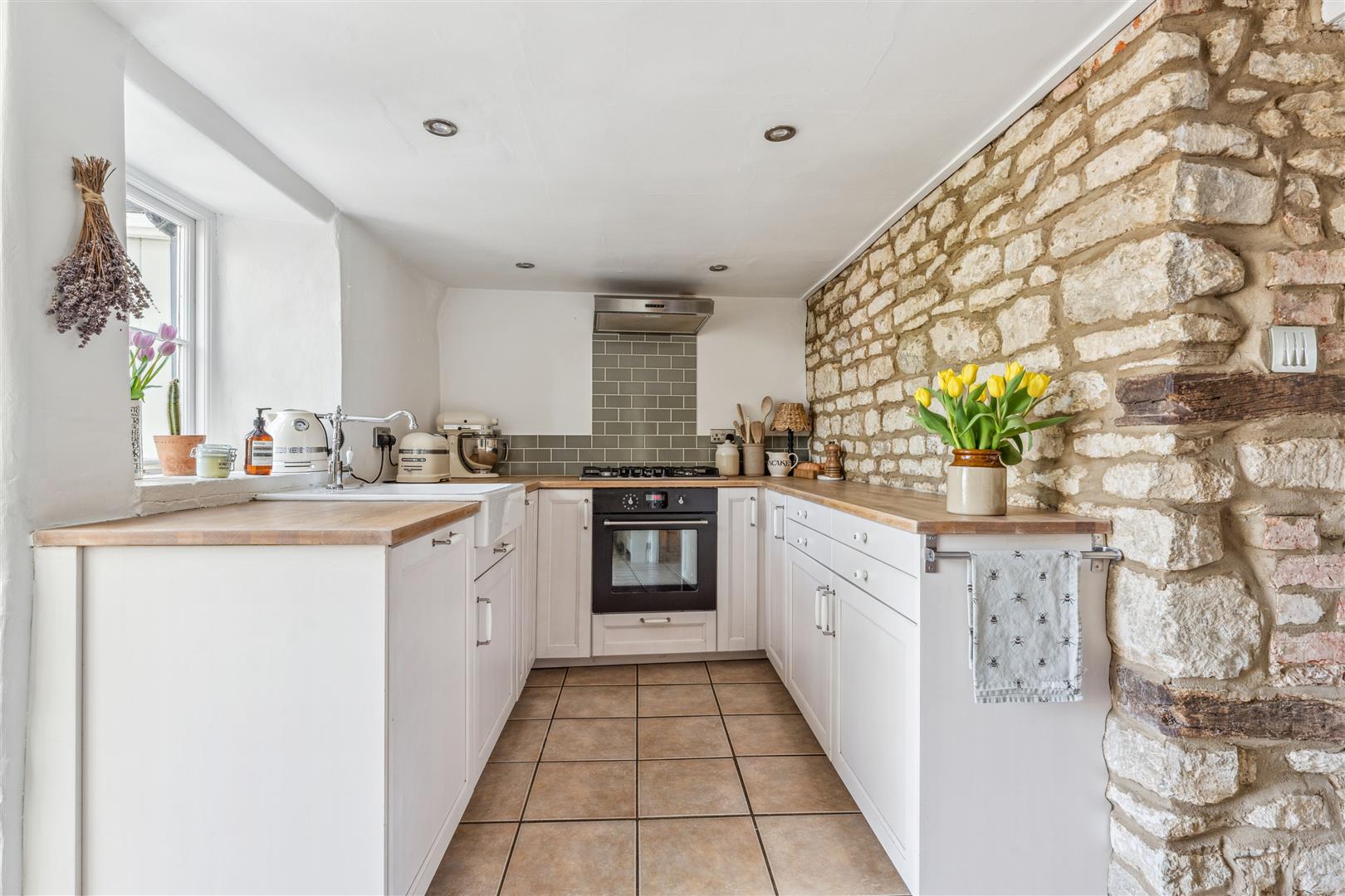 A solid wooden door opens into the sitting room and dining room. The sitting room has a fireplace to one wall housing a wood burning stove whilst alongside are attractive built in cabinets and shelving. Exposed stonework is visible to one wall and there are exposed beams to the ceiling. The window on the front elevation is secondary glazed with bespoke custom fitted blinds. These are fitted to the majority of the windows in the property. The dining room has a former fireplace now performing usefully as a log store. There are built in cupboards to the recess areas and half height wood panelling arranged along one wall. A part glazed door opens to the kitchen at the rear of the property. The kitchen offers a vast array of cabinets arranged to base and high levels. A "Butler" sink stands under a deep sill window looking into the garden. A dishwasher is integrated to the kitchen. The walls have exposed stonework in areas and the flooring is tiled whilst there is recessed lighting to the ceiling. A door opens into the garden and a staircase rises to the first floor and the bedroom and bathroom accommodation. There are three bedrooms, two of which have retained former fireplaces as interesting features. Two of the bedrooms also have areas of wood panelling to the walls and the two bedrooms to the front have secondary glazing. The family bathroom has a panelled bath with shower attachments, WC and wash basin with vanity cupboards under. Tiling is applied to the splash areas and there is an integrated wall mounted mirror. A shower cubicle stands independently and a ladder radiator is mounted to one wall.