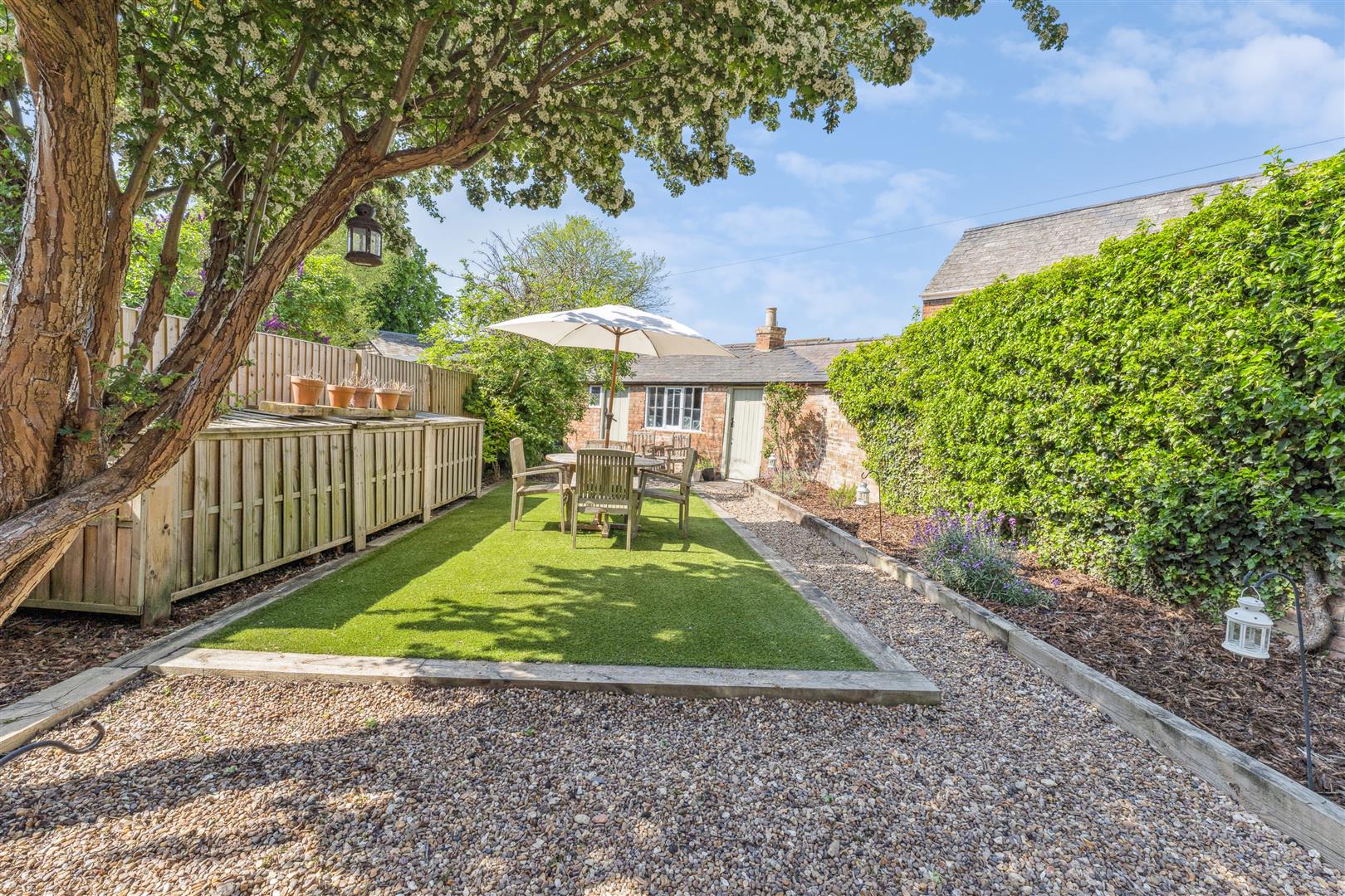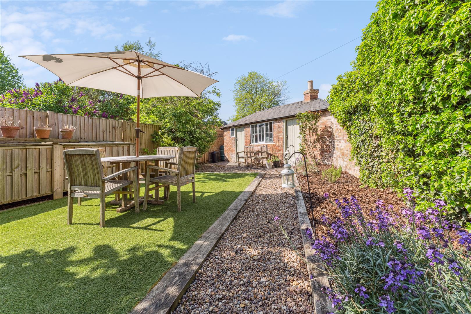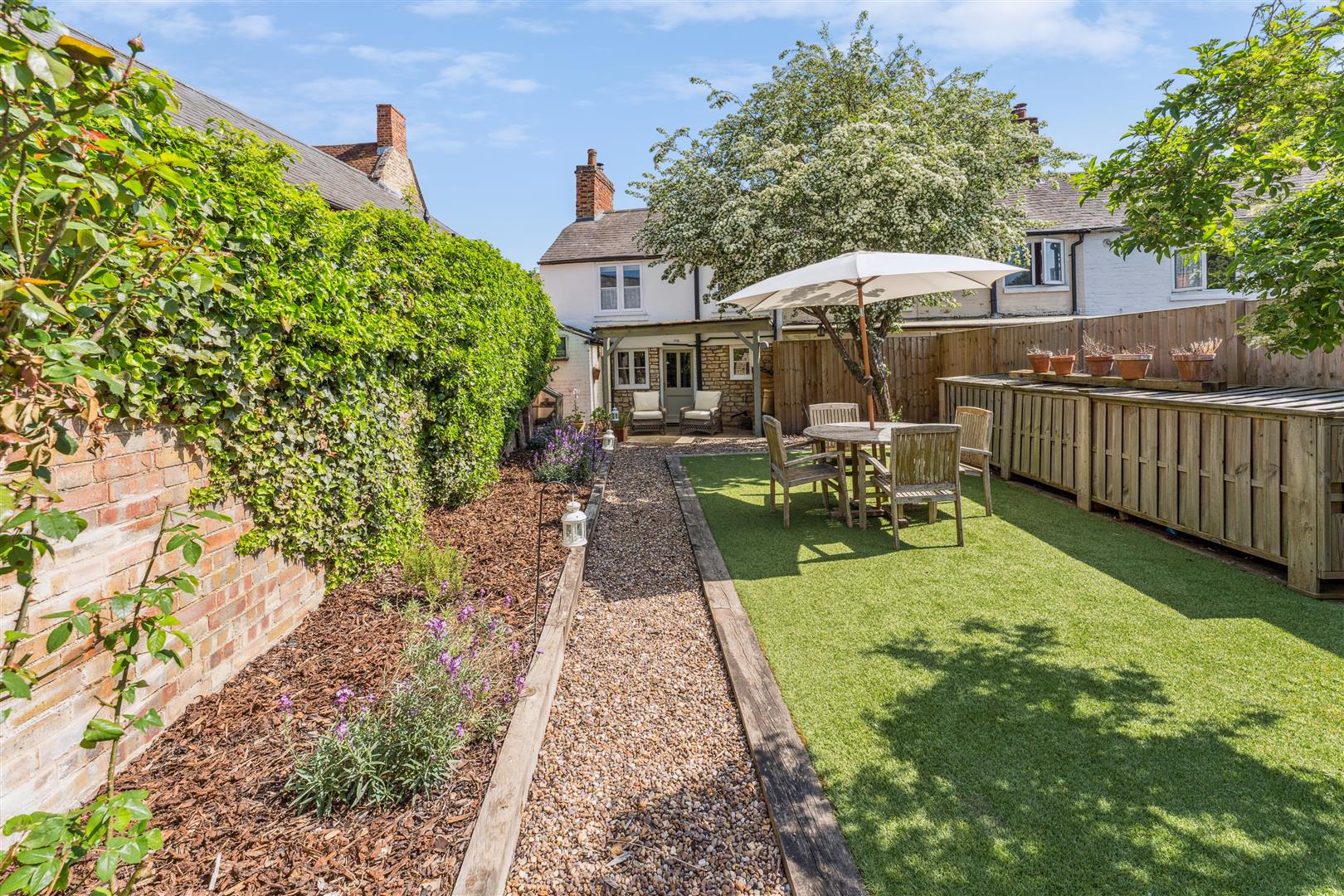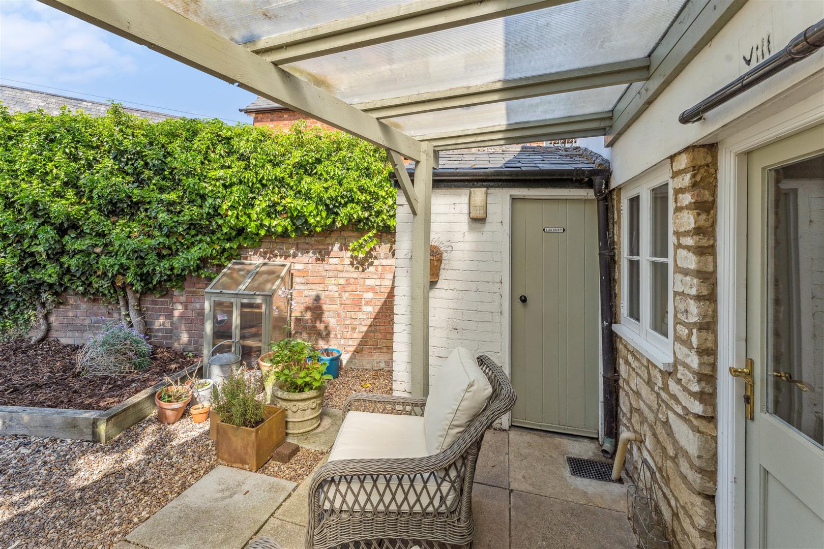 The garden to the rear is enclosed within fencing and a brick wall and a perspex canopy extends from the rear of the property to give helpful protection from the elements when accessing the laundry room which also houses the central heating boiler. The garden is west facing and neatly arranged with sleepers defining a central square of ornamental grass. A gravel pathway meanders around the borders where there is planting in raised beds. To the bottom of the garden are good size storage barns which could convert into a convenient home office facility if required otherwise they offer very useful external store areas.