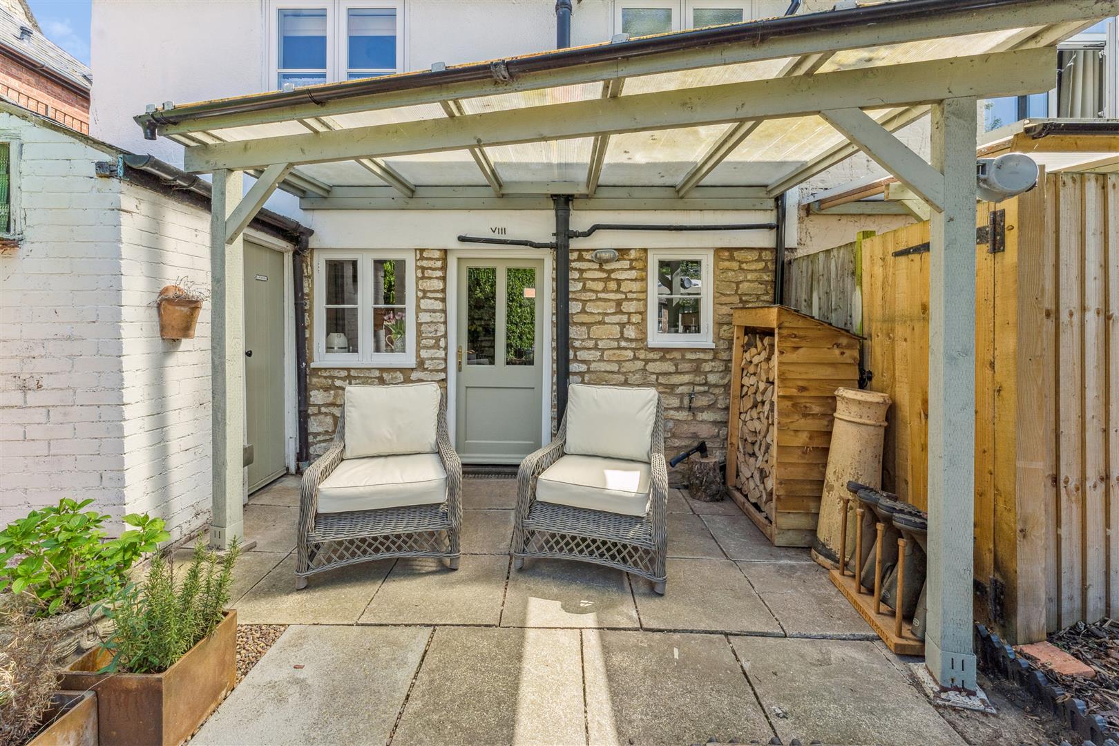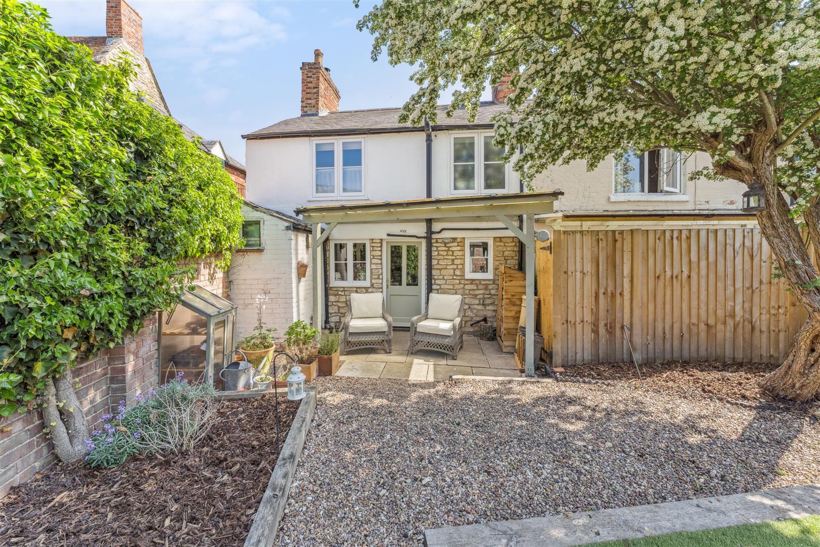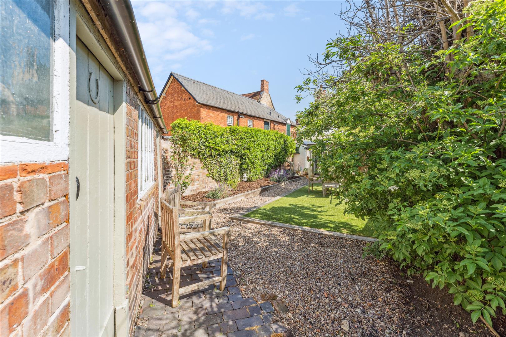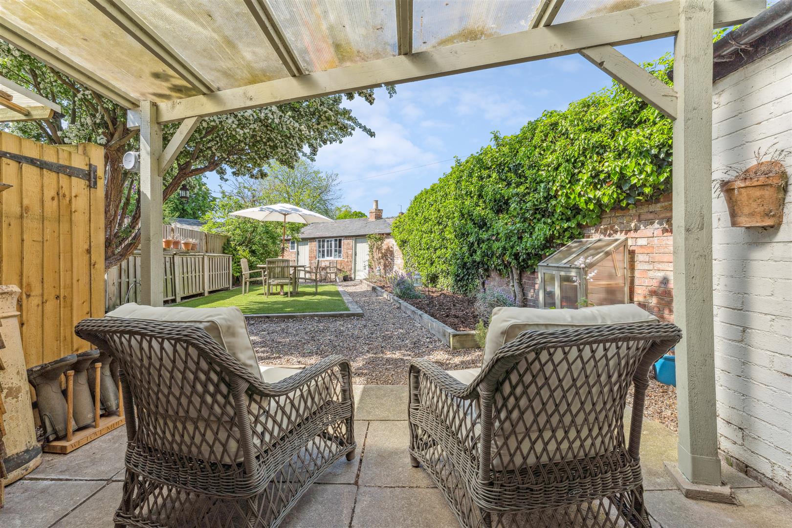 The garden to the rear is enclosed within fencing and a brick wall and a perspex canopy extends from the rear of the property to give helpful protection from the elements when accessing the laundry room which also houses the central heating boiler. The garden is west facing and neatly arranged with sleepers defining a central square of ornamental grass. A gravel pathway meanders around the borders where there is planting in raised beds. To the bottom of the garden are good size storage barns which could convert into a convenient home office facility if required otherwise they offer very useful external store areas.