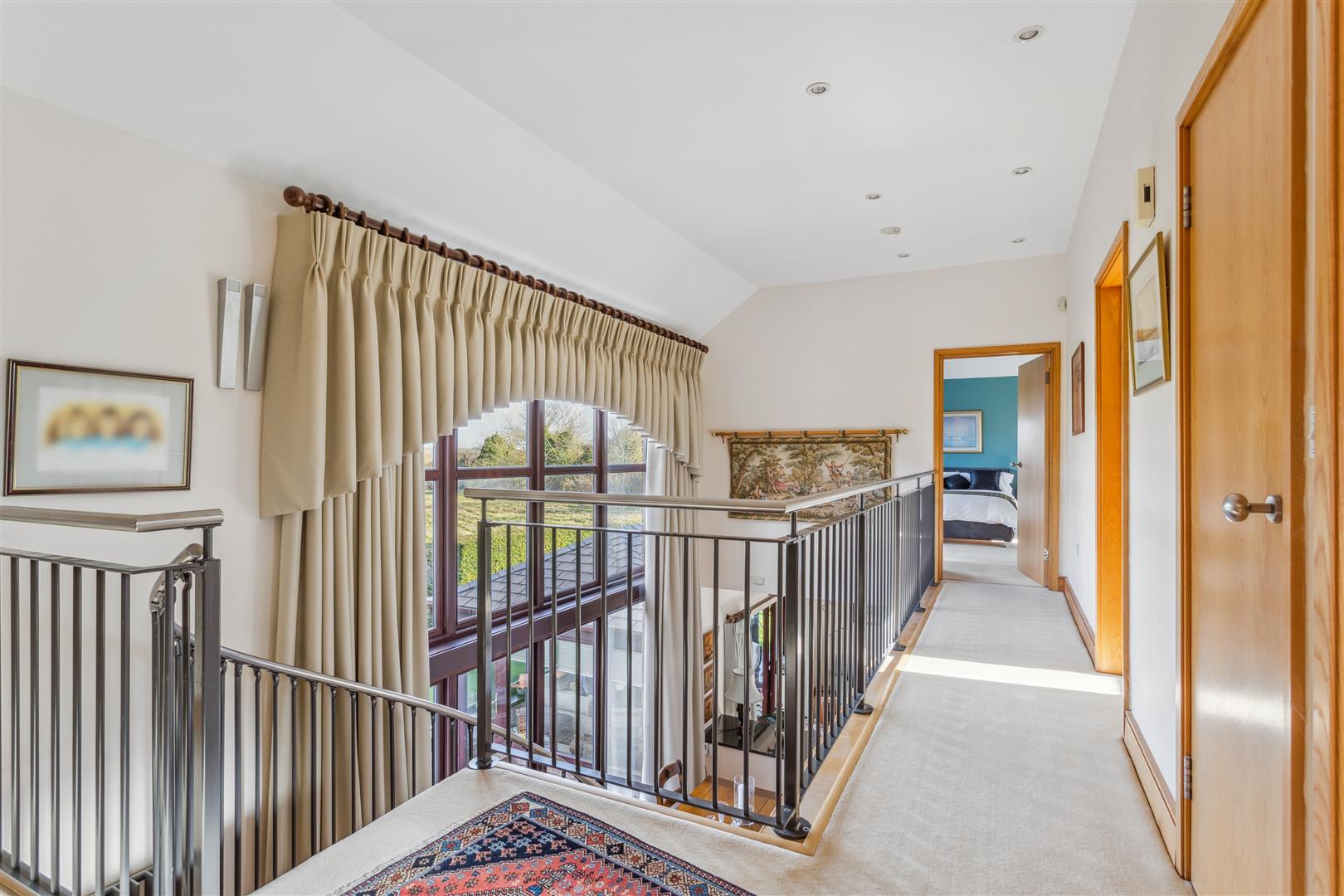 A spiral staircase rises to the first floor landing and minstrel gallery from where there are stunning views over rolling countryside. There are four bedrooms on the first floor, the master bedroom having en suite facilities, a dressing area and a Juliet balcony fronting a pair of glazed doors. There are panoramic views from this room which looks in an easterly direction towards the morning sun. All bedrooms have fitted wardrobes and the guest bedroom has Jack and JIll access to the well equipped and fully tiled family bathroom.