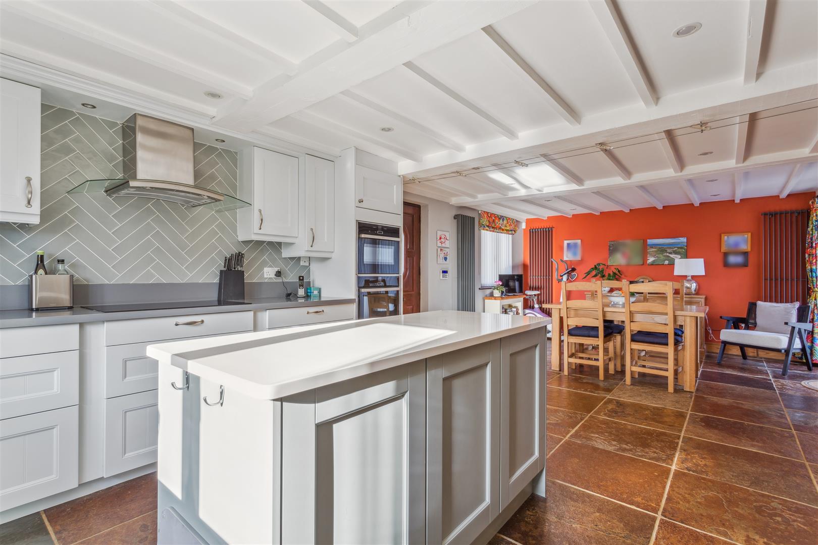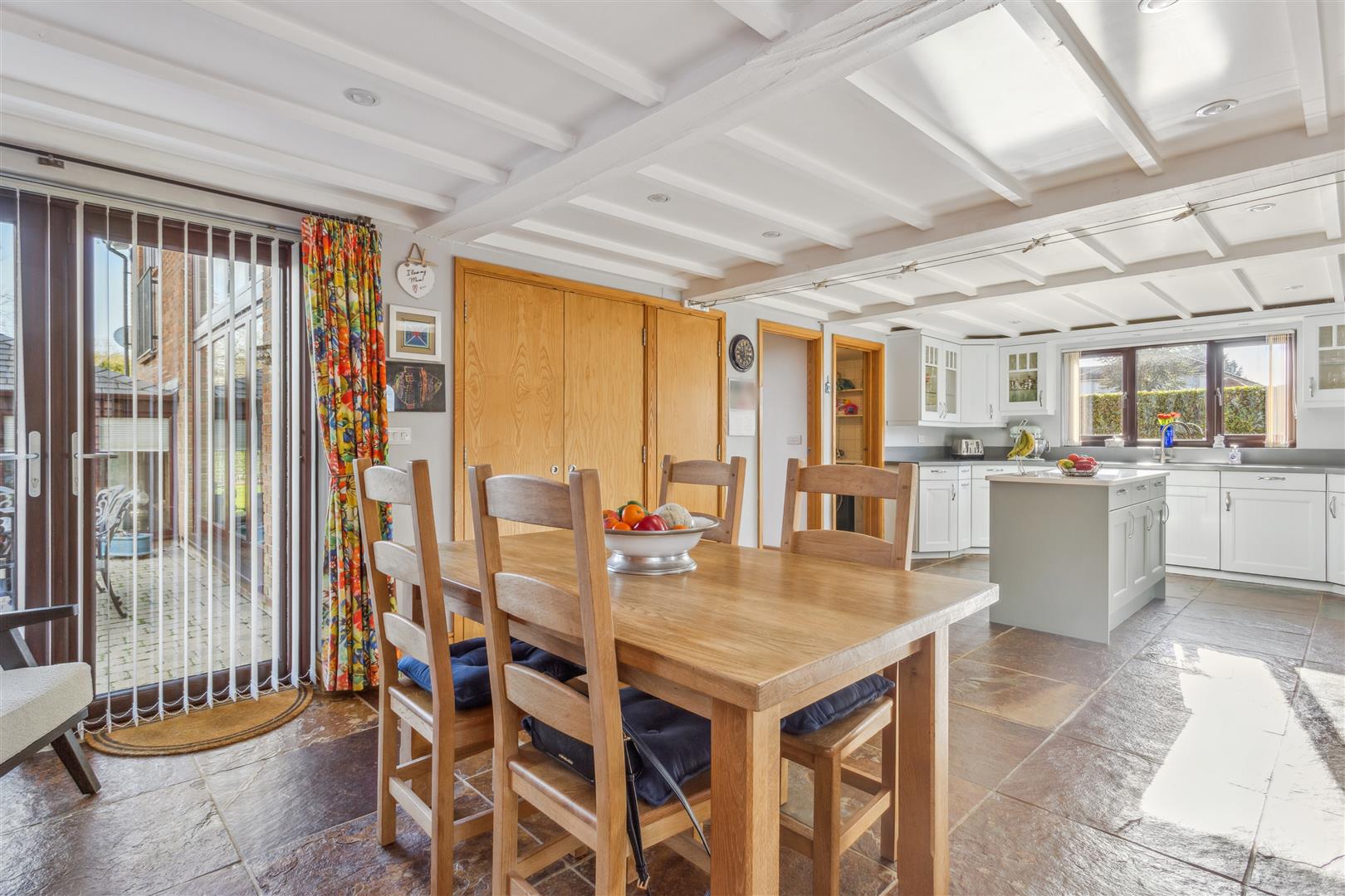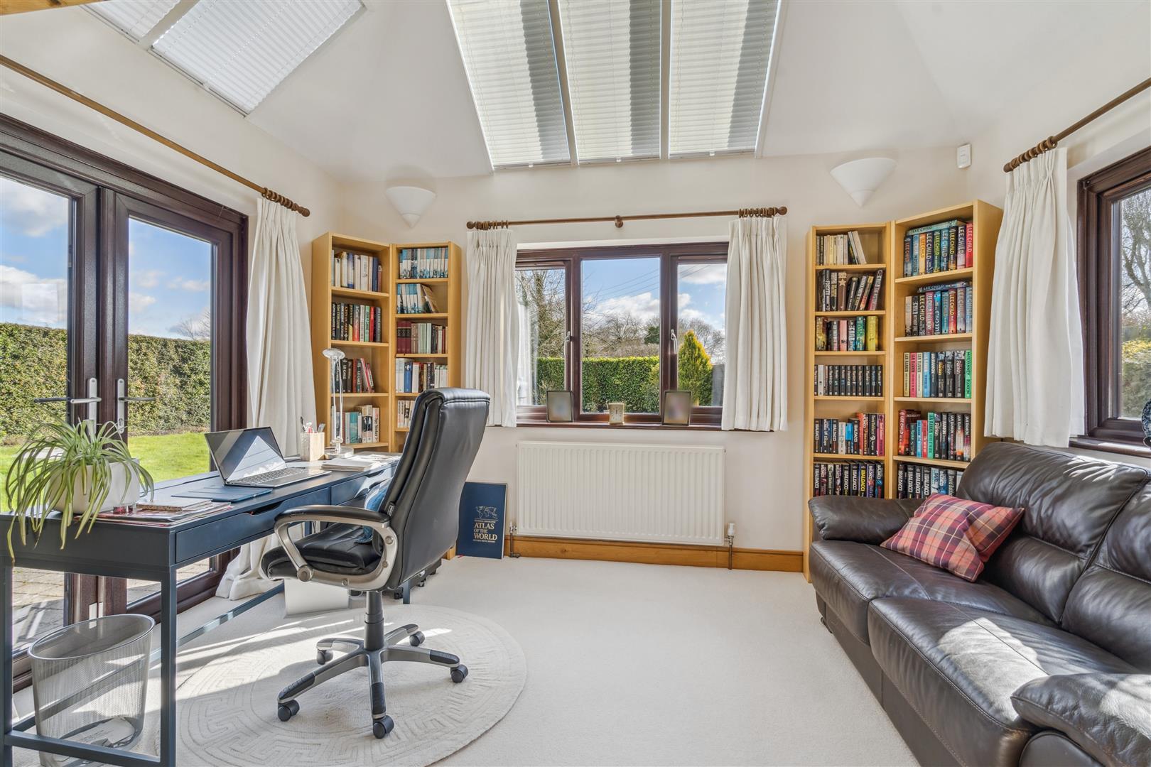 A solid wooden door with a glazed insert and matching side panels opens into a spacious area of hall incorporating a cloakroom and walk in storage cupboard. The flooring is in York slate which extends into the cloakroom. Double wooden doors open to the main reception areas, in this instance immediately to the dining room with its breath taking vaulted ceiling and the ground to first floor picture window. Quite an enthralling introduction to this fine home. From the dining area there are steps down into the sitting room with its free standing wood burning stove and exposed flue visibly rising to the roof. Double doors open from the sitting room to the garden room which is glazed to three sides with exit doors and window openers. A cosy, light and airy room in which to relax at any time of year. From the sitting room there are doors to a comfortable study with an exposed "A" frame and glazed doors and windows on three aspects. Velux rooflights also assist in providing exceptional natural light to this room.