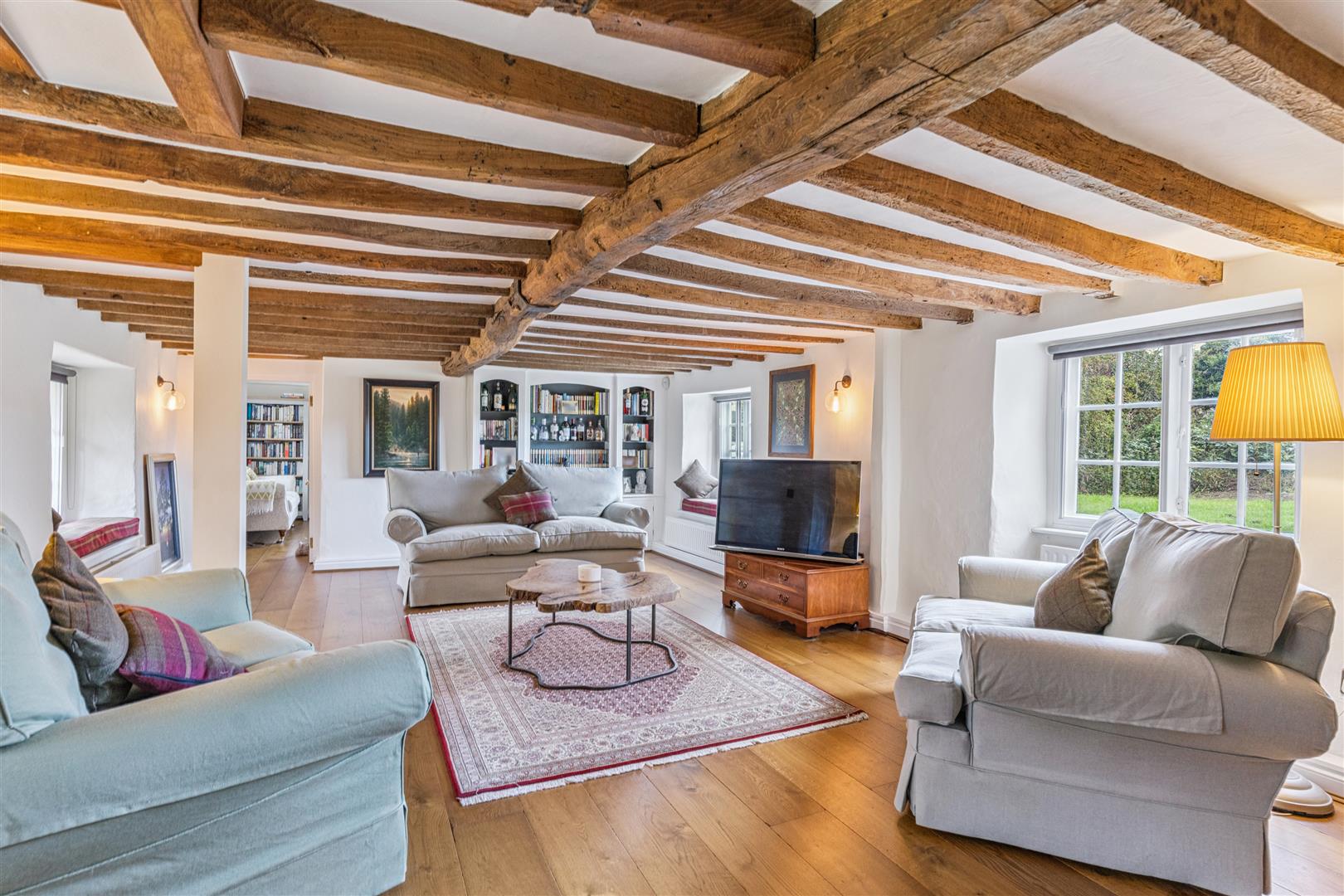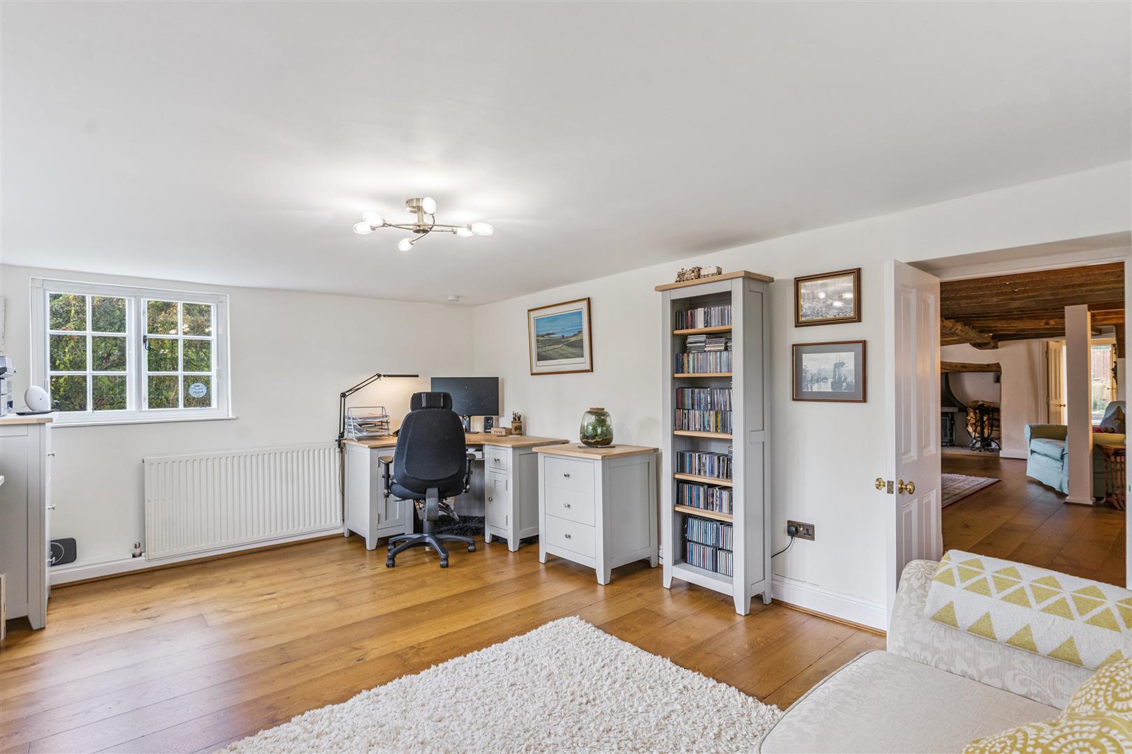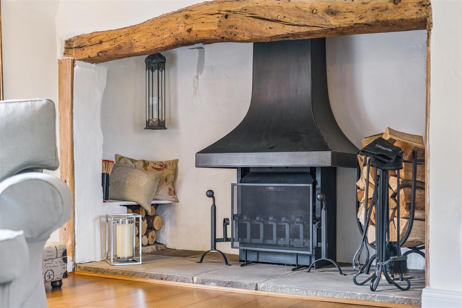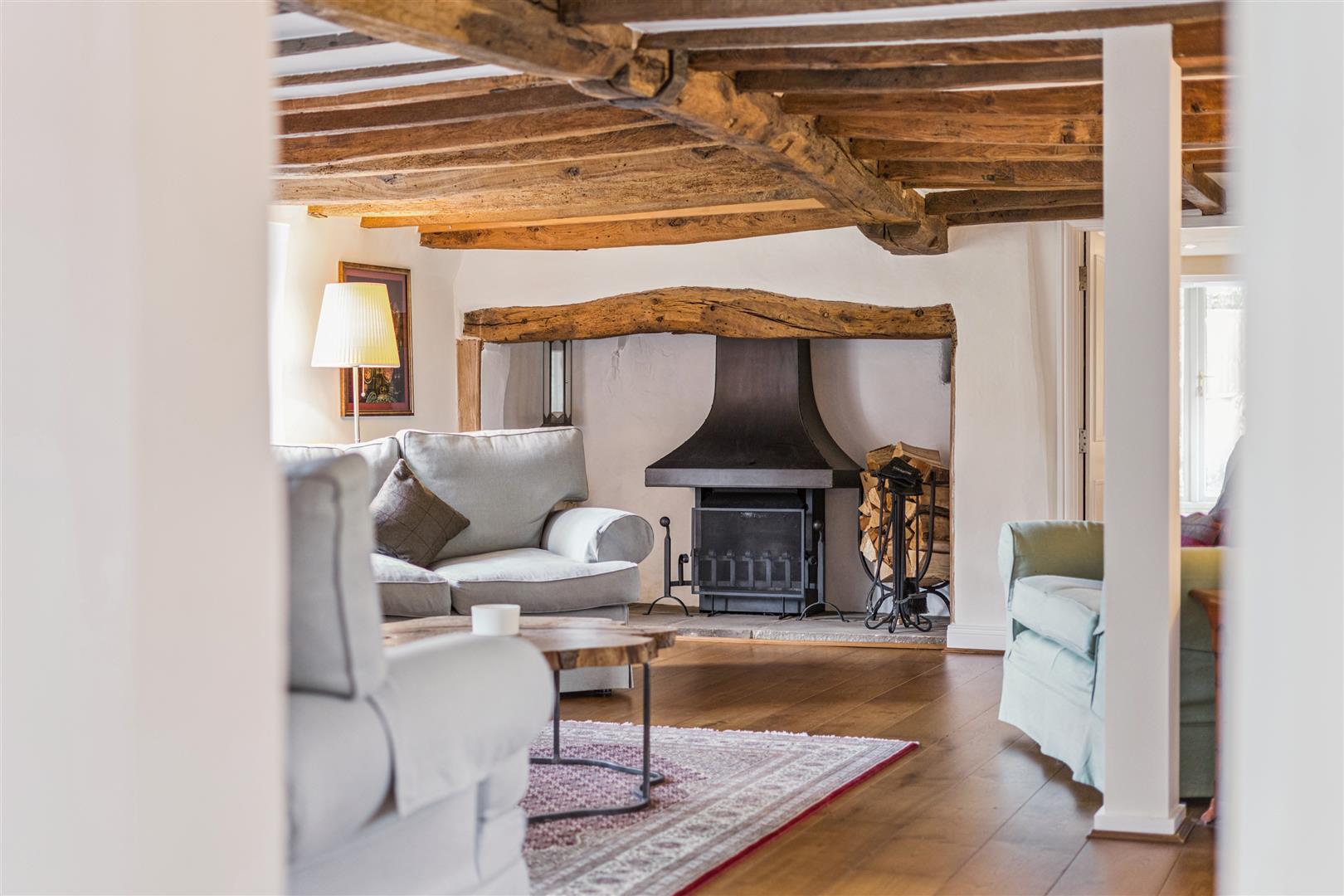 A solid wooden door opens into a splendid reception vestibule with views through to the magnificent garden room. A staircase rises to the first floor from this room which has flooring in engineered oak. This flooring extends through to the sitting room which has a beamed ceiling and features an impressive inglenook fireplace with a notable bressummer beam over. Internally, the inglenook has a large fire canopy and flagstone floor. Around this room are several windows with bench seating allowing a flood of natural light to pervade the room. A built in cabinet with shelving and base cupboard units stands in an alcove to one corner. Beyond the sitting room is an additional reception room currently used as a study, another very light room with triple aspect windows. The engineered oak flooring is also evident in this room.