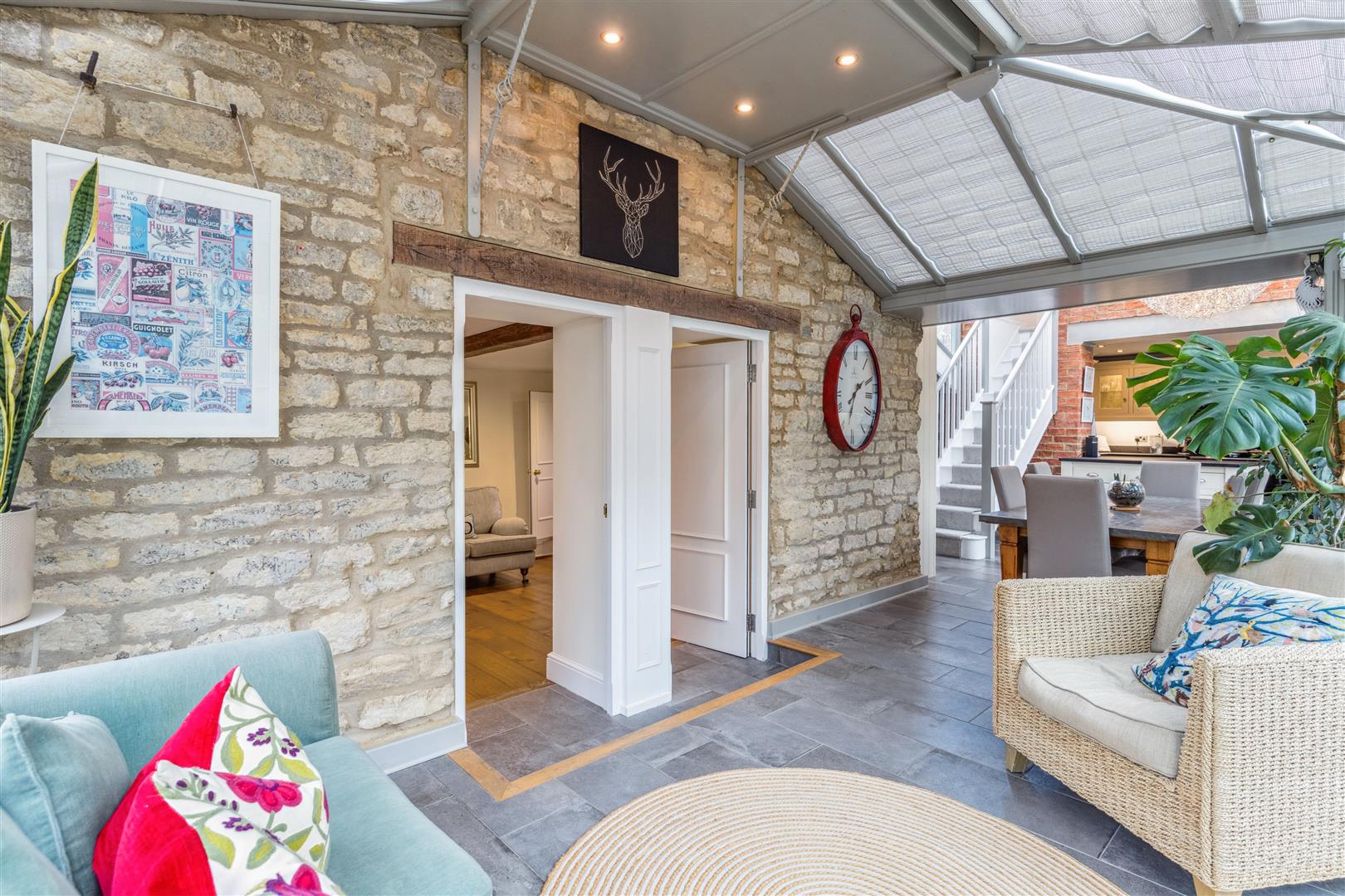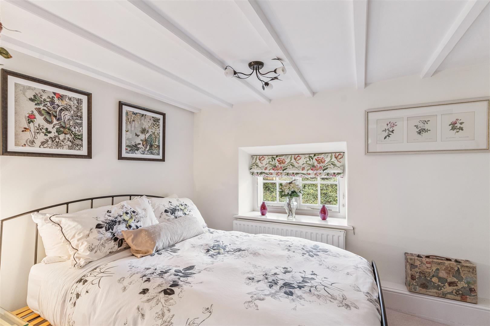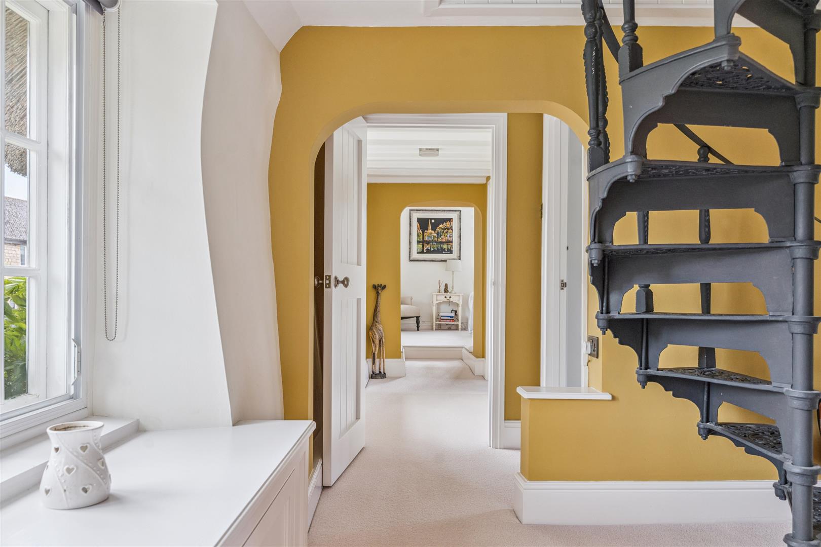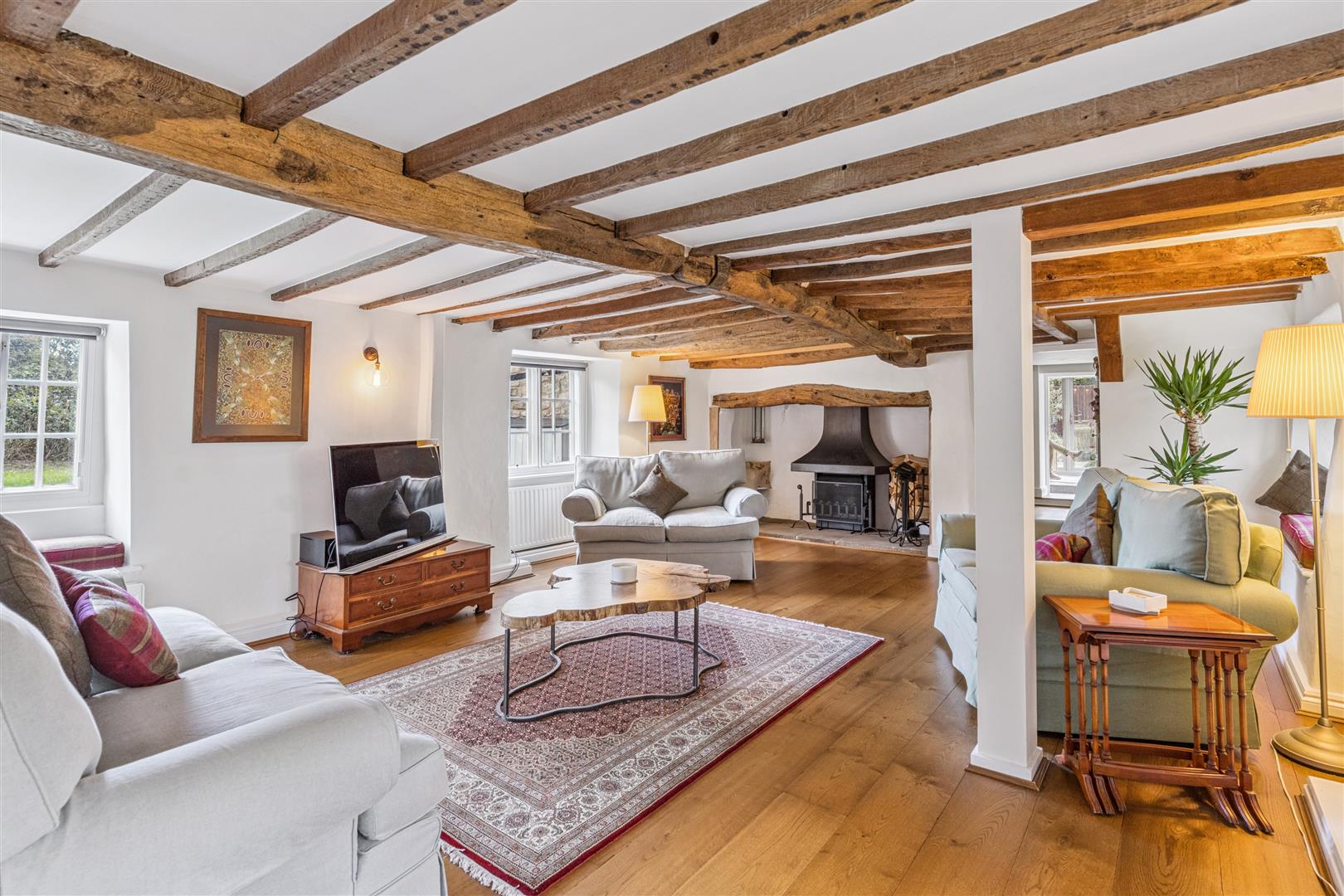 A solid wooden door opens into a splendid reception vestibule with views through to the magnificent garden room. A staircase rises to the first floor from this room which has flooring in engineered oak. This flooring extends through to the sitting room which has a beamed ceiling and features an impressive inglenook fireplace with a notable bressummer beam over. Internally, the inglenook has a large fire canopy and flagstone floor. Around this room are several windows with bench seating allowing a flood of natural light to pervade the room. A built in cabinet with shelving and base cupboard units stands in an alcove to one corner. Beyond the sitting room is an additional reception room currently used as a study, another very light room with triple aspect windows. The engineered oak flooring is also evident in this room.