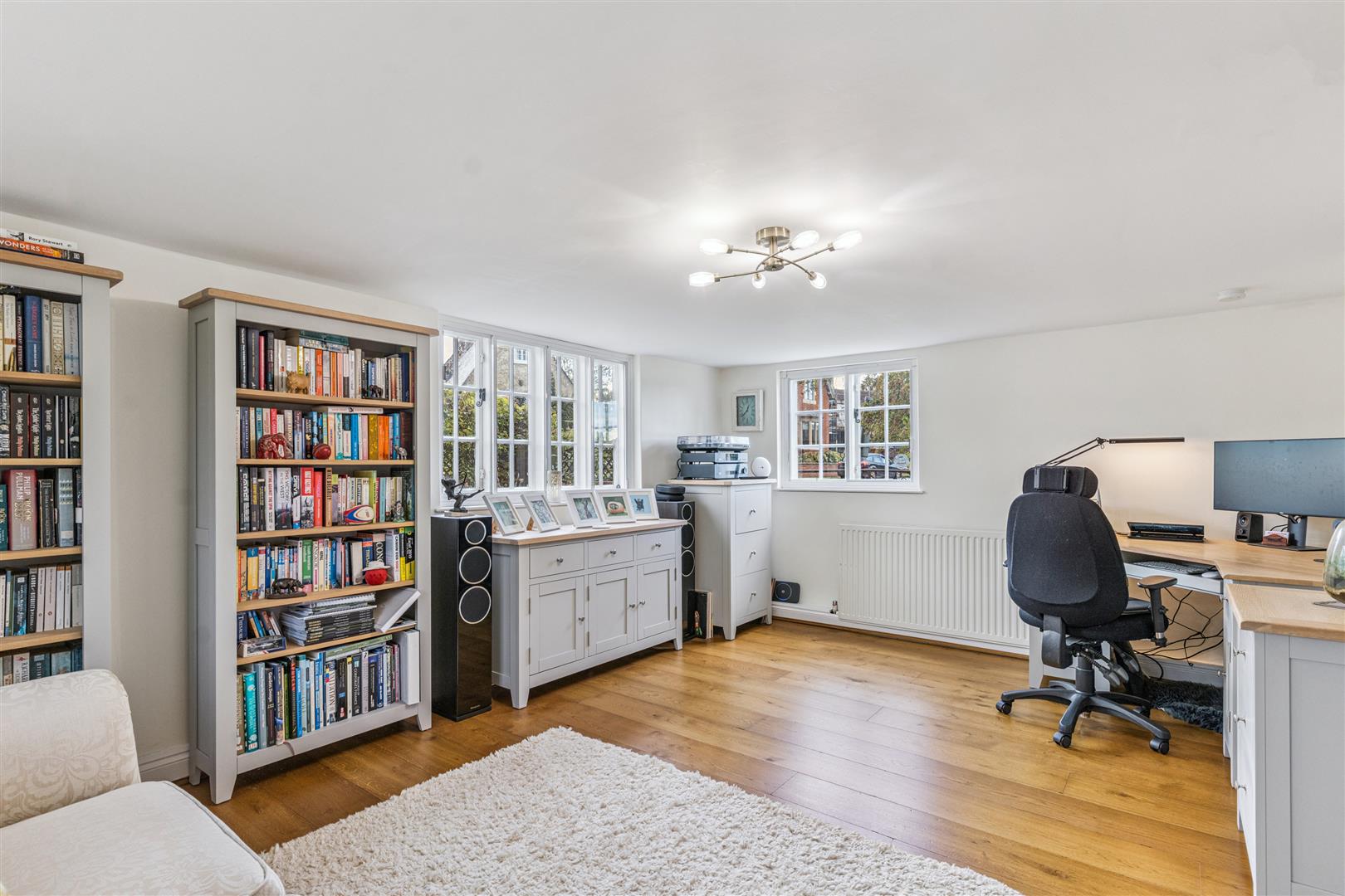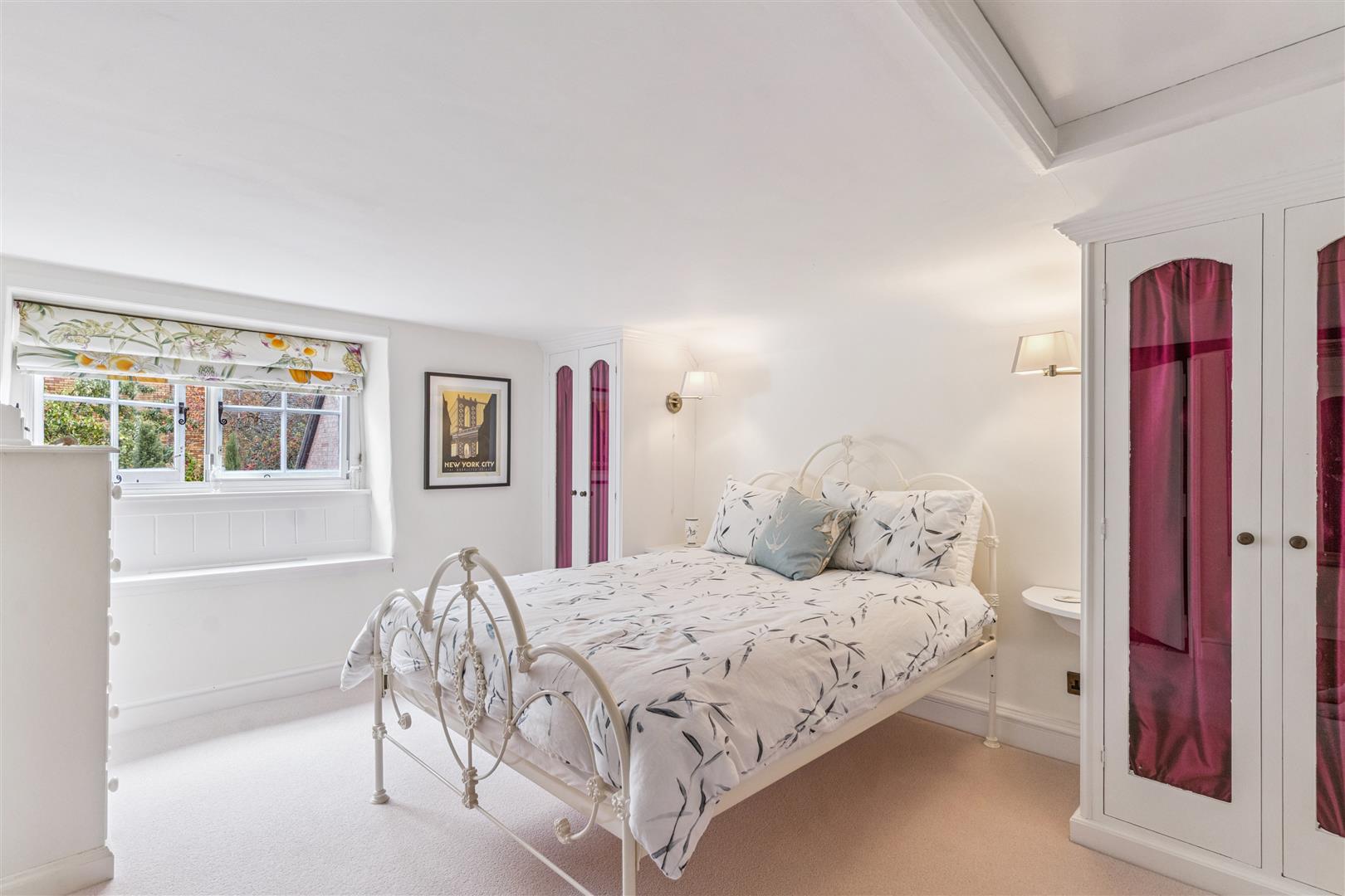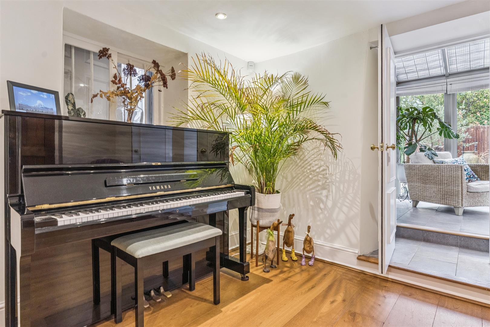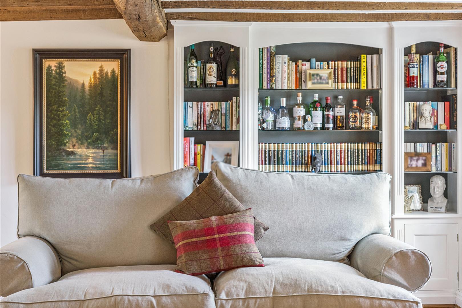 A solid wooden door opens into a splendid reception vestibule with views through to the magnificent garden room. A staircase rises to the first floor from this room which has flooring in engineered oak. This flooring extends through to the sitting room which has a beamed ceiling and features an impressive inglenook fireplace with a notable bressummer beam over. Internally, the inglenook has a large fire canopy and flagstone floor. Around this room are several windows with bench seating allowing a flood of natural light to pervade the room. A built in cabinet with shelving and base cupboard units stands in an alcove to one corner. Beyond the sitting room is an additional reception room currently used as a study, another very light room with triple aspect windows. The engineered oak flooring is also evident in this room.
