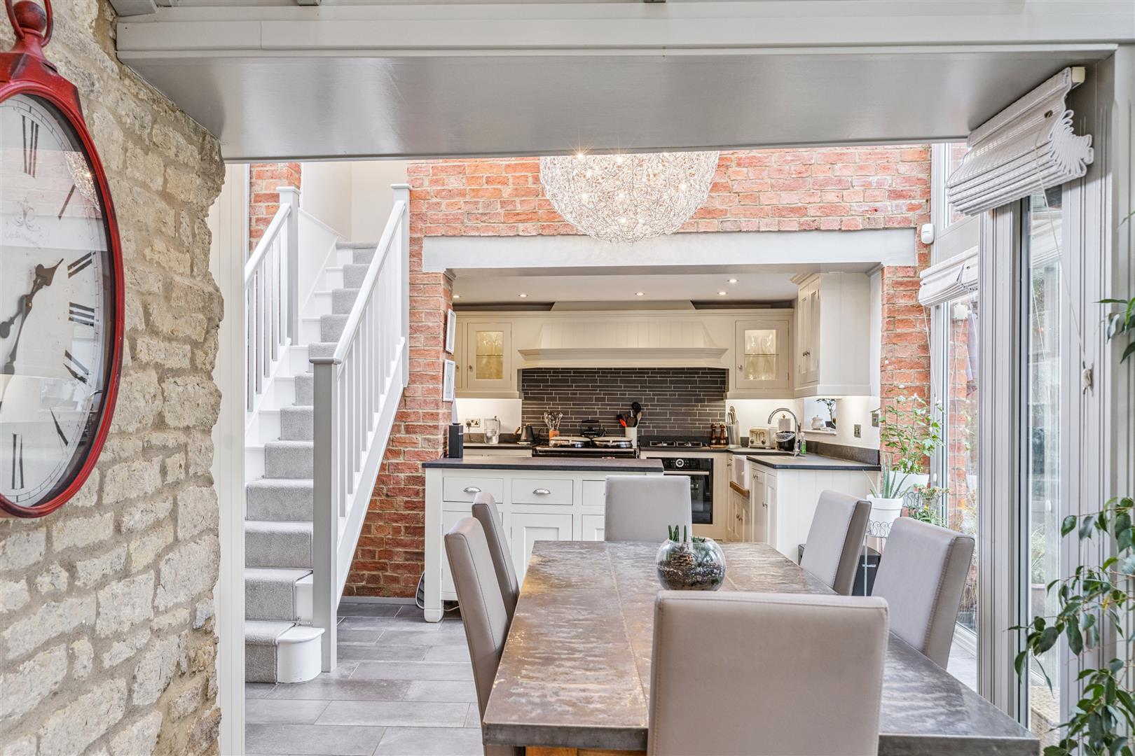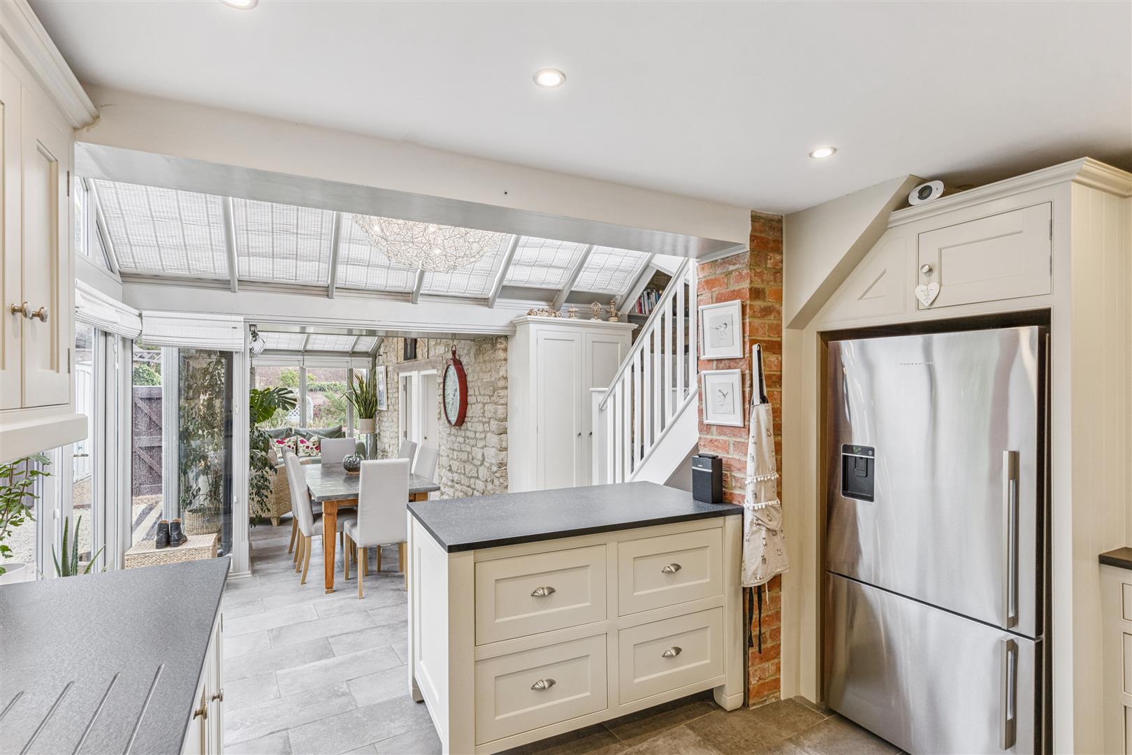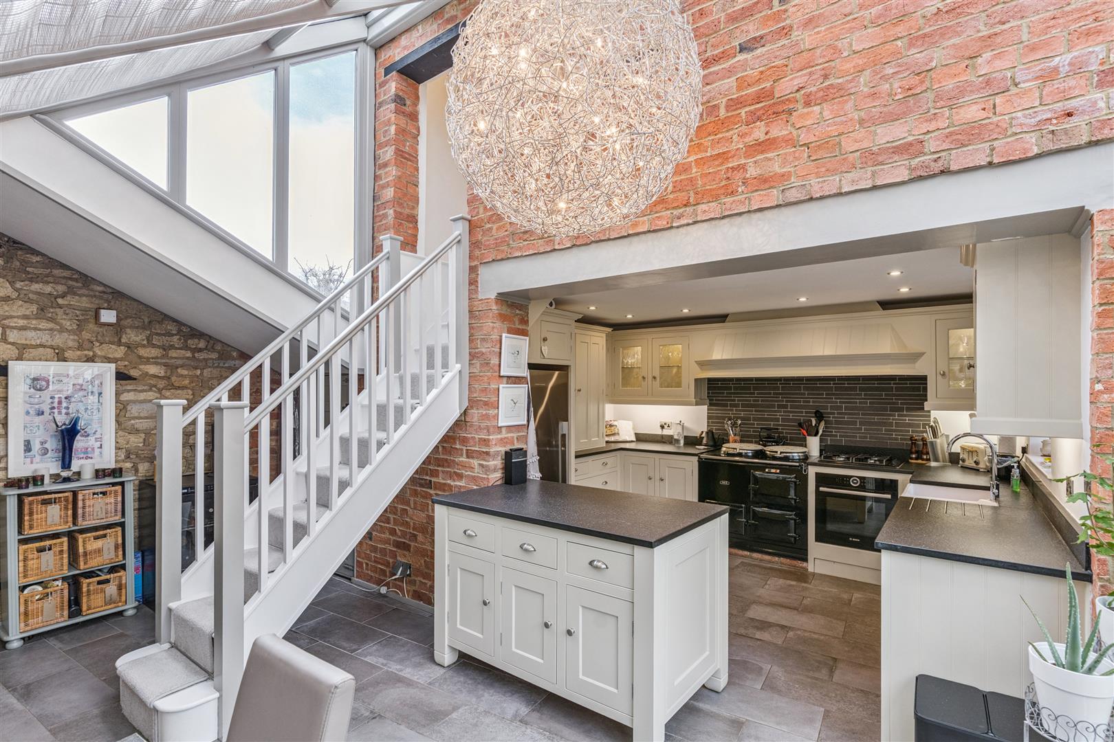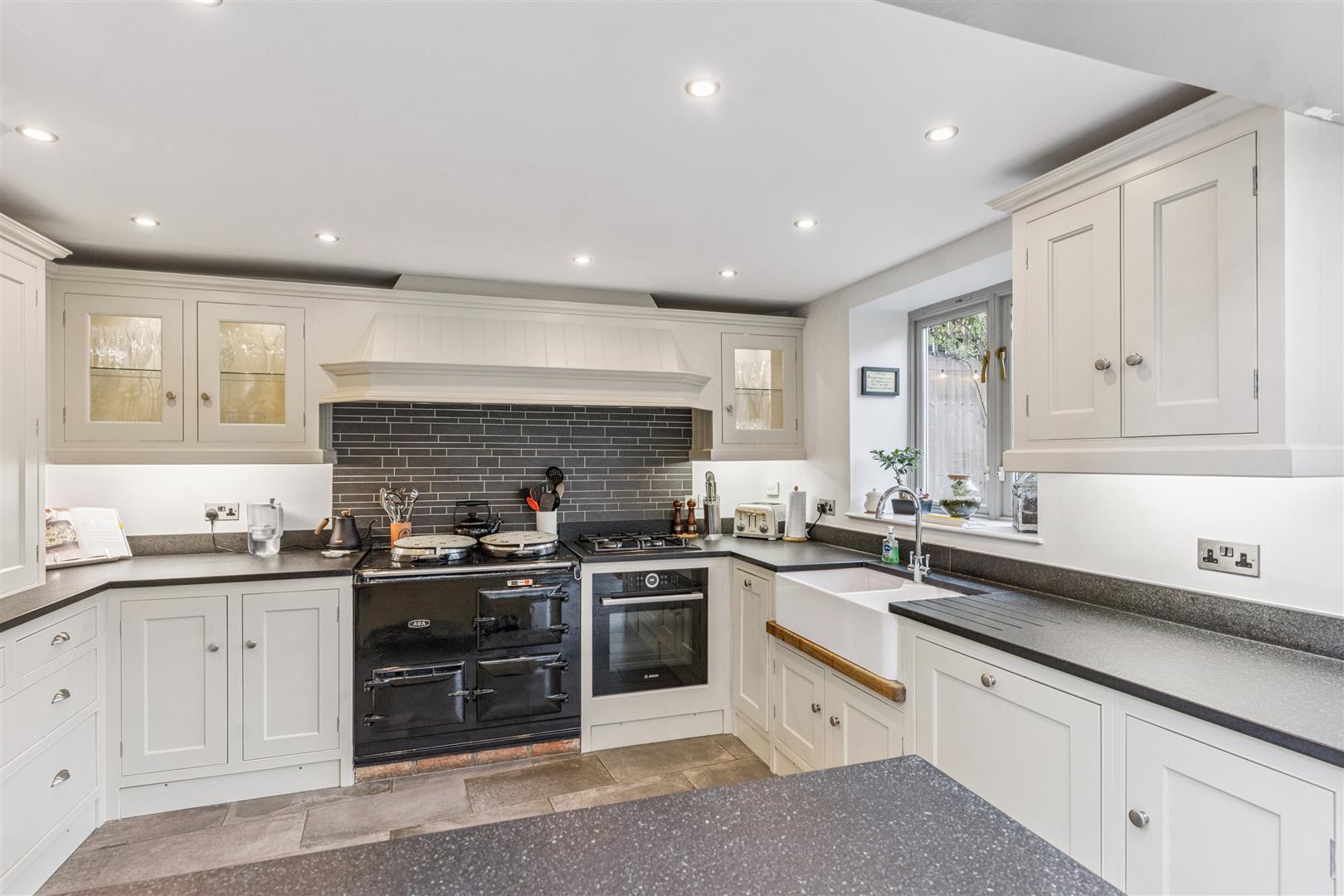 Returning to the reception vestibule and looking to the opposite direction there are 2 doorways opening to additional reception areas within the stunning contemporary garden room which accommodates a seating area, dining area and the kitchen. This area is predominantly glazed with smaller sections of exposed stone and brick walling. Glazed doors give access to the private and sheltered garden. There are dropdown and ceiling blinds to give protection from excessive sunlight. The kitchen is well fitted with an array of wall and base cupboards. The kitchen incorporates a "Butler" sink and an "AGA" oven located alongside a companion oven both being fuelled by gas. An inner lobby gives access to a cloakroom and utility room. From the kitchen a staircase rises to the first floor where there is a double bedroom with a vaulted ceiling and a closet housing a WC and wash basin.