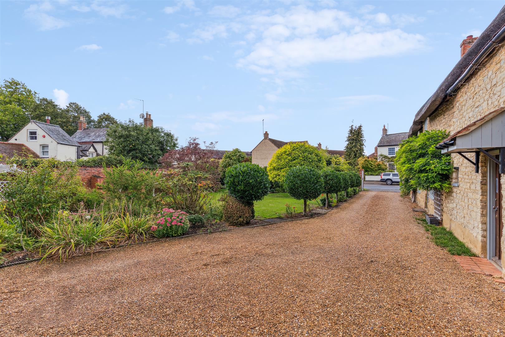 A five bar gate opens to a long driveway which could easily park around 5 cars and leads to a double width garage. The walled gardens to the frontage are neatly landscaped with various well populated planting areas and a discreetly located small pond. Roses climb freely up the boundary wall and seating areas are scattered around the garden. A garden shed with an external power point and water tap stands alongside the garage.