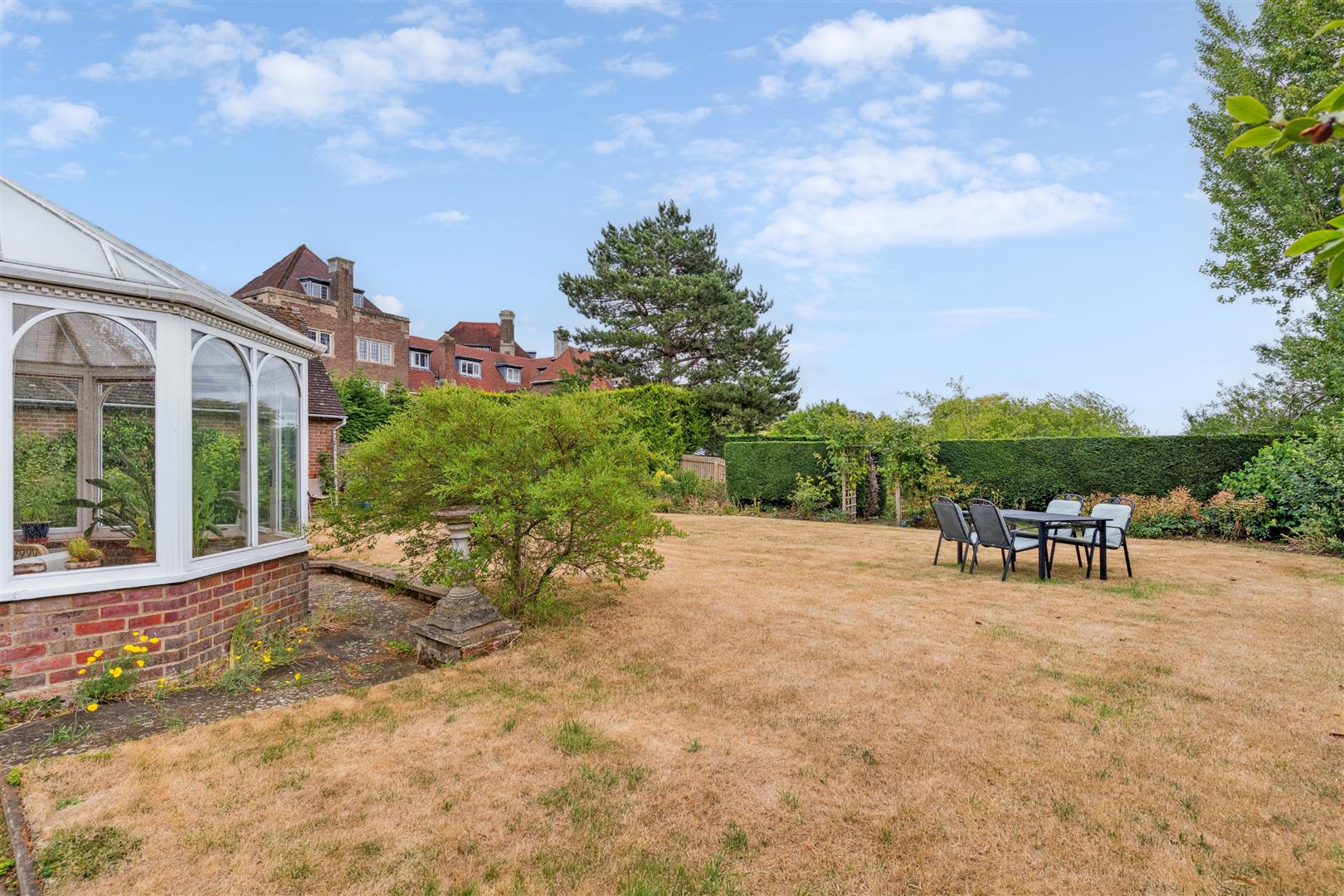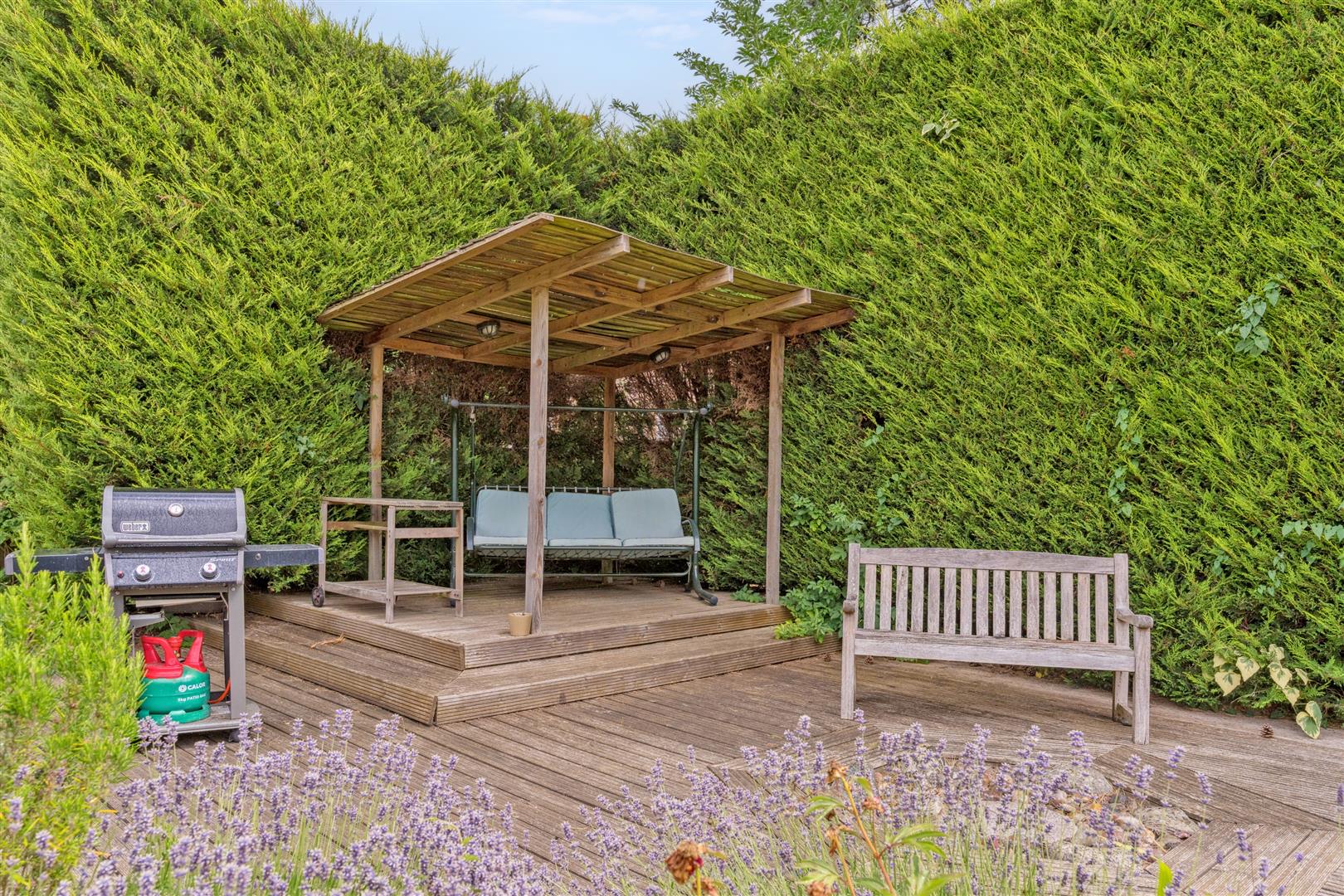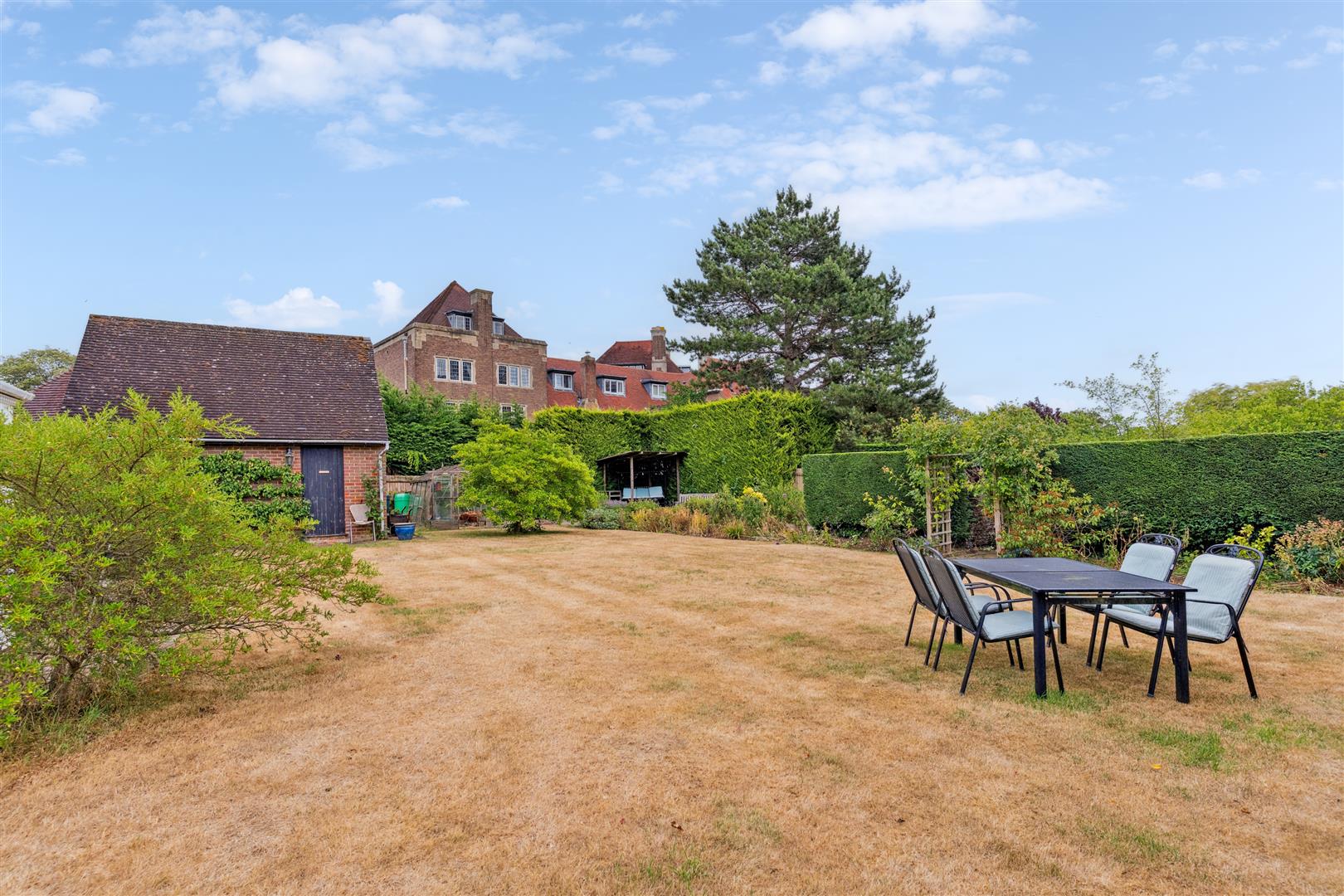 The garden is south facing and has a pathway down to a lawn area bordered by flowers and fruit beds. Two wisterias cloak the side of the building and an espaliered Conference Pear tree clings to the side of the double garage. A Magnolia Stellata features prominently in the garden. Additional features are a pergola over raised decking and various seating areas.