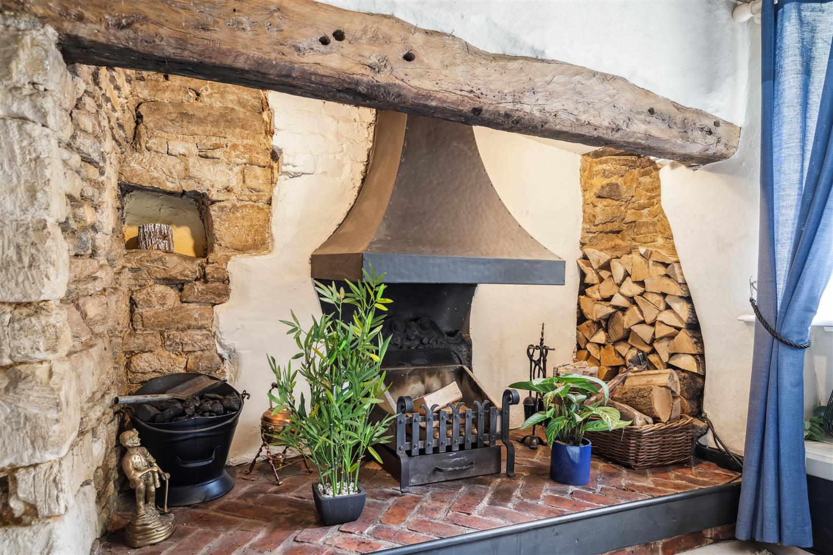 Solid wooden door with high level glazed panels opens to a tiled entrance hall. The cottage will predate this flooring which was probably laid in Victorian times. A doorway opens to a well proportioned dining room having an open fireplace with wood mantle over and paved hearth. This is centrally located to one wall. There is a sash window to the front elevation, flooring is in natural wood and exposed beams are evident. An archway leads to an inner lobby area which is open to the sitting room and provides the staircase which rises to the first floor. The sitting room exhibits a most impressive inglenook fireplace with bressummer beam over. The inglenook has internal lighting, log storage space, smoke canopy and a herringbone patterned brick hearth. Exposed ceiling beams and timber uprights are much in evidence. Natural light comes from a south facing window. Adjacent to the sitting room is the kitchen with built in oven and bob. There is a good selection of high and base level cupboard units also a one and a half bowl ceramic sink unit. Plumbing is installed for a washing machine and a fitted wine rack is discreetly located to one wall. Stable doors open to a paved seating area.