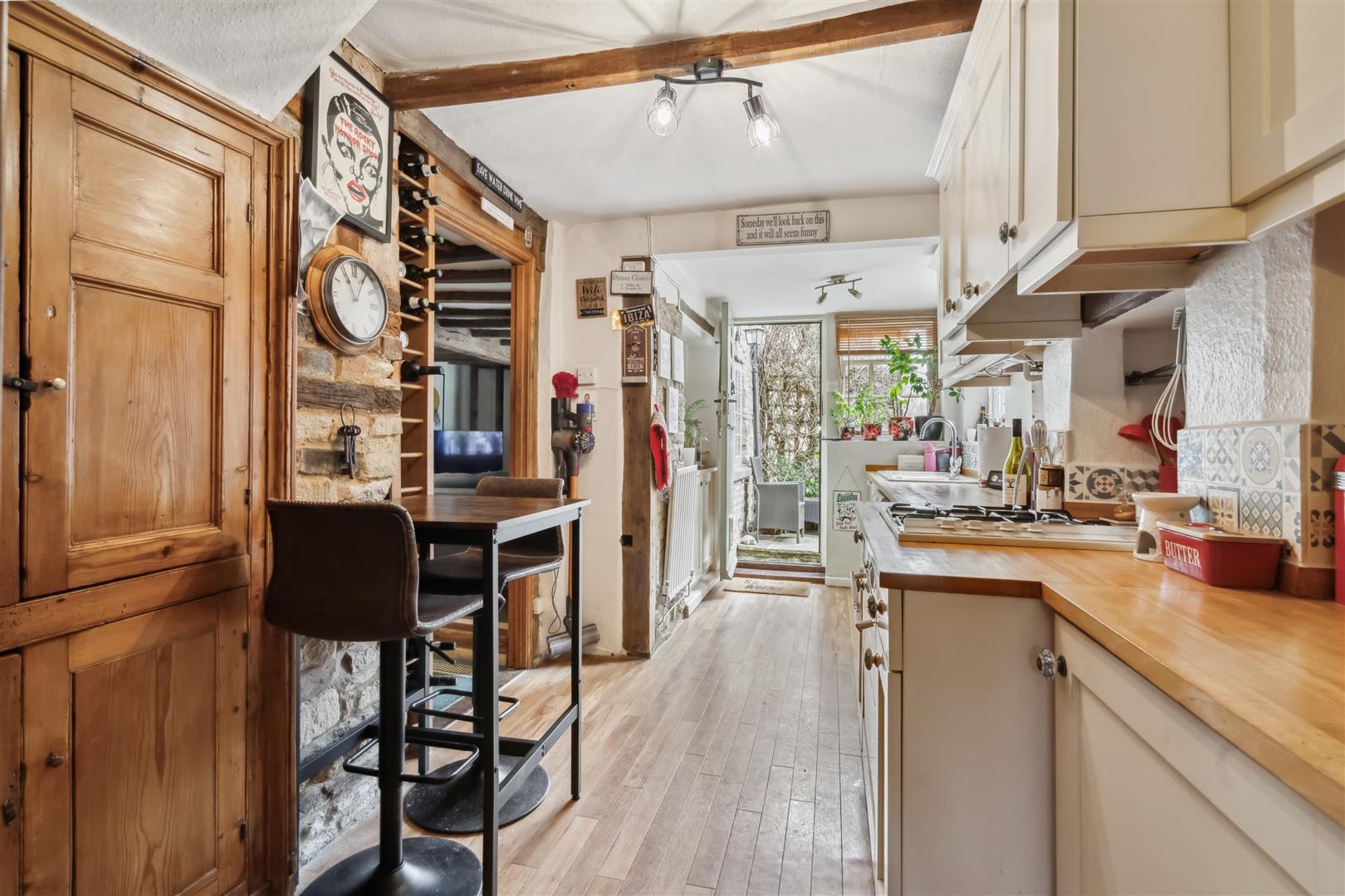 From the High Street there is an arched entrance with double wooden doors which open to a courtyard available only to the residents located within the private mews. This provides vehicular as well as pedestrian access. The Old Penny house has a pleasant seating area immediately behind the property and a few steps away through wooden gates is an enclosed private garden with a good size lawn and a pergola erected for al fresco dining. This area also provides a pea gravel base for parking.
