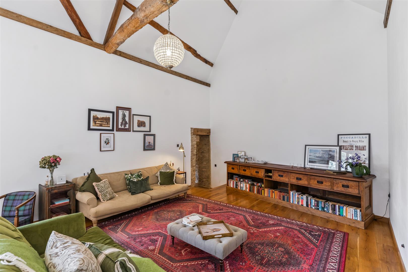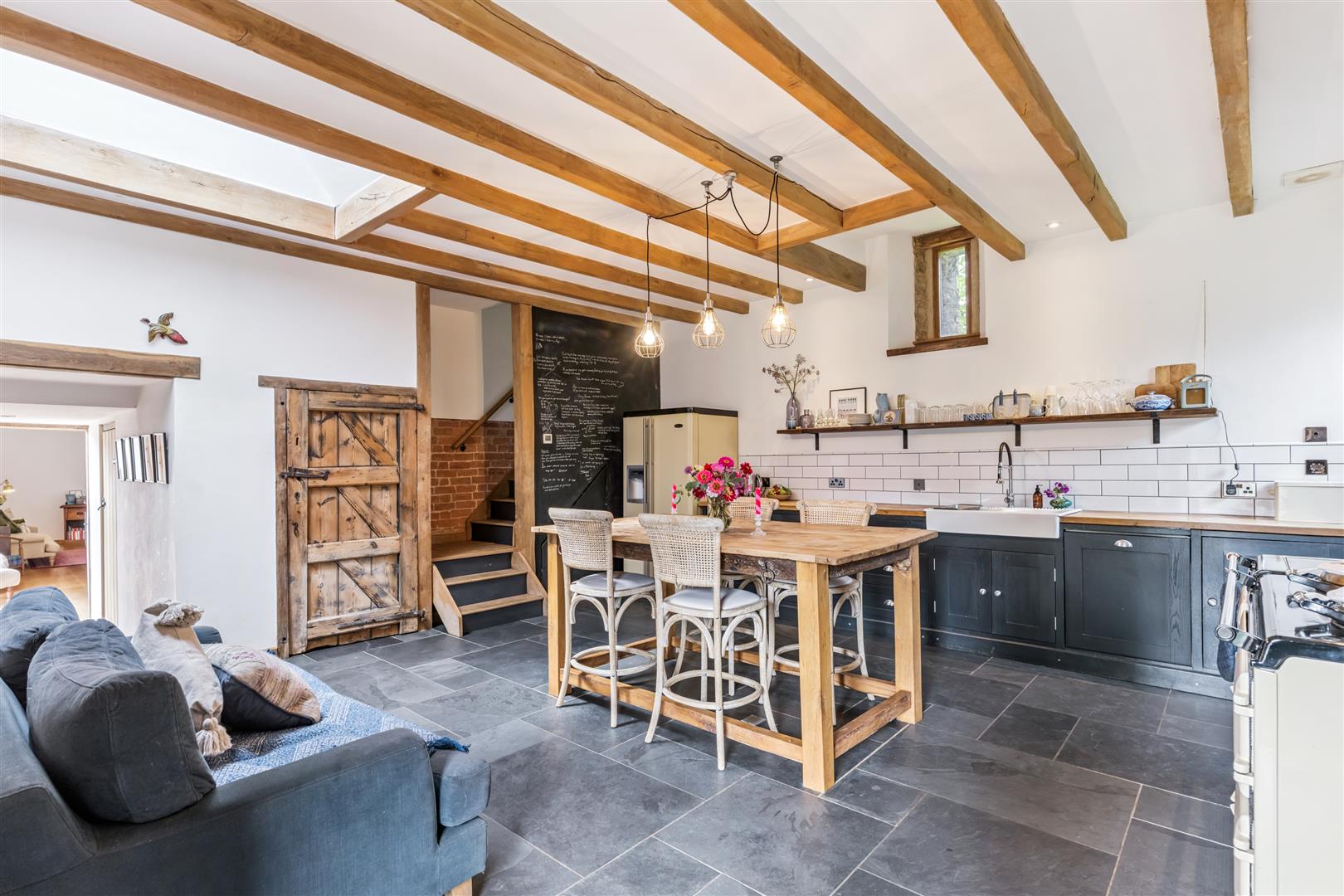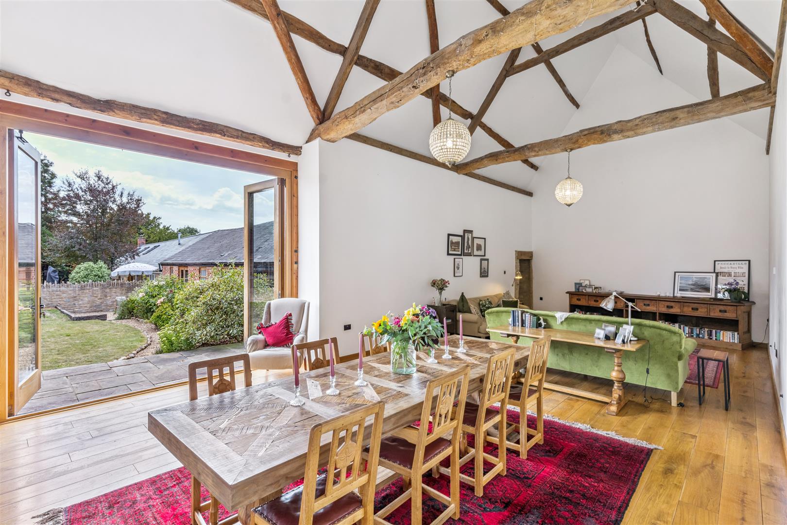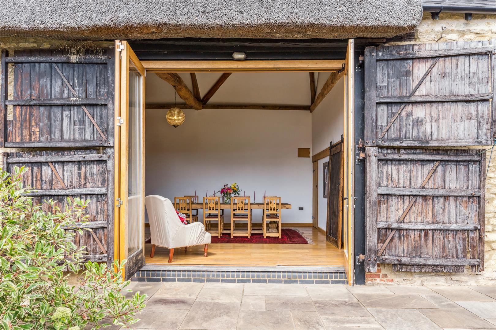 Leaving the kitchen/breakfast room, a hallway leads to the living areas and includes a useful large store room with exposed brickwork to one wall. Through an open doorway the capacious combined living and dining rooms stretch before you. The vaulted ceiling with its exposed timber "A" frames lends emphasis to the grandiose impression of space. Bi-fold doors open to the terrace and gardens, A pleasing period feature is the retention of a rustic interior hanging barn door with the mechanisms still intact. Flooring in this room is in engineered oak which continues around the rest of the ground floor which has underfloor heating installed. The heating is fuelled by LPG.